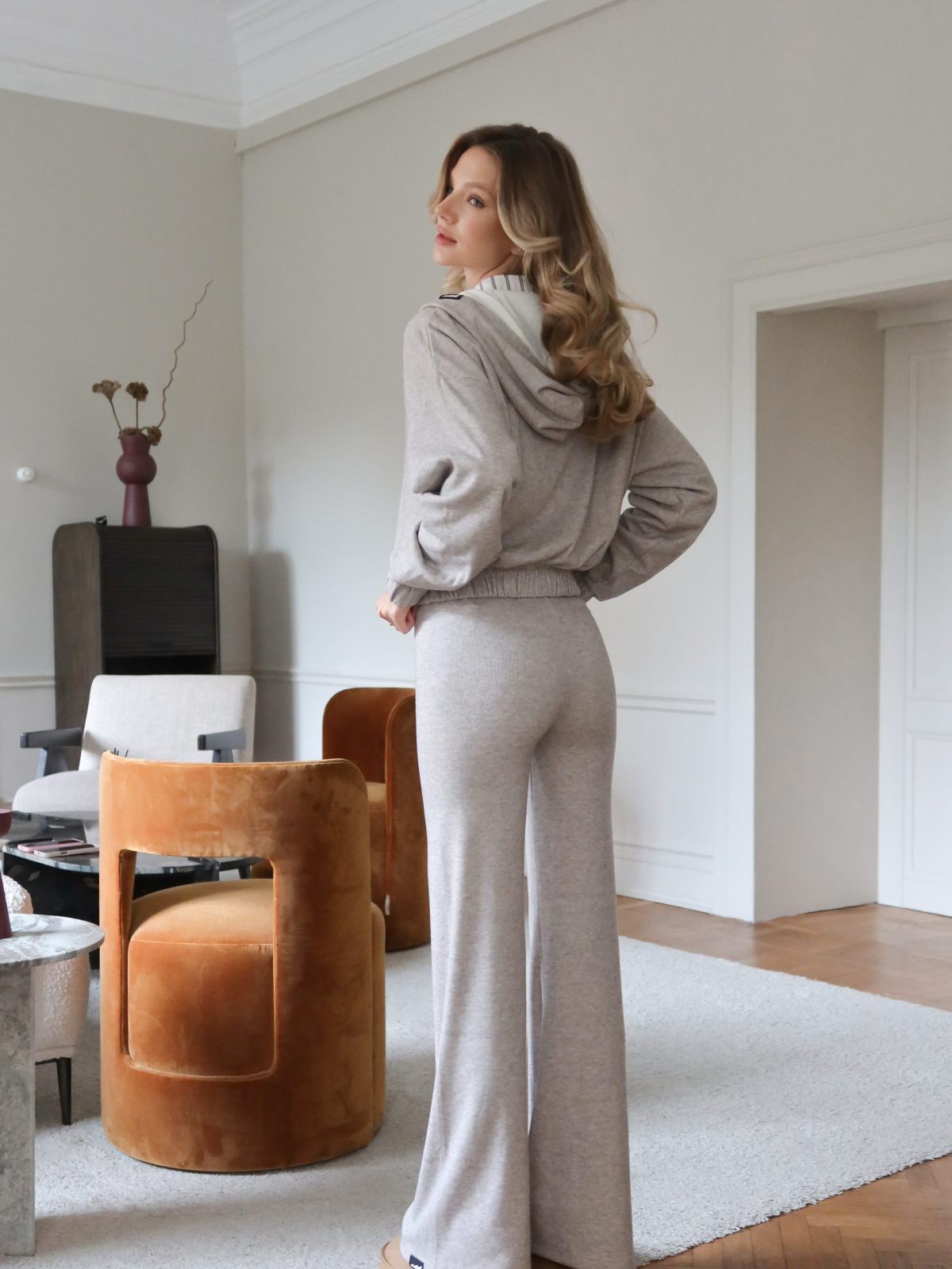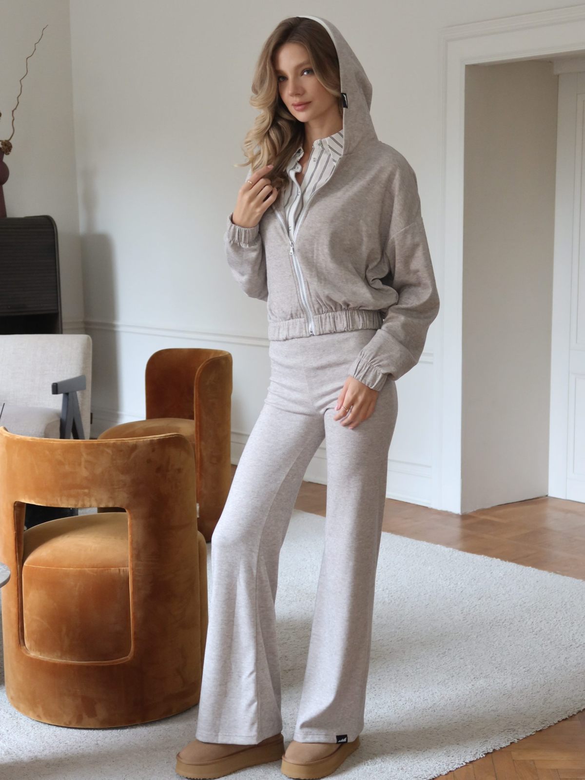 Расклешенные брюки с высокой посадкой выполнены из материала, в составе которого 67% полиэстера 25% вискозы и 8% эластана, за счет чего брюки невероятного мягкие и комфортные. На брюках внизу с левой стороны расположен лаконичный жаккардовый флажок с логотипом бренда. Брюки представлены в двух классических цветах: серый и бежевый меланж. Комплектом к брюкам в ассортименте имеется худи W5HOM34. Отличный выбор для комфортного образа в спортивном стиле на каждый день.