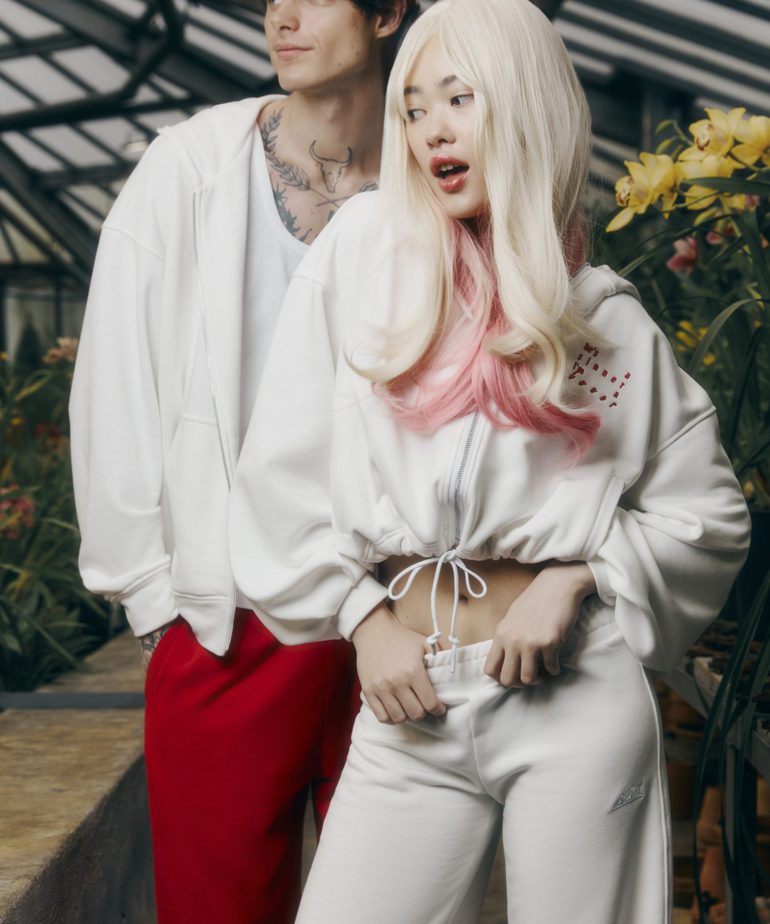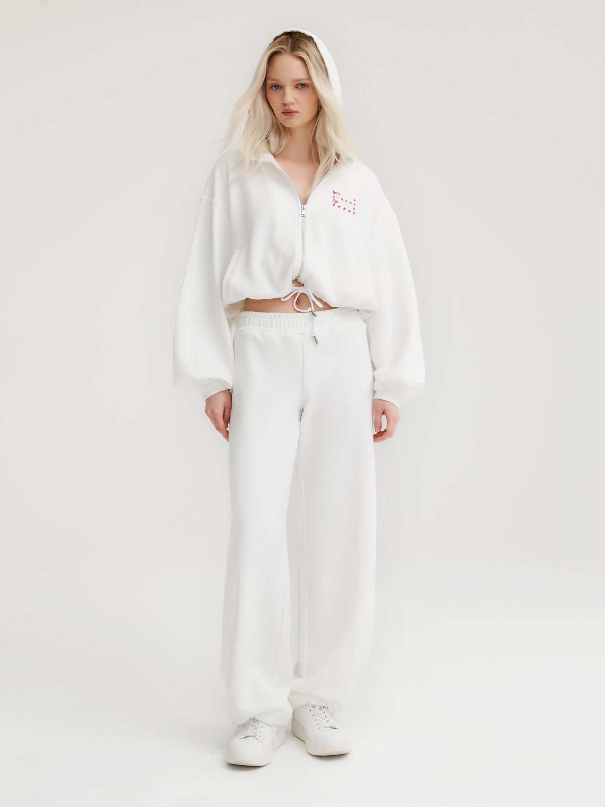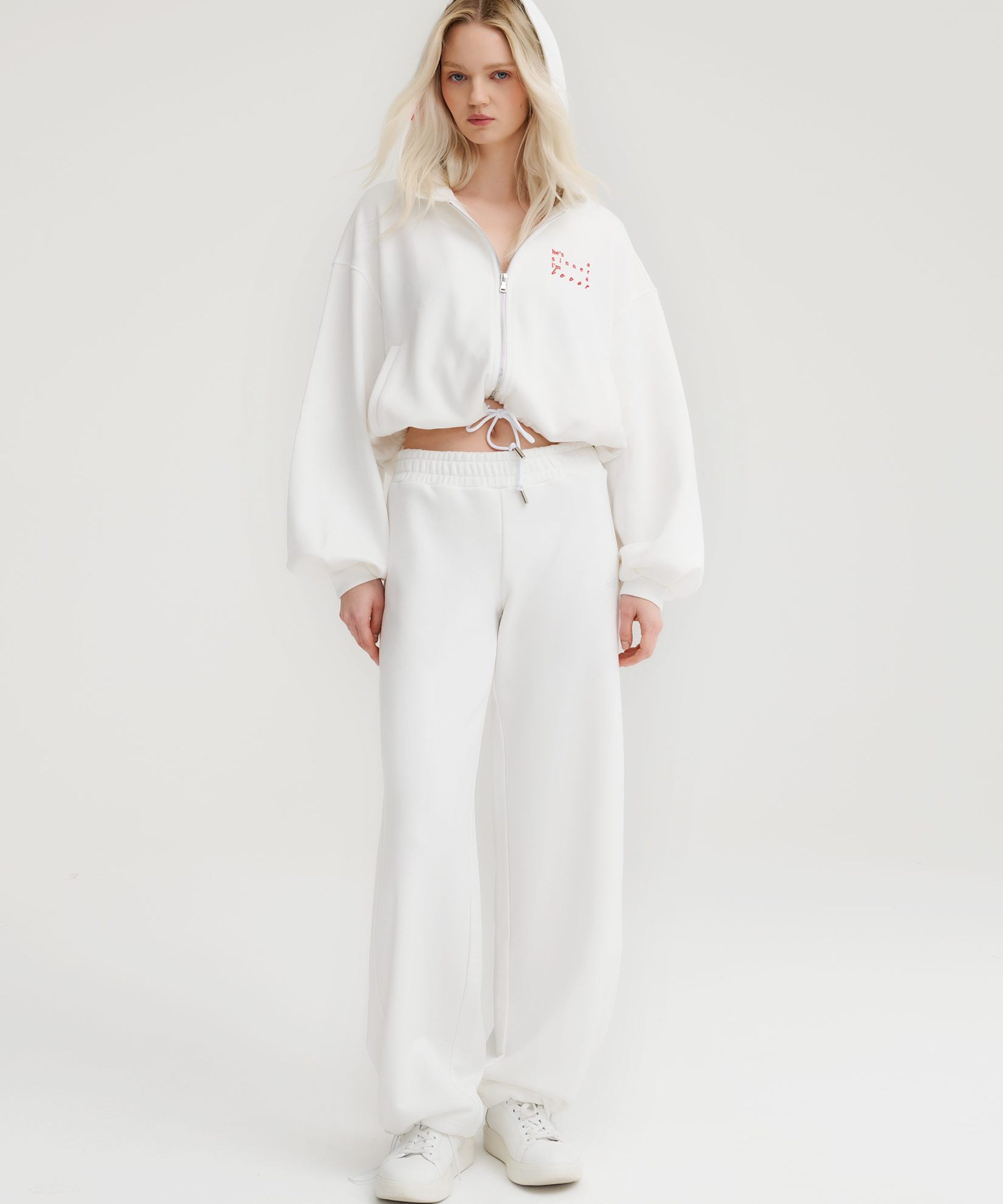 Корд-система внизу позволит вам регулировать посадку брюк, интересный крой и свободный силуэт помогут создать романтичный игривый образ в спортивном стиле. На левой ноге расположена тональная вышивка с логотипом бренда. В комплекте к брюкам в ассортименте представлен худи "Джек" W2VD34-ECR.