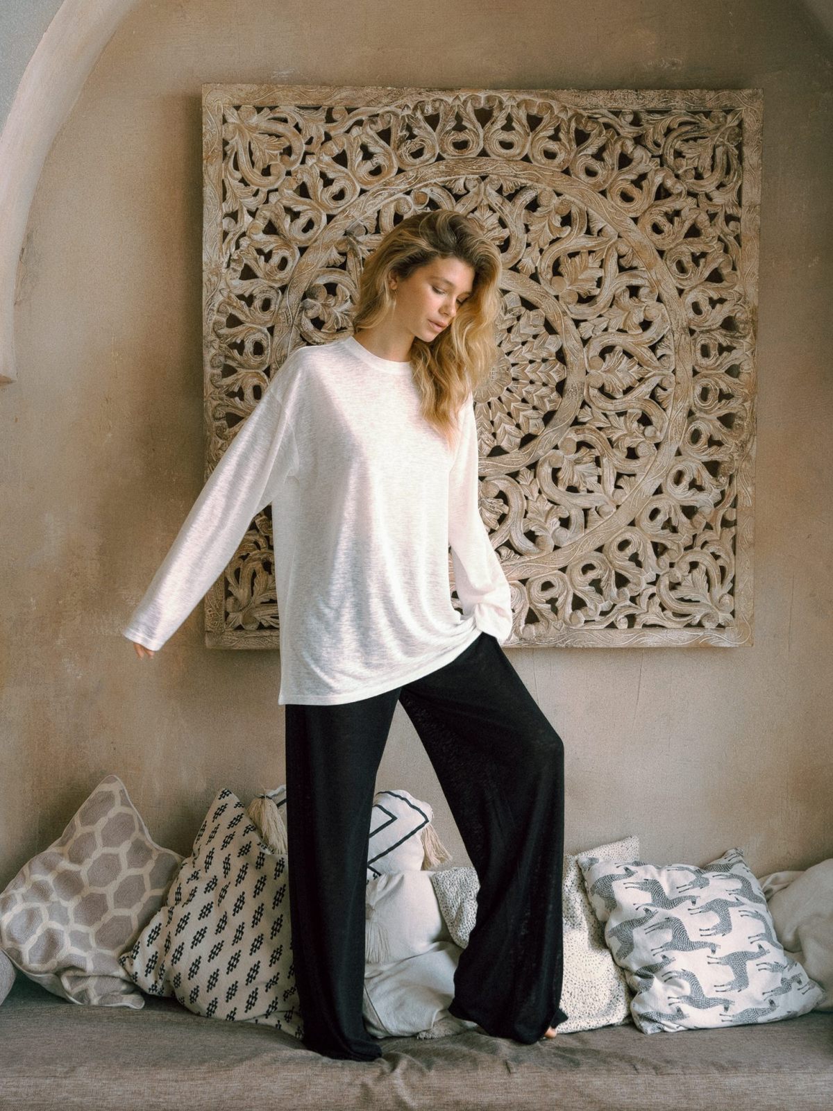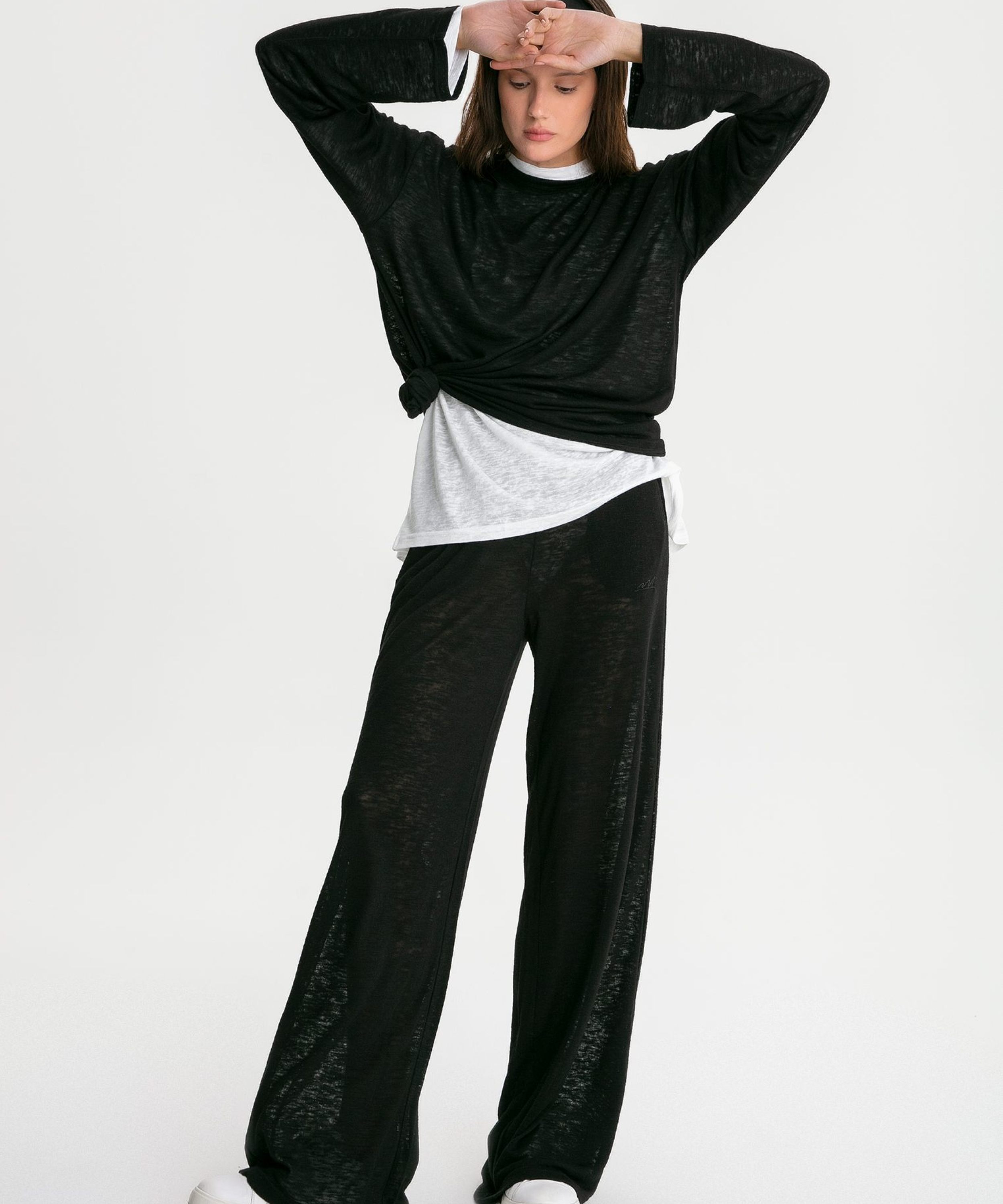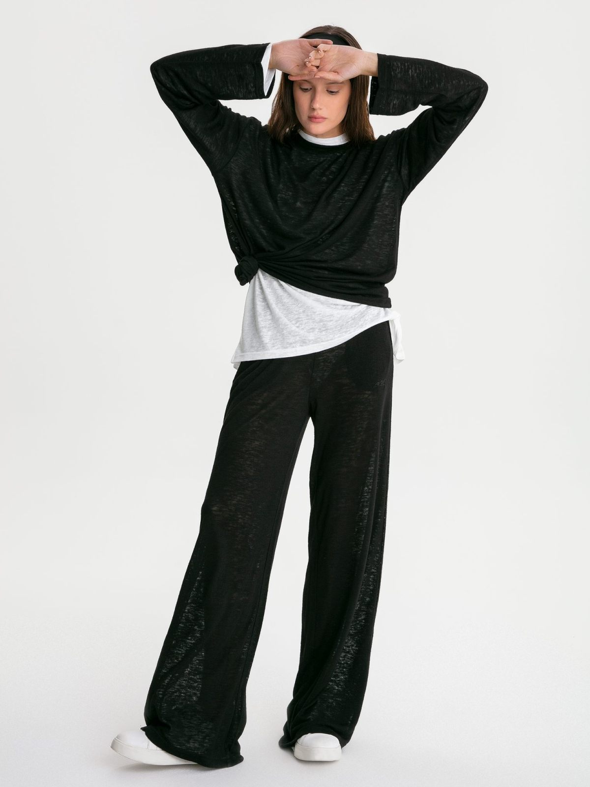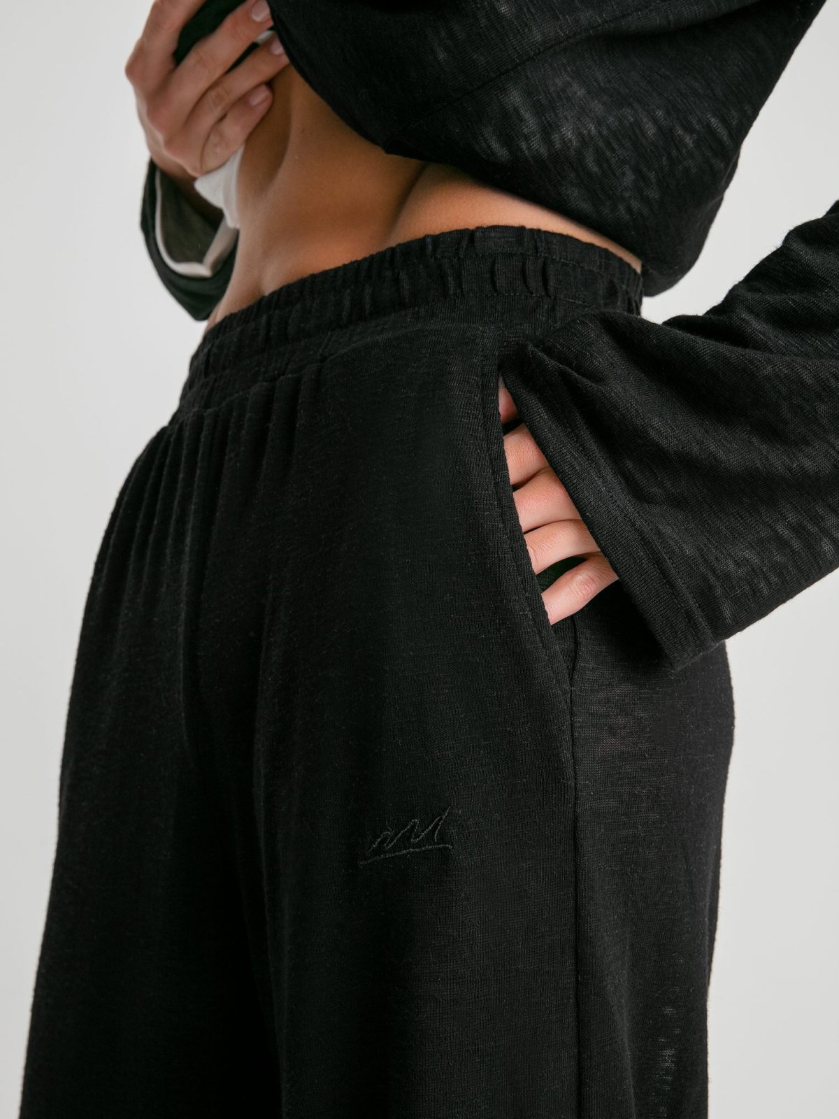 Женские широкие полупрозрачные брюки из коллекции Softwear выполнены из материала, в составе которого 65% вискозы 35% полиэстра. Брюки невероятно комфортные и приятные к телу. Легкий струящийся материал отлично подойдет на жаркую летнюю погоду. Эластичный пояс на резинке обеспечивает отличную посадку. Брюки имеют два боковых кармана. На левой ноге расположена тональная вышивка с логотипом бренда. В ассортименте к брюкам представлен лонгслив W4SFW411-BLK. Комплект отлично подходит для пляжных и повседневных летних образов.