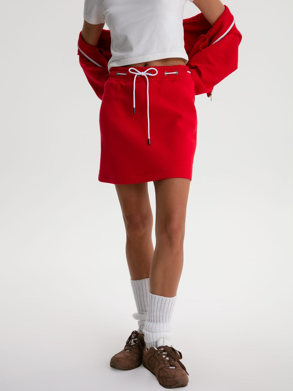 Укороченная юбка из коллекции Pure выполнена из материала скуба, в состав которого входит 82% хлопка, 12% полиэстера, 6% эластана, за счет чего юбка отлично держит форму и долговечная в носке. Благодаря большой доле хлопка в изделии, данная скуба является гипоаллергенной. Ключевым элементом модели является контрасный шнурок в поясе, который не только регулирует посадку, но и является интересной декоративной деталью. Слева расположена контрастная вышивка с логотипом бренда. В ассортименте к юбке представлен джемпер W4PR31-RED и худи W4PR34-RED. Трендовый яркий костюм на лето.