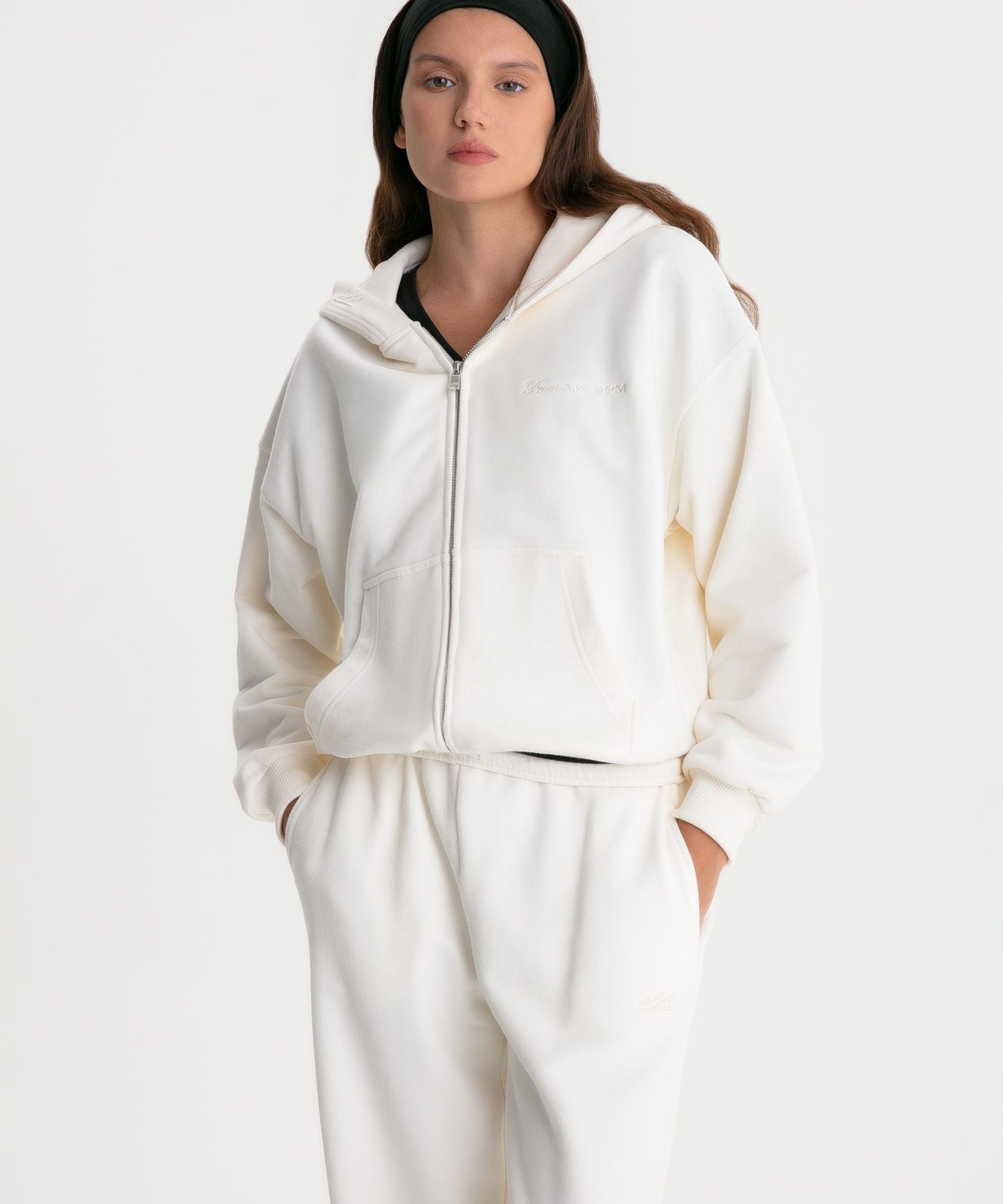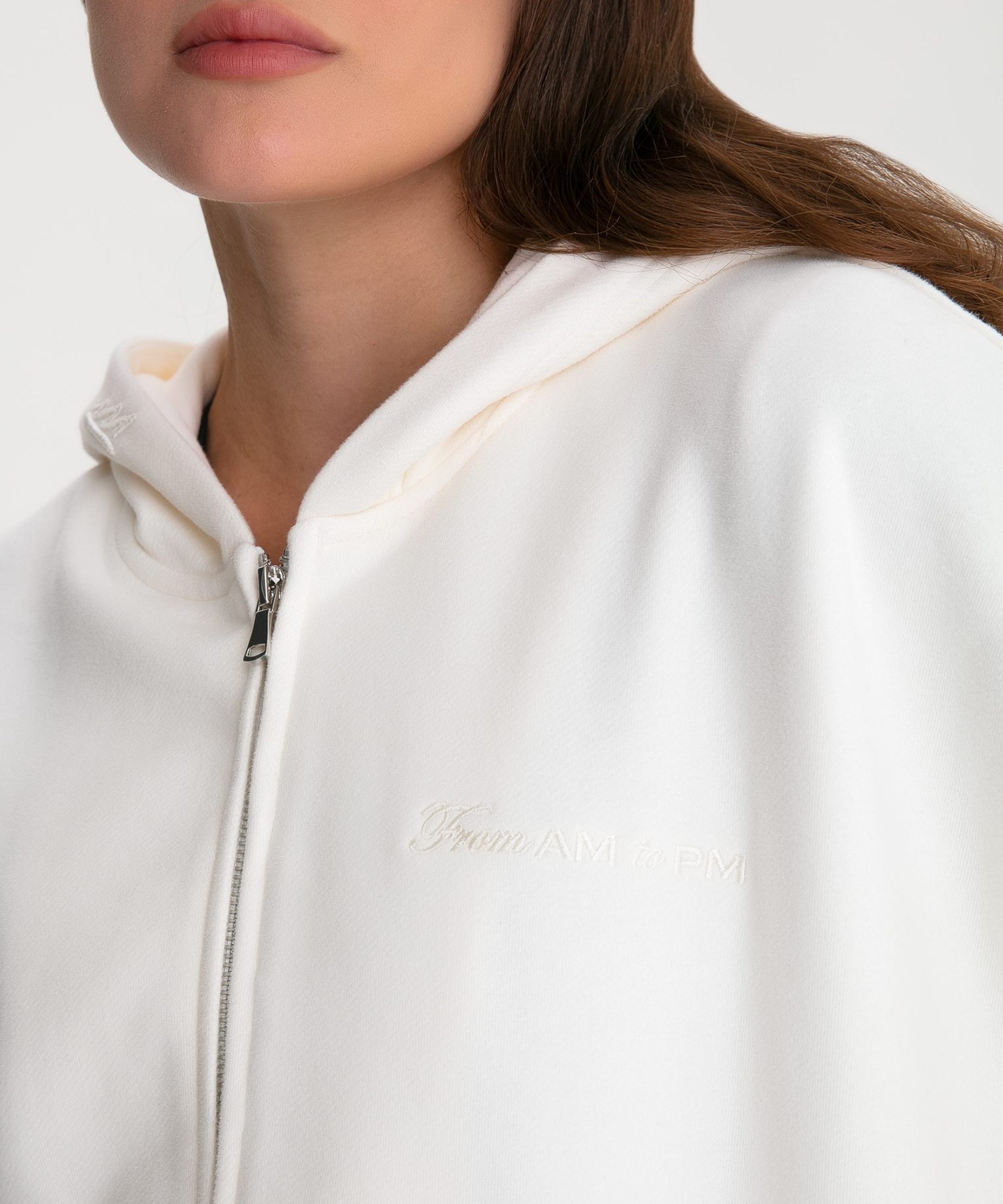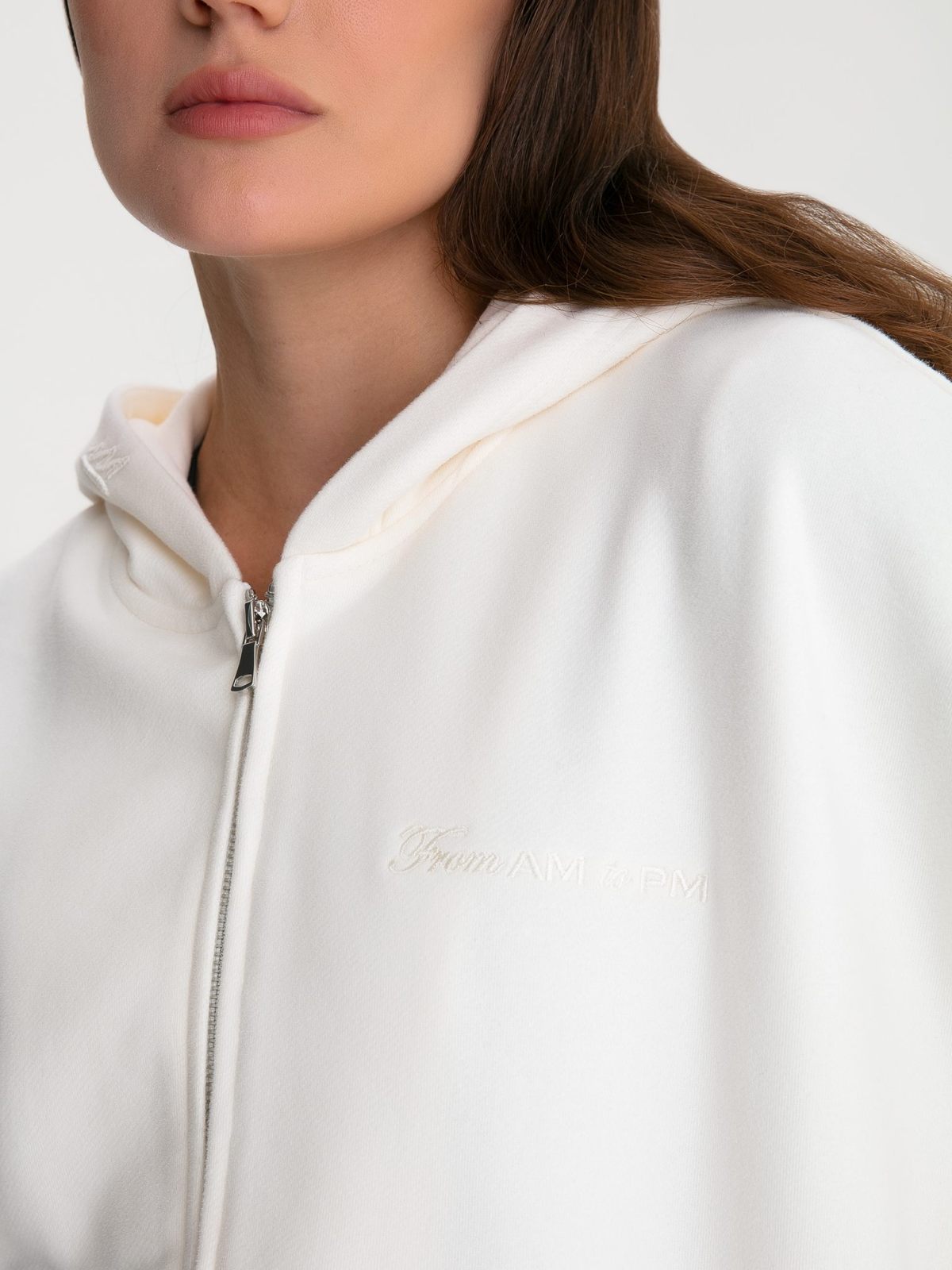 Худи "Ева" на молнии свободного кроя из коллекции Classic выполнено из материала с эффектом peach, в состав которого входит 90% хлопка 10% полиэстра, за счет чего худи отлично держит форму и долговечно в носке. Материал невероятно мягкий и приятный на ощупь. Худи имеет два боковых кармана, вышивку с логотипом бренда на капюшоне и вышивку со слоганом коллекции "From AM to PM" на груди слева. В ассортименте к худи представлены брюки "Ева" W5CLP83-ECR. Уютный мягкий костюм на прохладную летнюю погоду. |