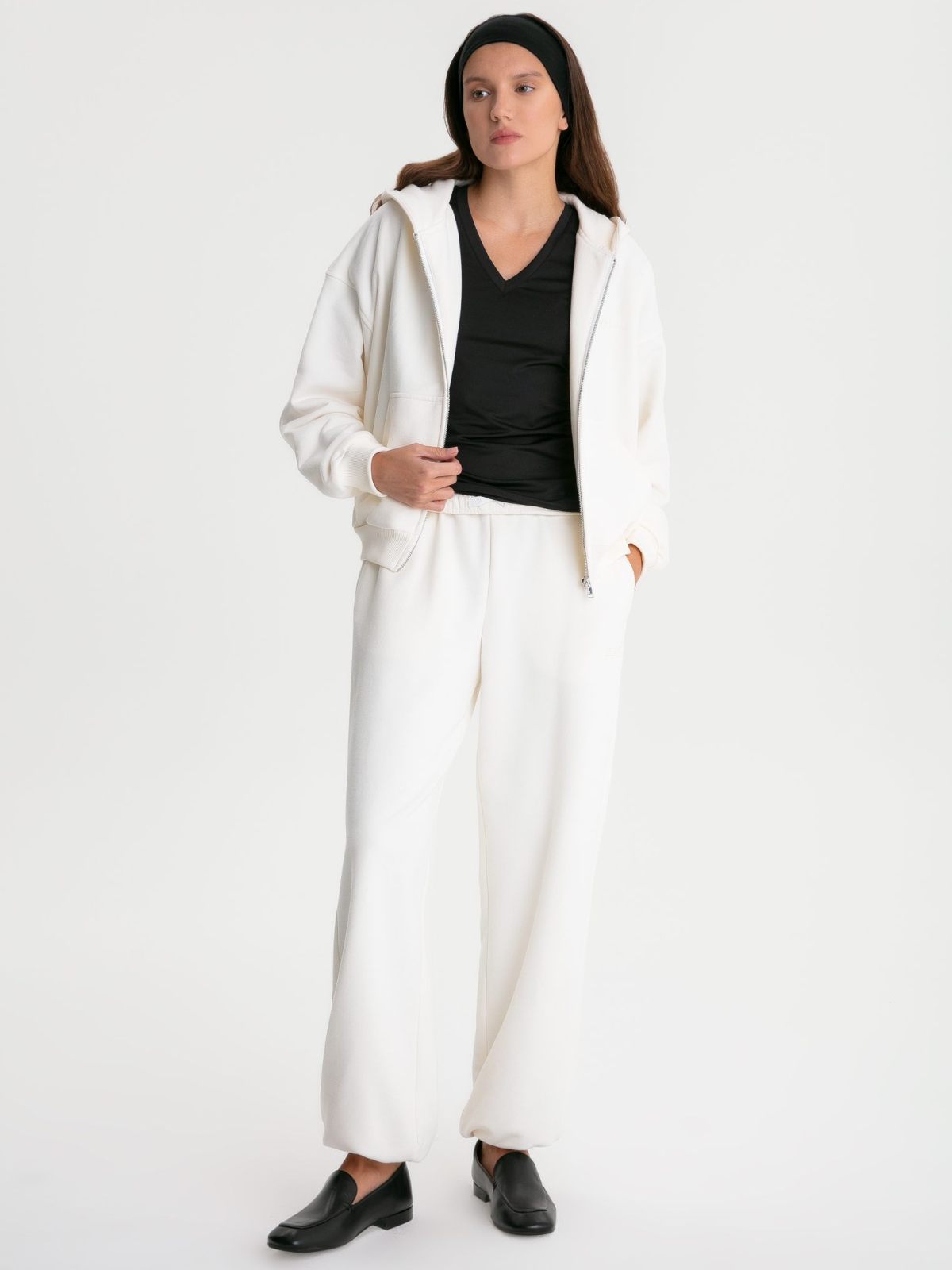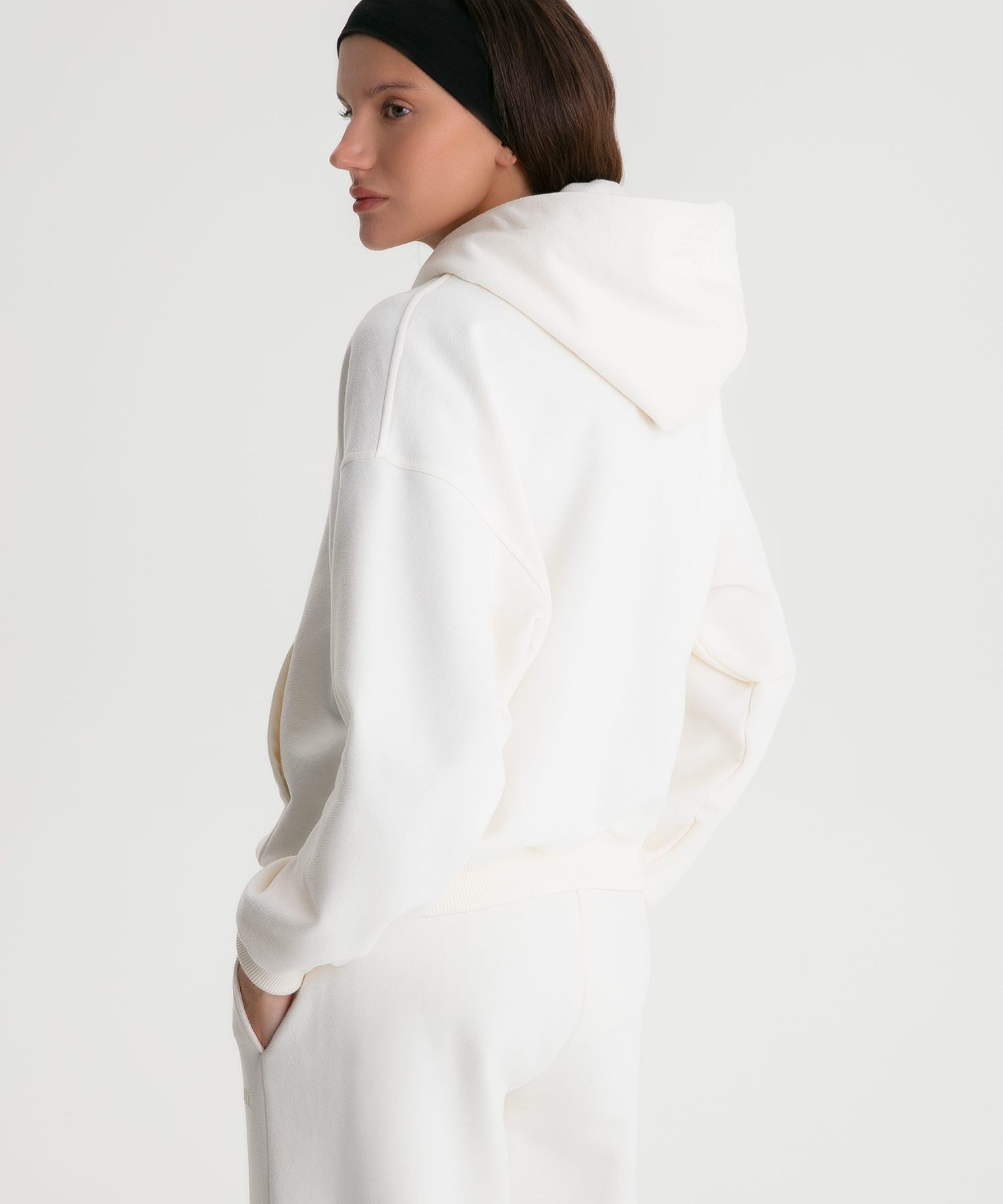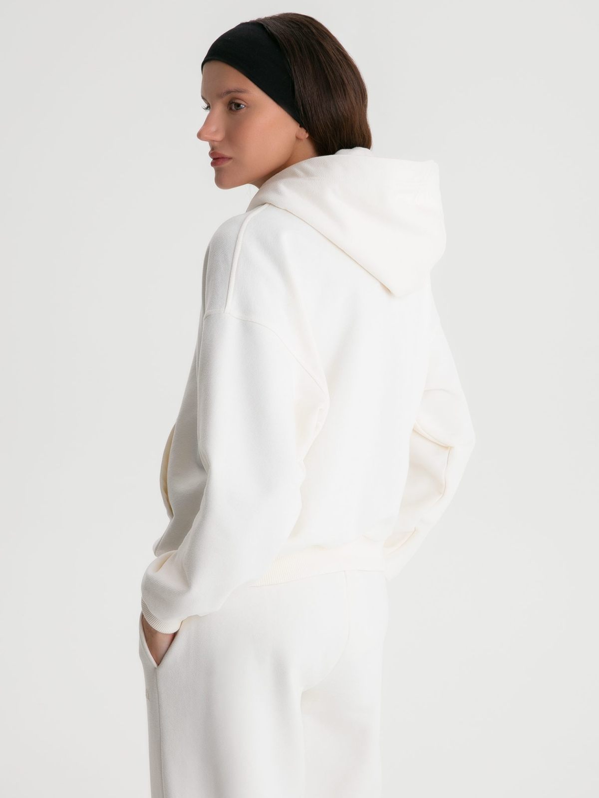 Худи "Ева" на молнии свободного кроя из коллекции Classic выполнено из материала с эффектом peach, в состав которого входит 90% хлопка 10% полиэстра, за счет чего худи отлично держит форму и долговечно в носке. Материал невероятно мягкий и приятный на ощупь. Худи имеет два боковых кармана, вышивку с логотипом бренда на капюшоне и вышивку со слоганом коллекции "From AM to PM" на груди слева. В ассортименте к худи представлены брюки "Ева" W5CLP83-ECR. Уютный мягкий костюм на прохладную летнюю погоду. |
