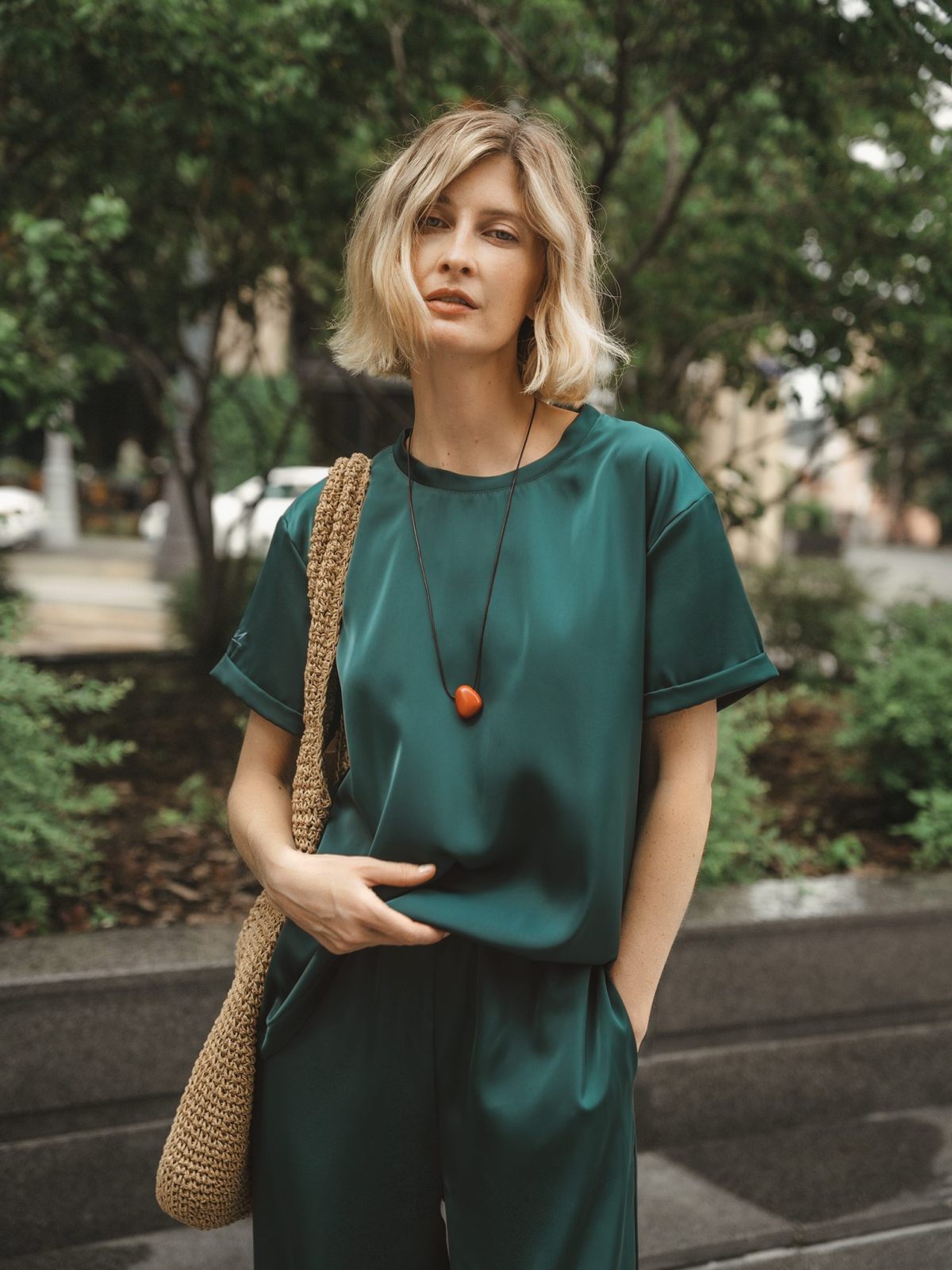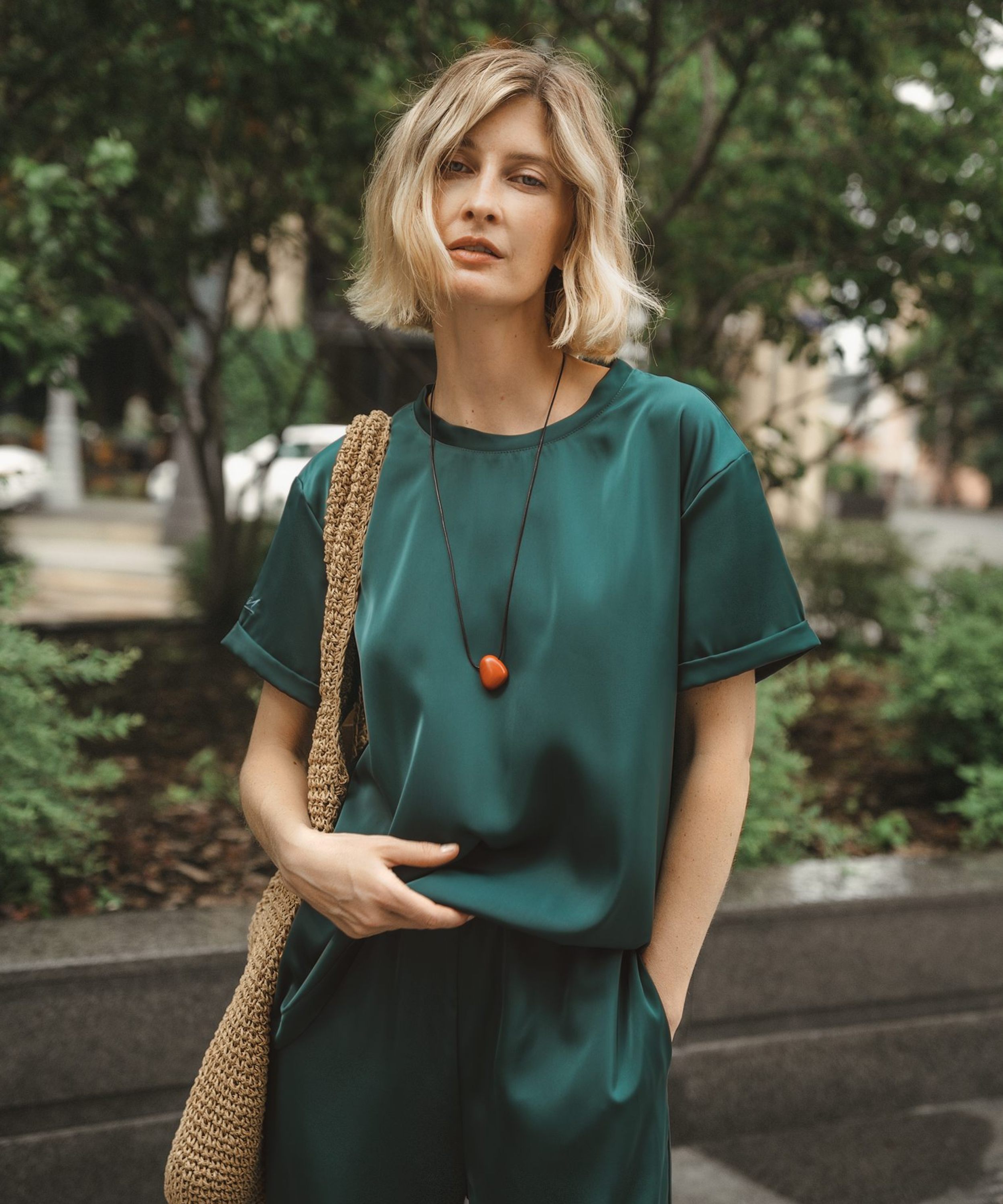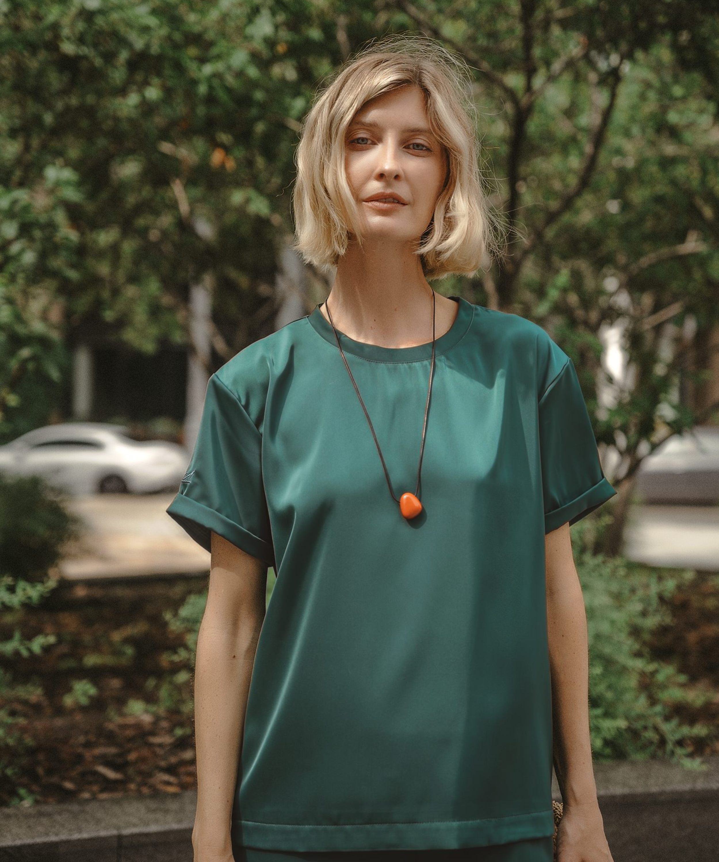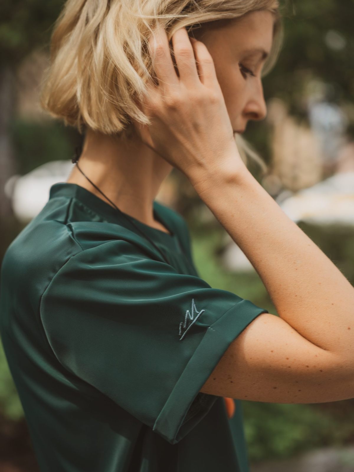 Легкая блузка с эффектом шелка из коллекции Gardenika. Материал очень приятный к телу и имеет эффект охлаждения. На правом рукаве расположена лаконичная тональная вышивка с логотипом бренда. К блузке в ассортименте представлены брюки W3GN84.