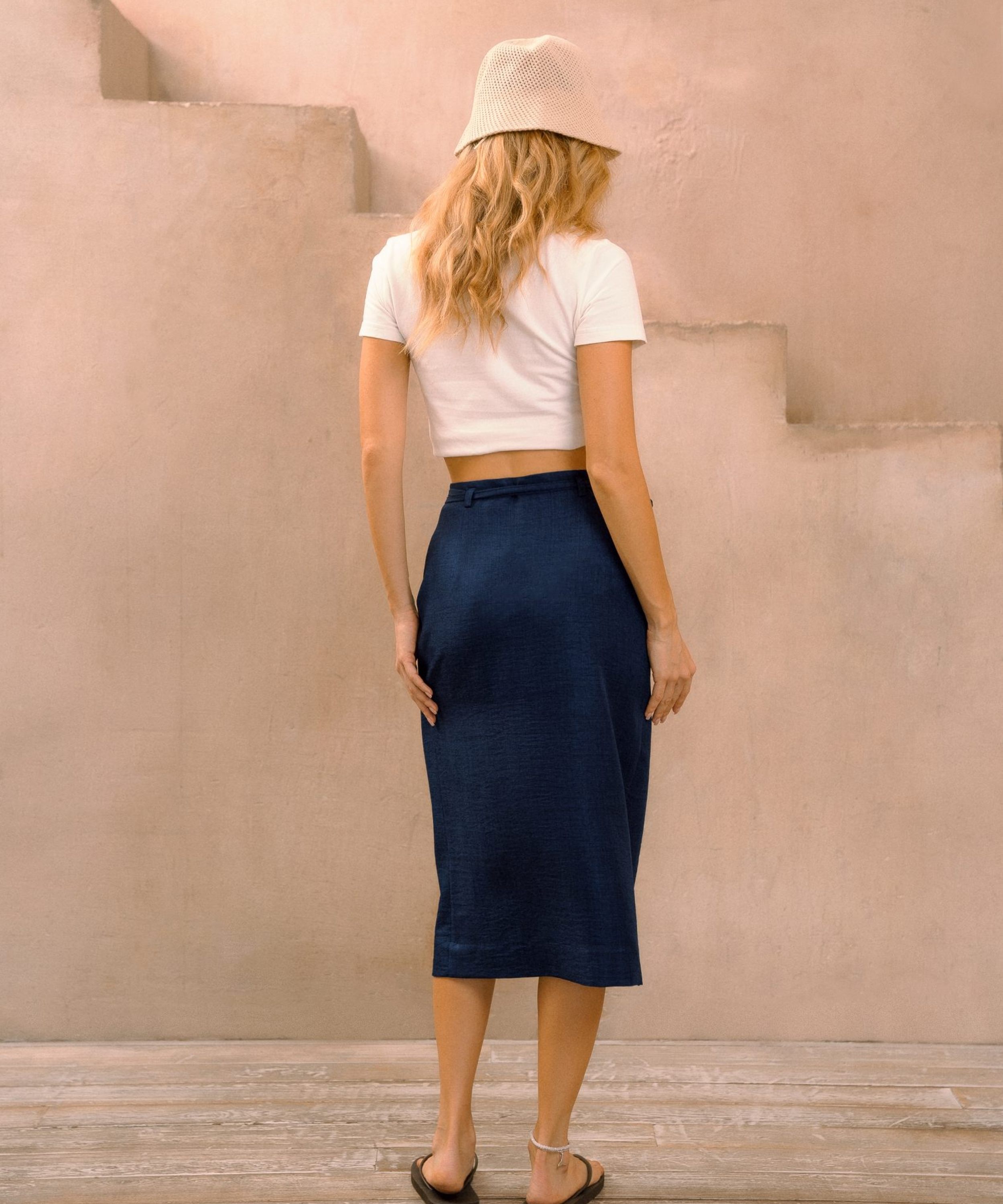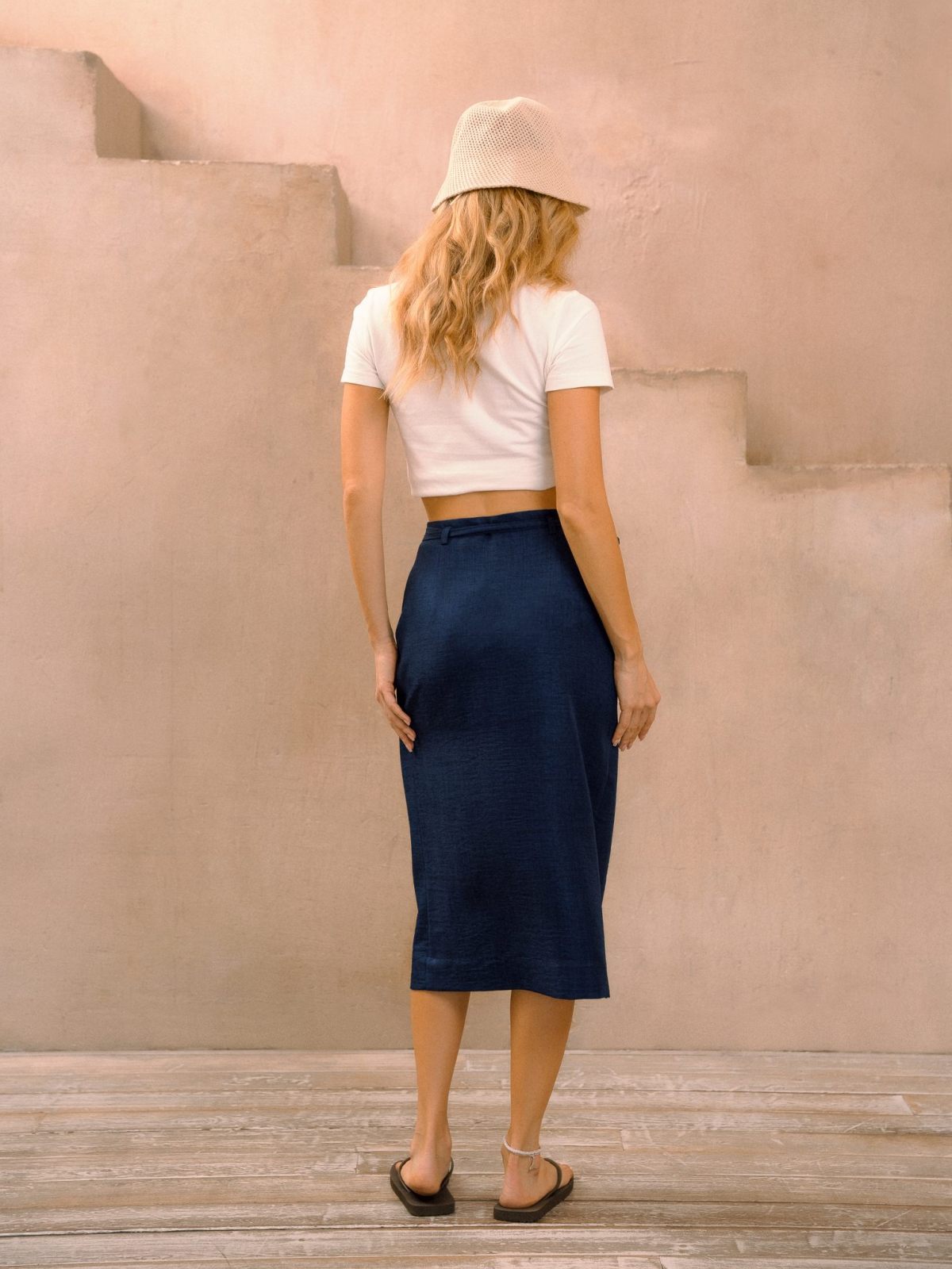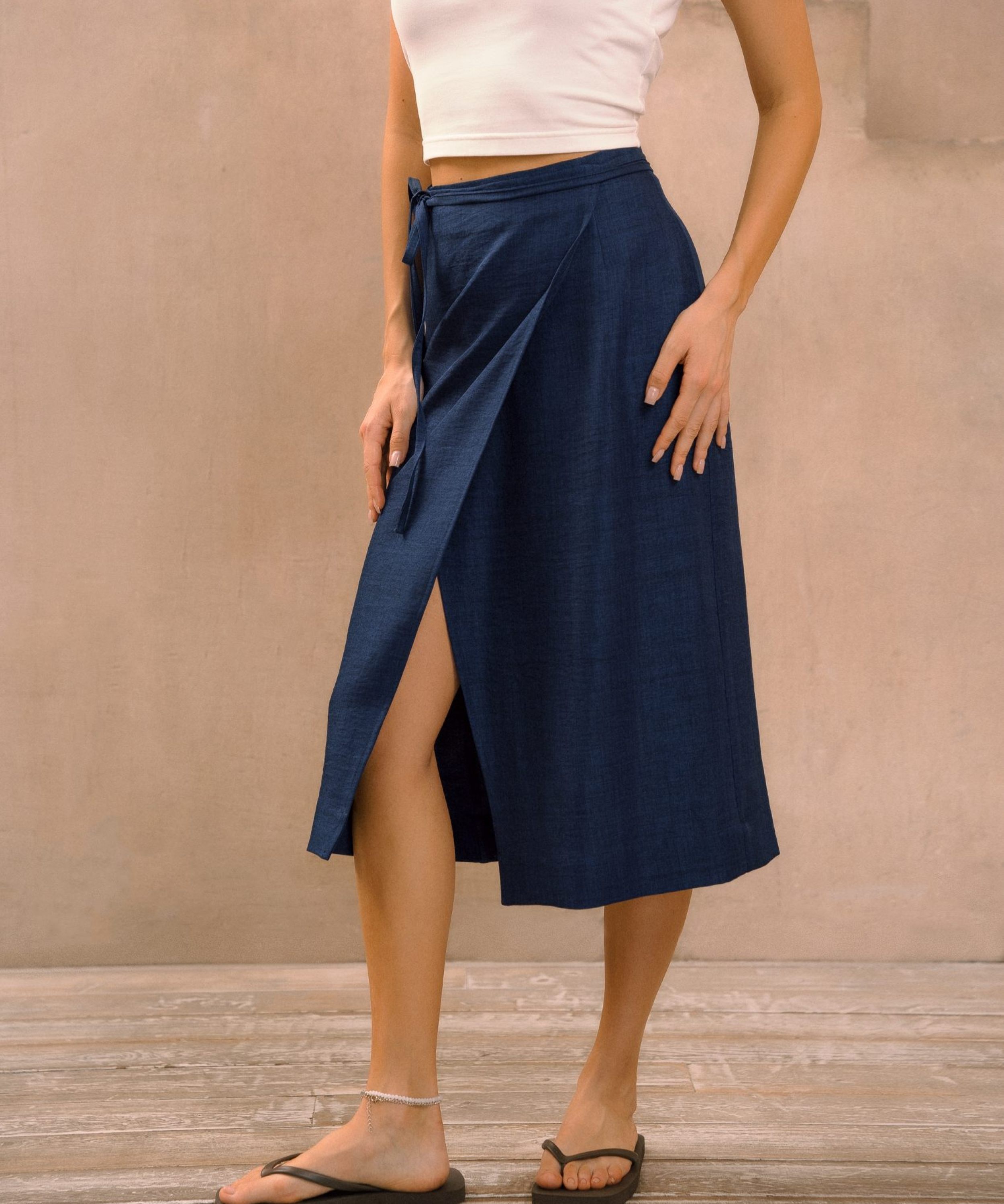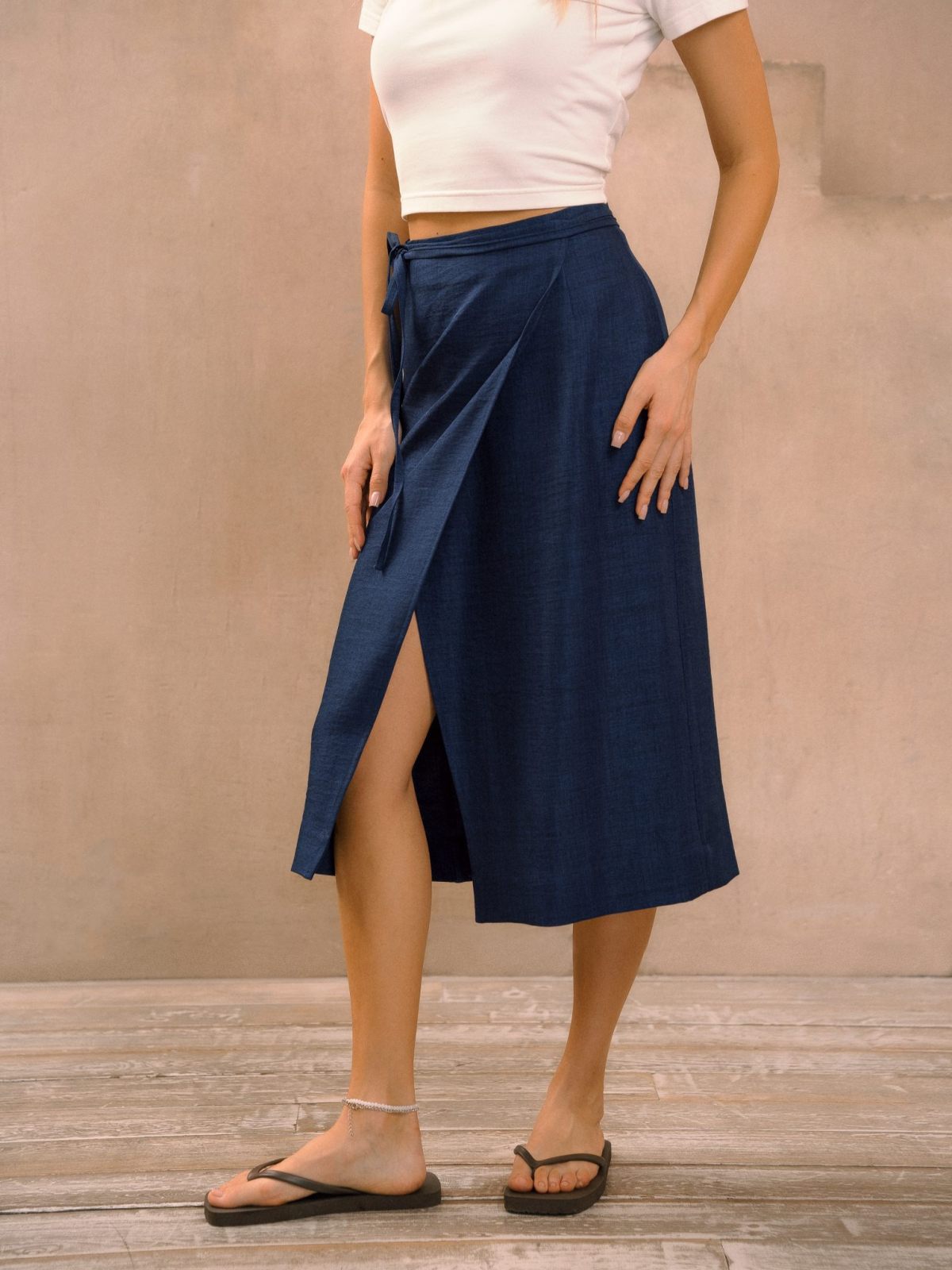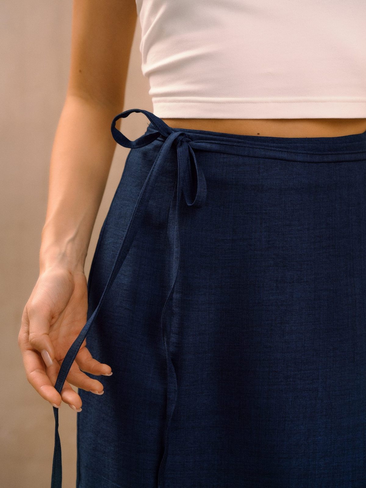 Юбка на запах "Лотос" из коллекции Gardenika выполнена из материала с эффектом льна в глубоком синем цвете. Длинные лямки, сделанные из основной ткани, позволяют подвязывать юбку разными способами вокруг талии. При ходьбе правая нога слегка выглядывает благодаря конструкции. Юбка отлично сочетается с любым белым верхом, будь то рубашка, топ или даже худи.