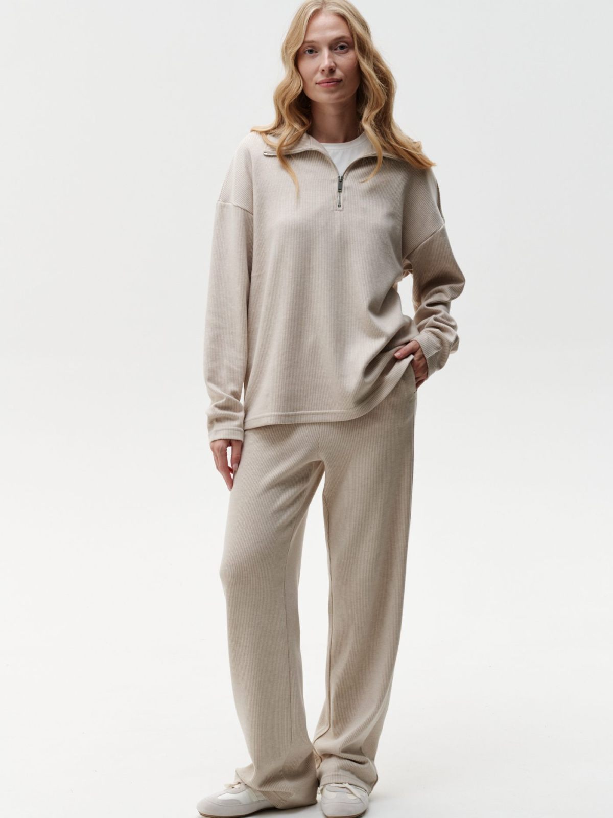Джемпер "Мария" свободного кроя с воротником-стойкой на молнии из коллекции Softwear выполнен из материала, в составе которого, преимущественно, вискоза и нейлон, за счет чего материал гладкий и приятный на ощупь, слегка тянется, но при этом выглядит фактурно. Расслабленный силуэт, спущенное плечо, пастельный нежный цвет полностью отражают эстетику коллекции Softwear. На левом рукаве расположена тональная вышивка с логотипом бренда. К джемперу в ассортименте представлены широкие брюки "Мария" 2W4SW84E1 и велосипедки 2W4SW93W. Невероятно комфортный, мягкий и стильный костюм на каждый день. Важно: материал имеет низкую пиллингуемость, но частое соприкосновение с аксессуарами может привести к образованию пилли.