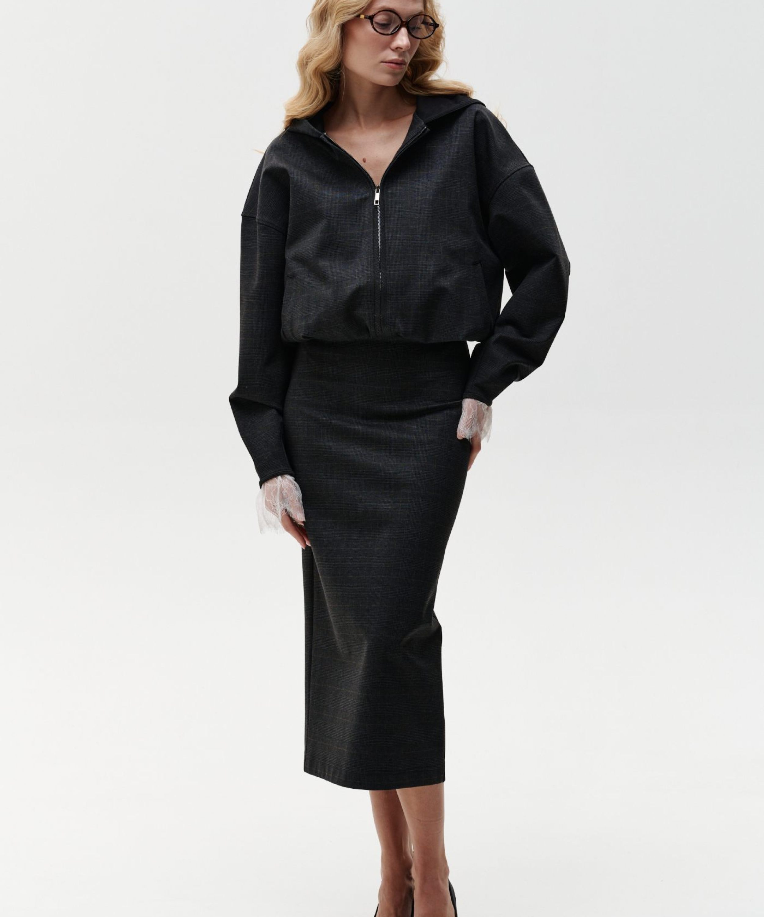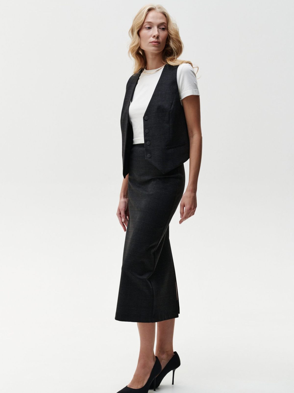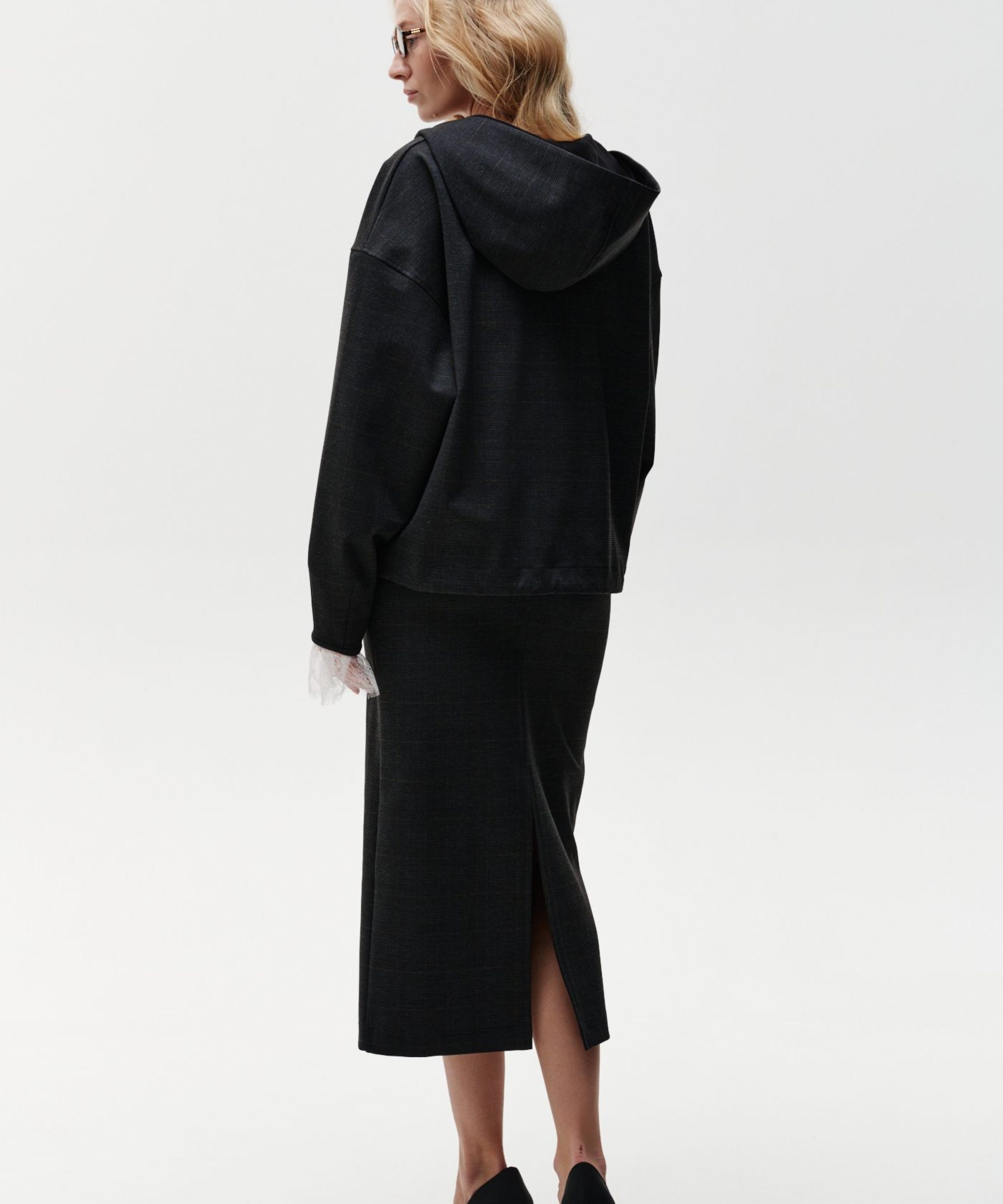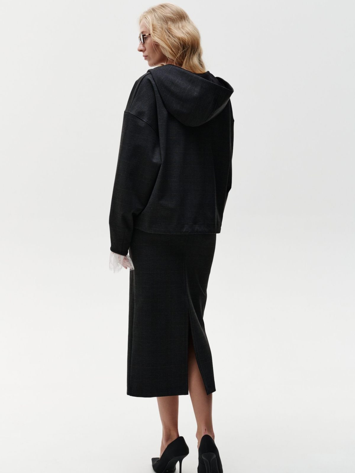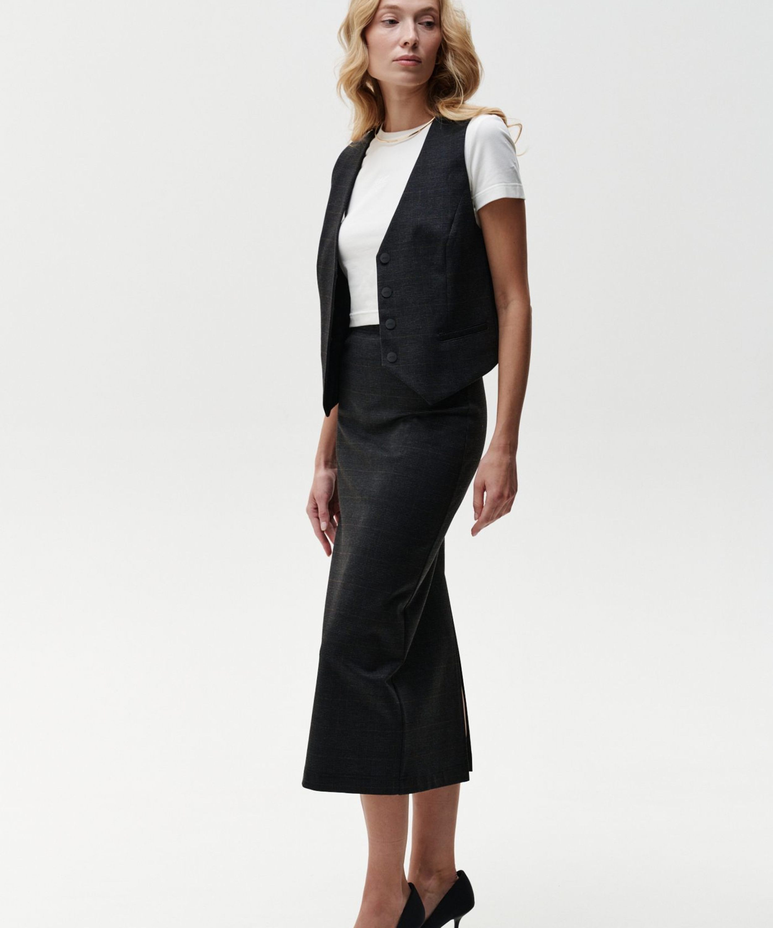 Удлиненная юбка-карандаш "Моника" из коллекции Office Core в трендовой приглушенной клетке. Материал - джерси, приятный на ощупь, гладкий, прочный и структурный, отлично держит форму. Пояс на резинке. Сзади имеется лаконичный разрез, что добавляет комфорта при ходьбе. Данная модель относится к костюму тройке "Моника", в который так же входят худи 2W3OC34E1-15MLT69 и жилетка 1W2OC21W-15MLT69. Костюм одинаково хорош как для офиса, так и для повседневной носки.