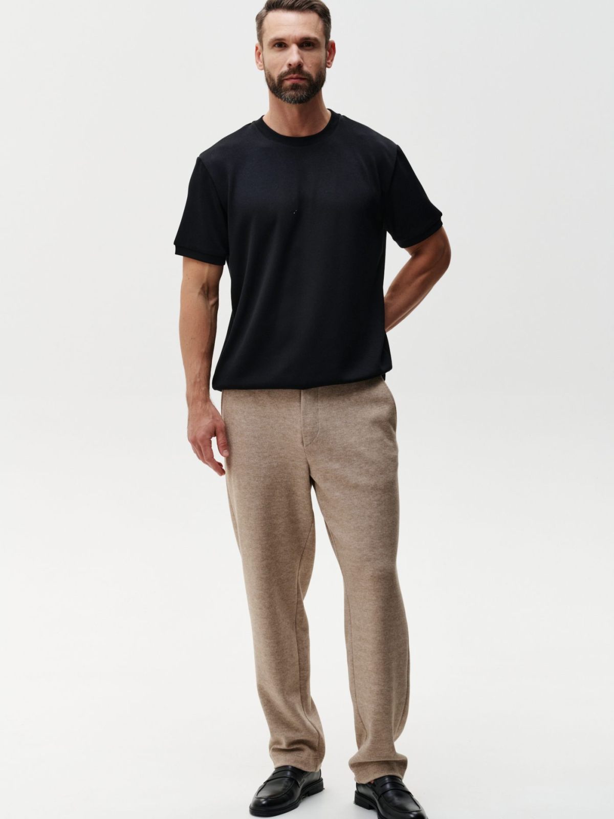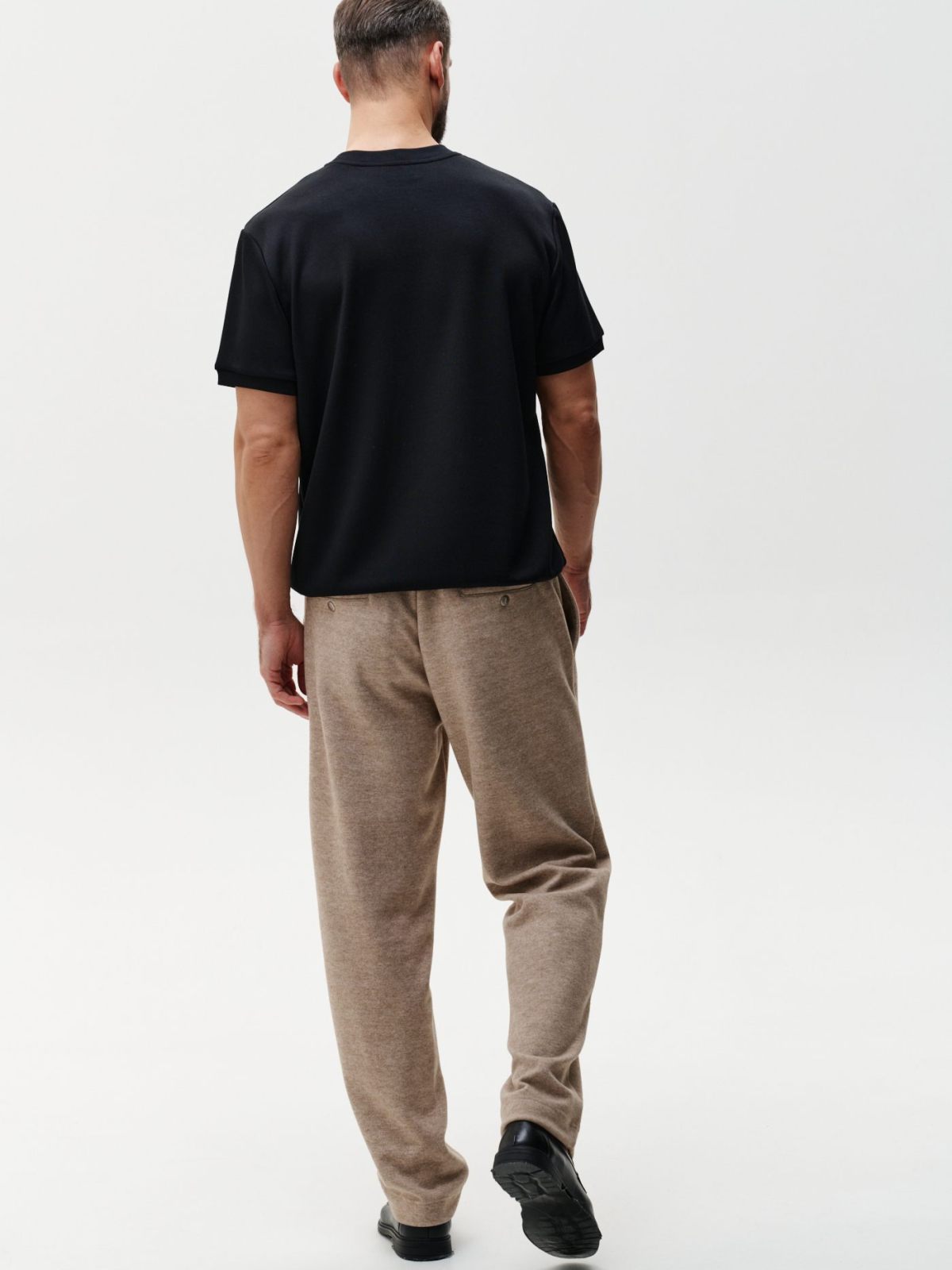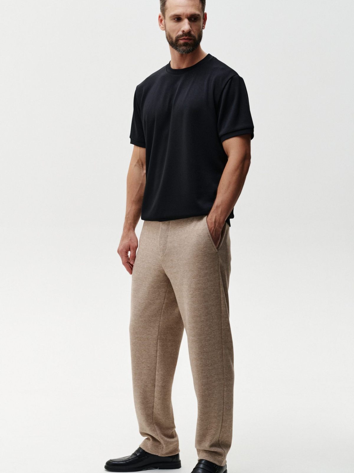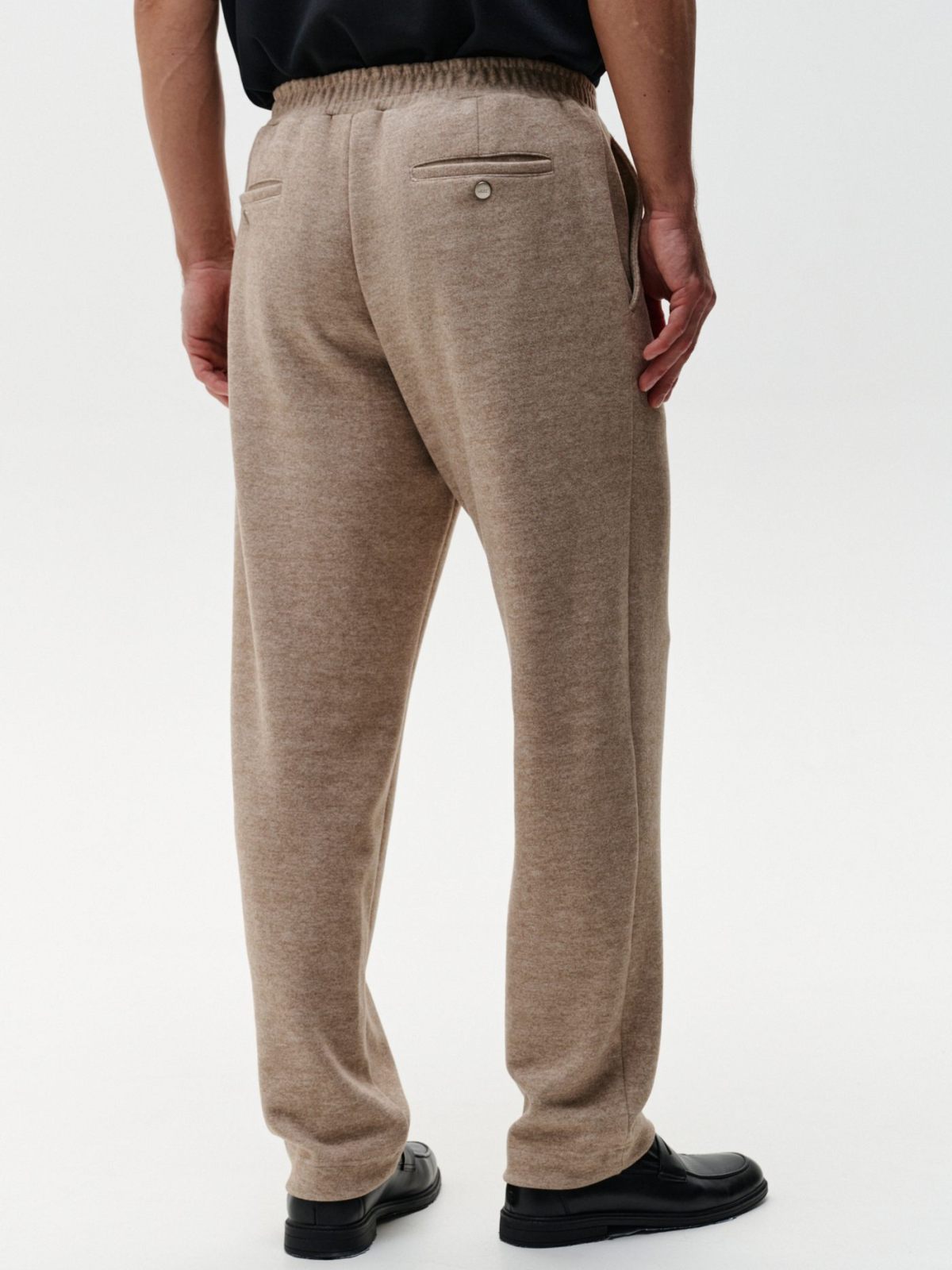 Брюки прямого кроя из коллекции Softwear выполнены из мягкого и теплого материала, в составе которого, преимущественно, вискоза, за счет чего материал гладкий и приятный на ощупь, слегка тянется, но при этом выглядит фактурно. Брюки имеют два боковых кармана, два задних кармана на кнопках, пояс на резинке и кнопке. К брюкам в ассортименте представлены джемпер "Эхо" 2M4SW31E1-25BGE/MLG86 и худи "Эхо" 2M4SW34E1-25BGE/MLG12. Важно: материал имеет низкую пиллингуемость, но частое соприкосновение с аксессуарами может привести к образованию пилли.