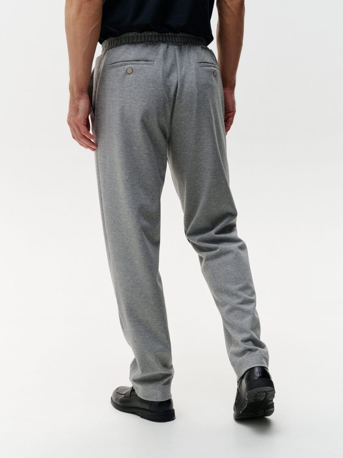 Брюки со стрелками прямого кроя из коллекции Office Core в лаконичном сером меланже выполнены из материала, в составе которого преимущественно вискоза и нейлон, за счет чего материал гладкий и приятный на ощупь, слегка тянется, но при этом выглядит фактурно. Брюки имеют два боковых кармана, два задних кармана на кнопках, пояс на резинке и кнопке. К брюкам в ассортименте представлен джемпер "Генрих" 2M2OC31E1-25GRY/MLG10. Важно: материал имеет низкую пиллингуемость, но частое соприкосновение с аксессуарами может привести к образованию пилли.