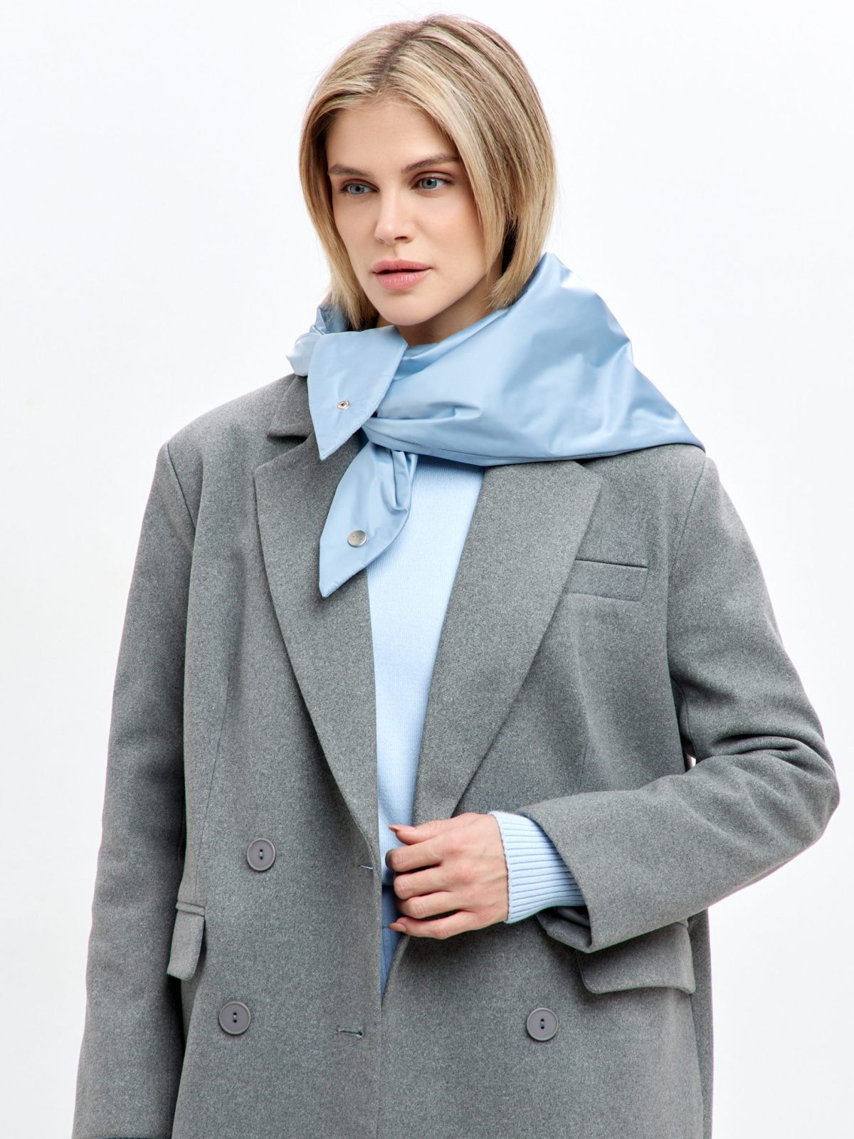 Утепленная косынка на кнопке "Ксю". Косынку можно просто завязать спереди на игривый узел, а можно обернуть вокруг шеи и застегнуть на кнопку, чтобы обеспечить защиту от ветра. Утеплитель Сиберия Микро обладает хорошей теплоизоляцией, воздухопроницаемостью, легкостью и тонкостью, поэтому несмотря на то, что косынка утепленная, она тонкая и легкая. Не вызывает аллергии, подходит людям с чувствительной кожей. В ассортименте к косынке представлены пальто 1W8PR110W. Комплекты выполнены в трех трендовых оттенках: ледяной голубой, ртуть и золото.