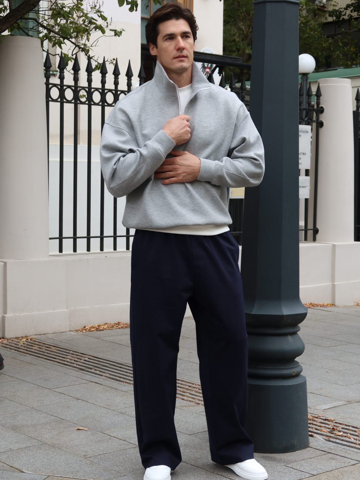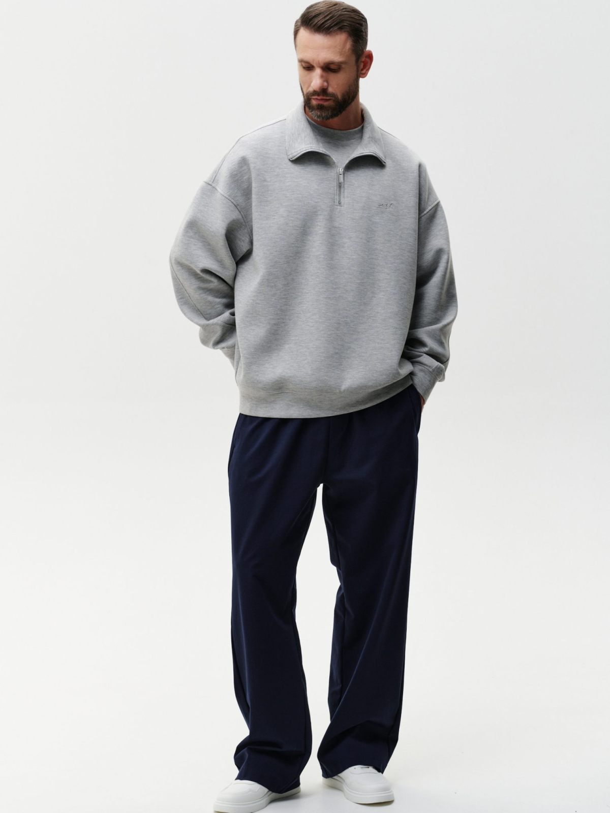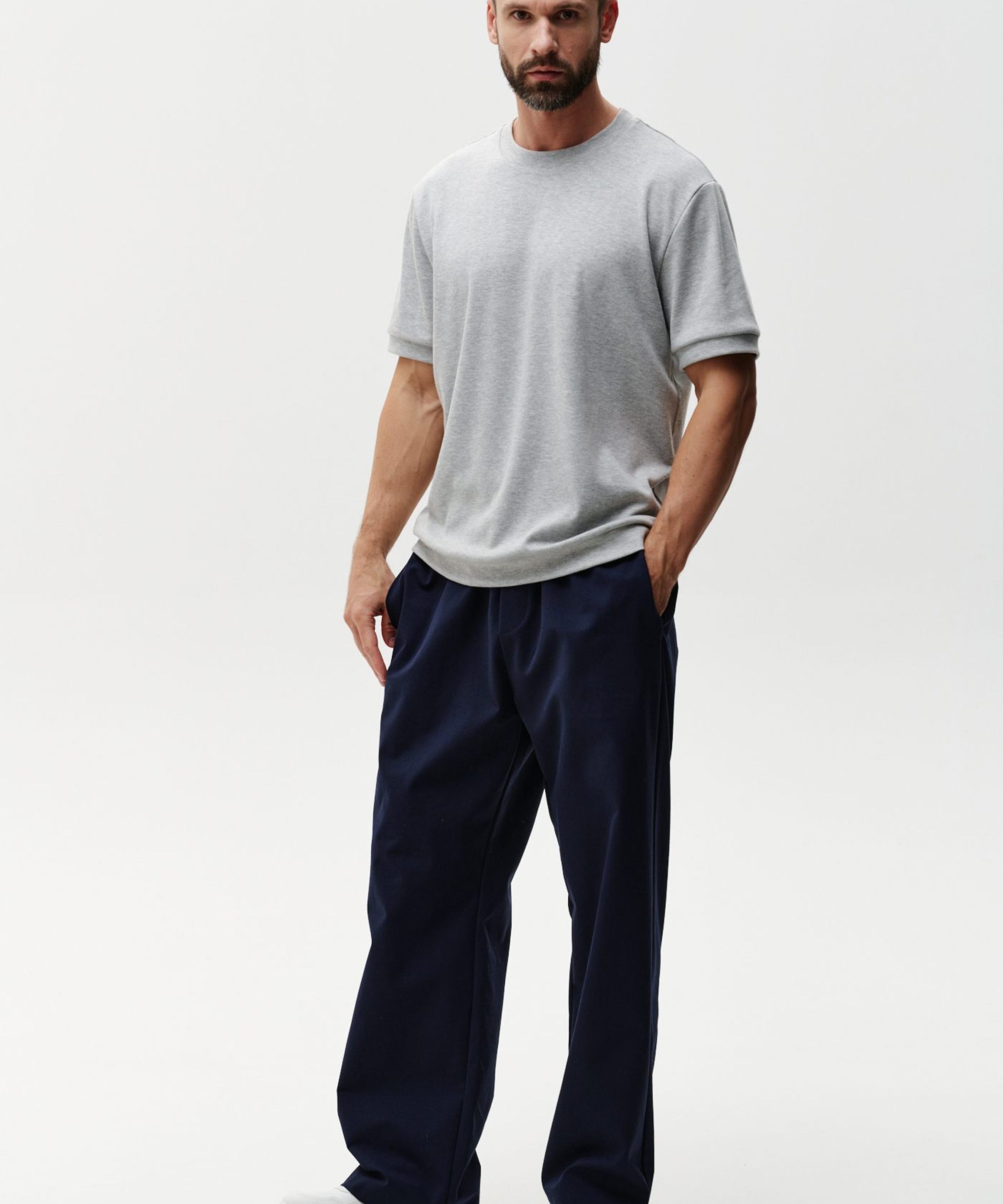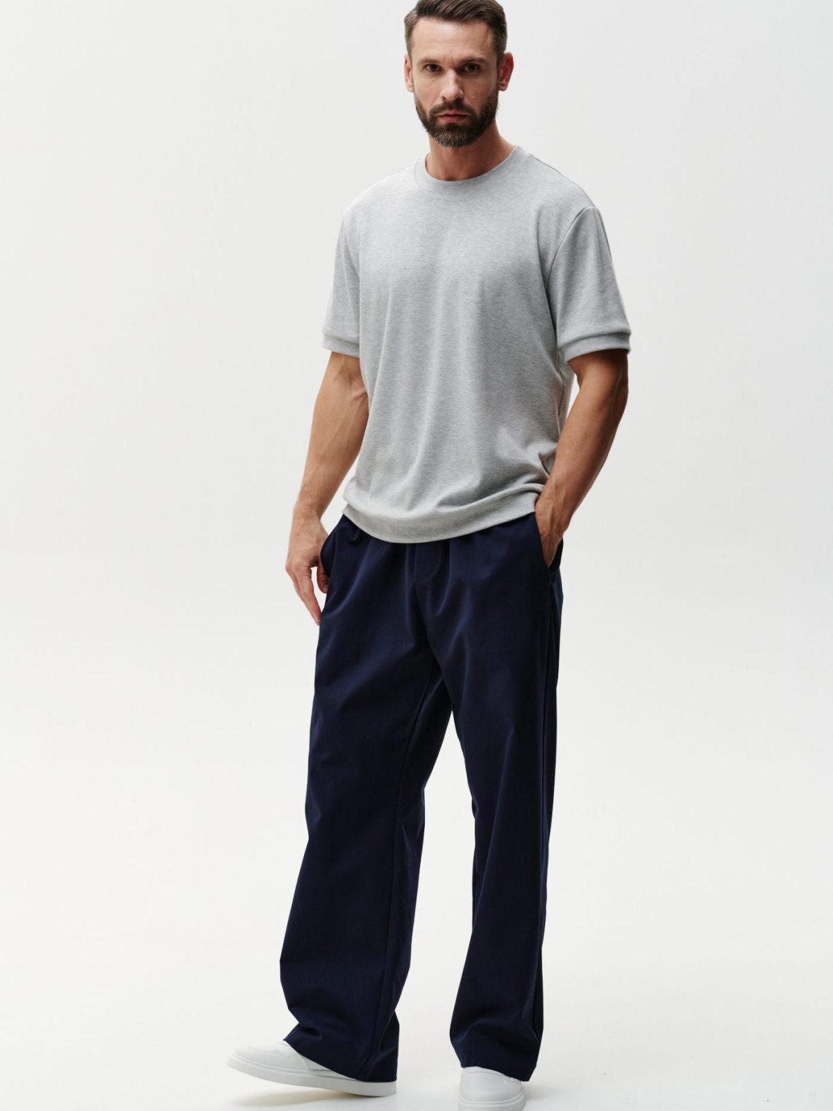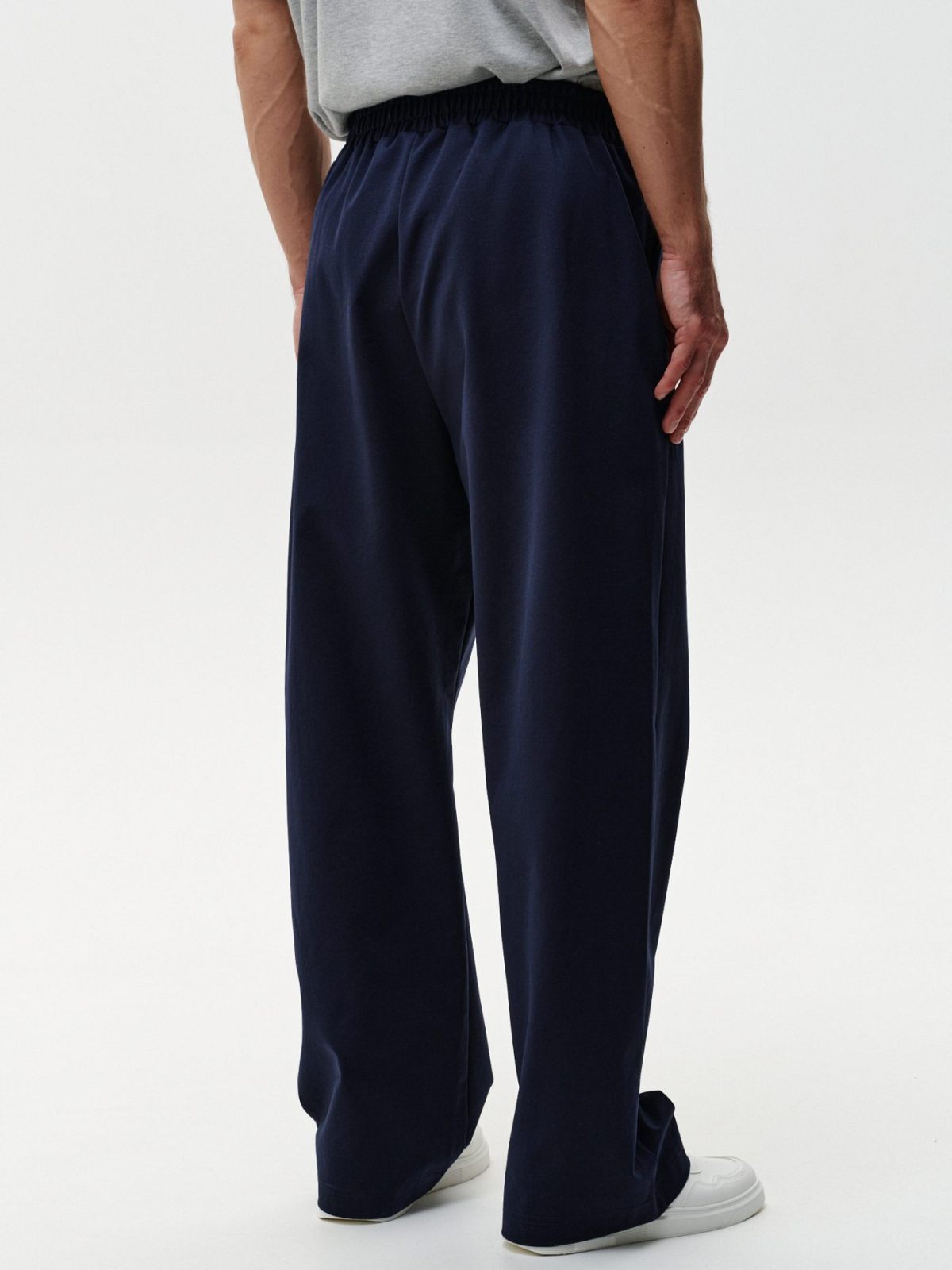 Широкие прямые брюки "Эхо" из коллекции Pure в строгом темно-синем цвете navi. Материал - джерси, приятный на ощупь, гладкий, прочный и структурный, отлично держит форму. За счет добавления нейлона в состав материал слегка тянется. Брюки имеют два боковых кармана на молнии, внутренний шнурок в поясе для регулировки посадки, пояс на резинке. Гульфик на брюках декоративный. Свободный крой и структурный материал позволяют сочетать брюки с любыми верхами, в том числе свитерами, создавая стильные образы на каждый день.