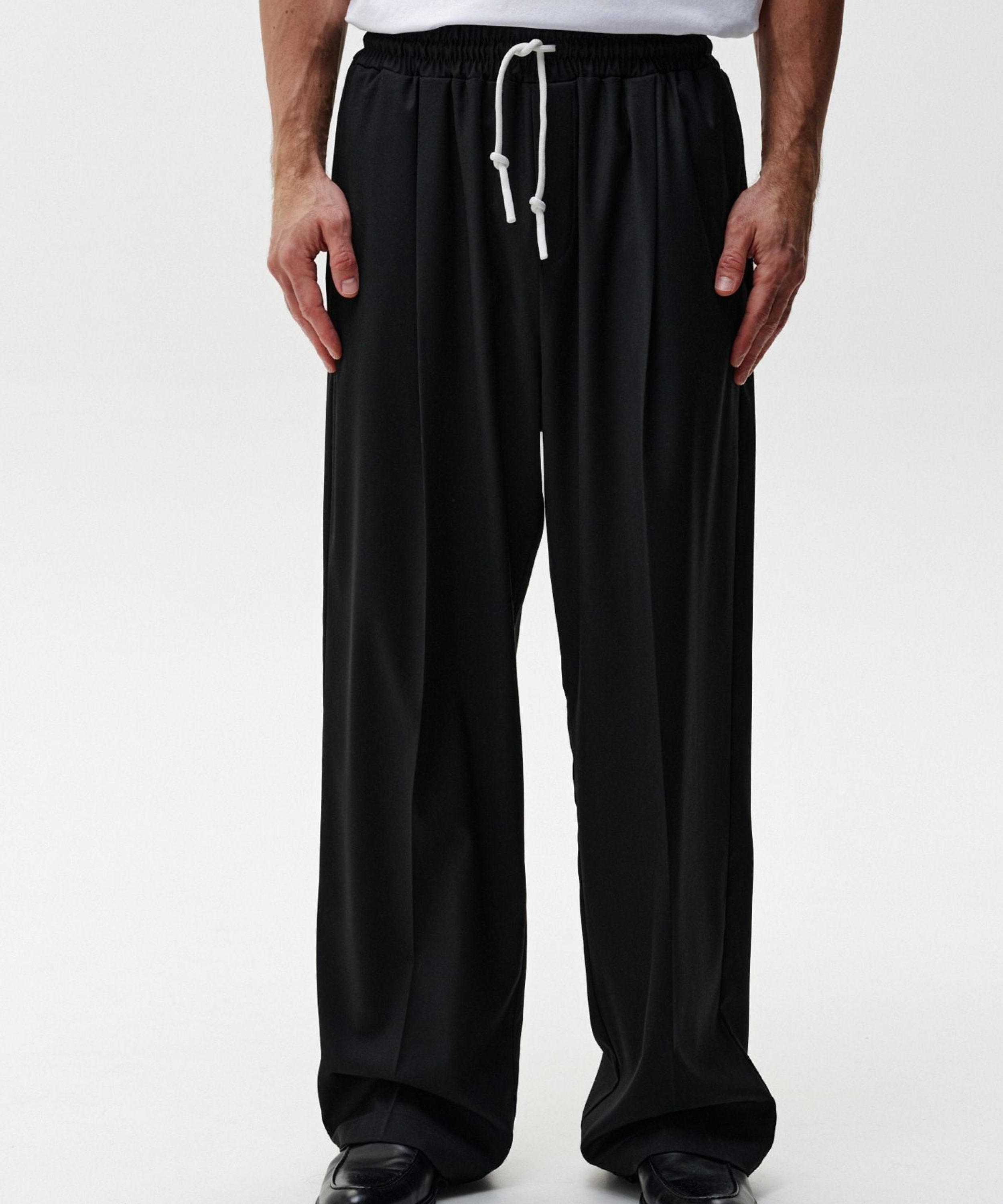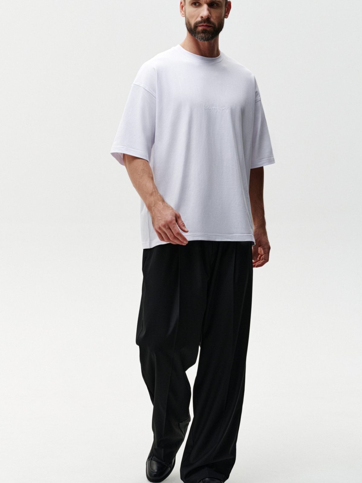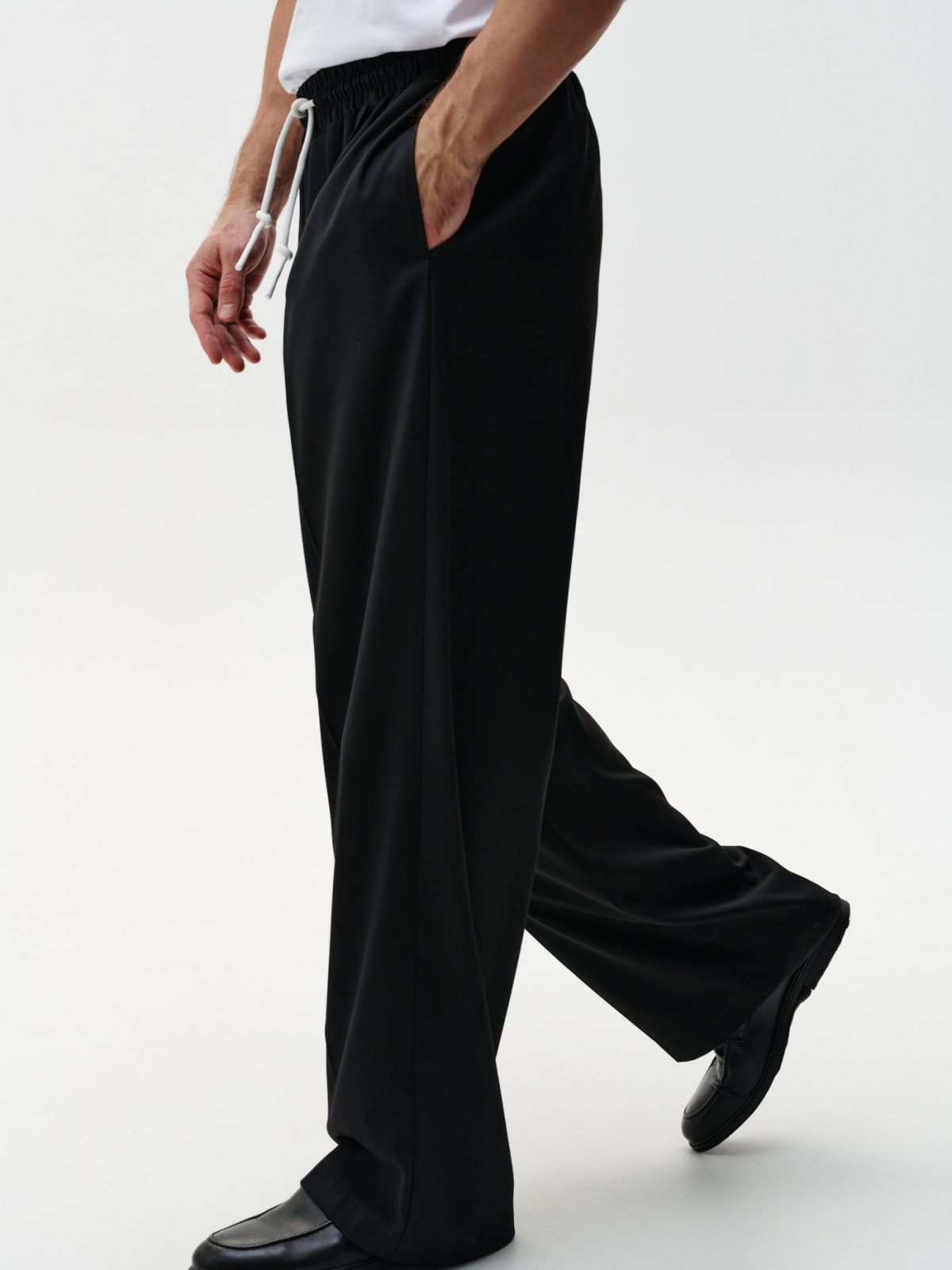 Широкие прямые брюки "Женя" свободного кроя из костюмной ткани с вискозой. На лицевой стороне выполнены защипы и декоративные стрелки. Брюки имеют два боковых кармана, эластичный пояс и контрастный шнурок для регулировки посадки. Гульфик на брюках декоративный. Свободный крой и структурный материал позволяют сочетать брюки с любыми верхами, в том числе свитерами, создавая стильные образы на каждый день.