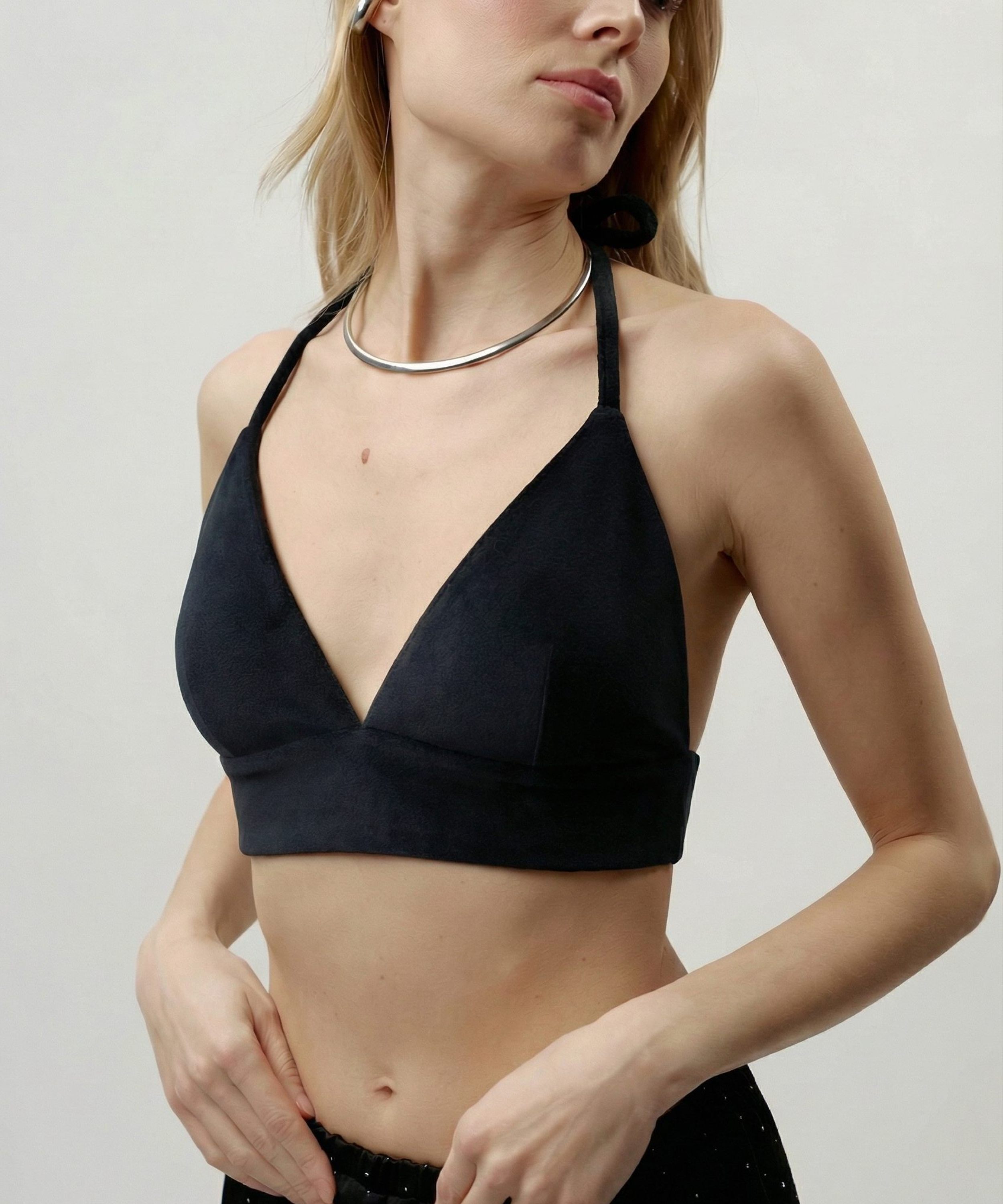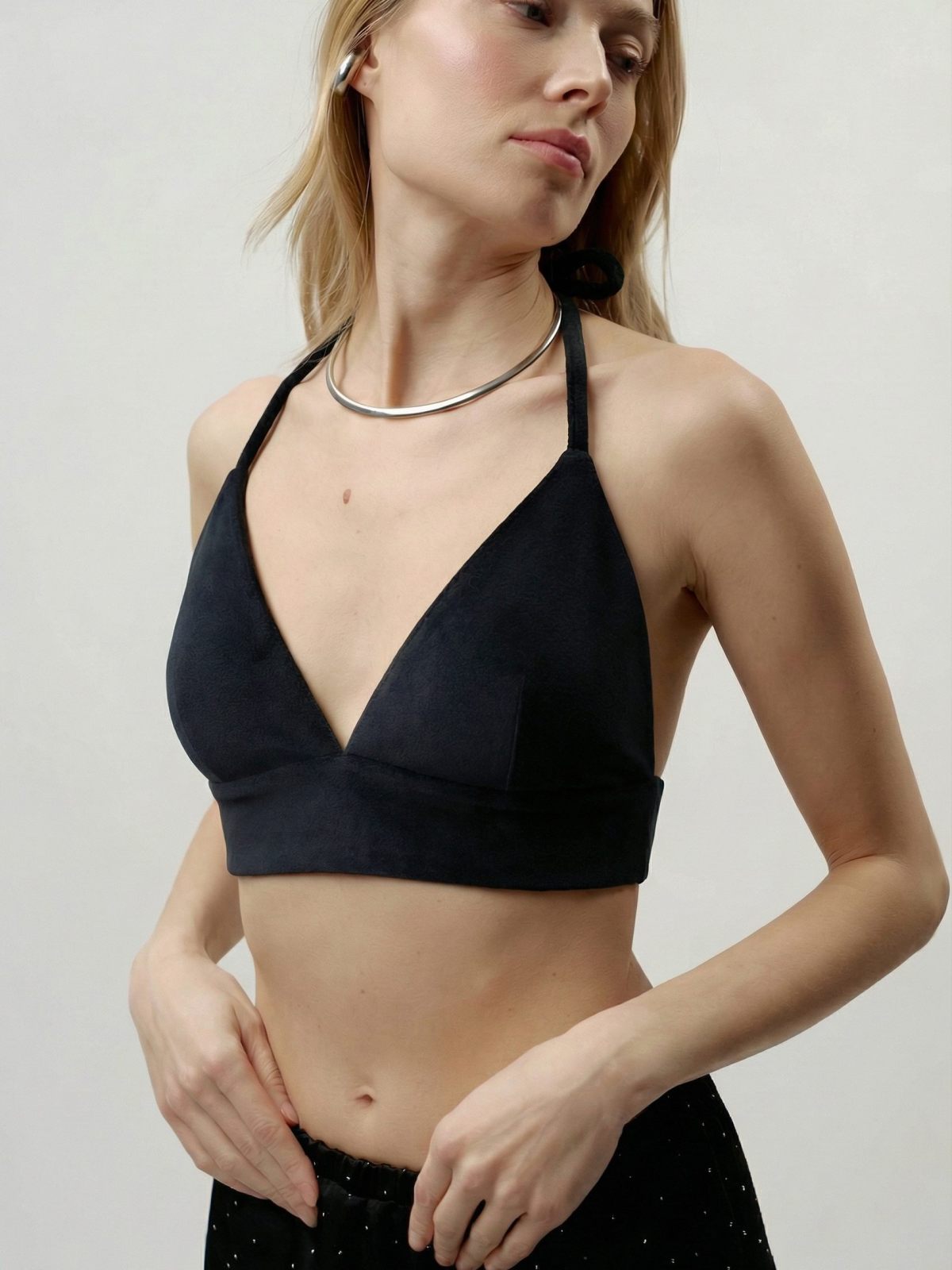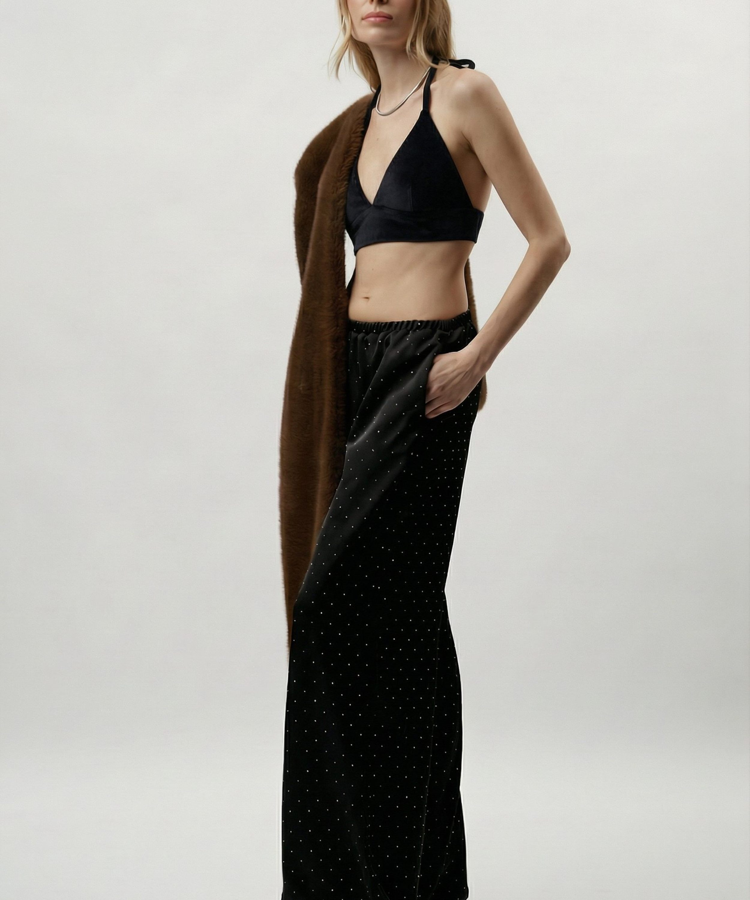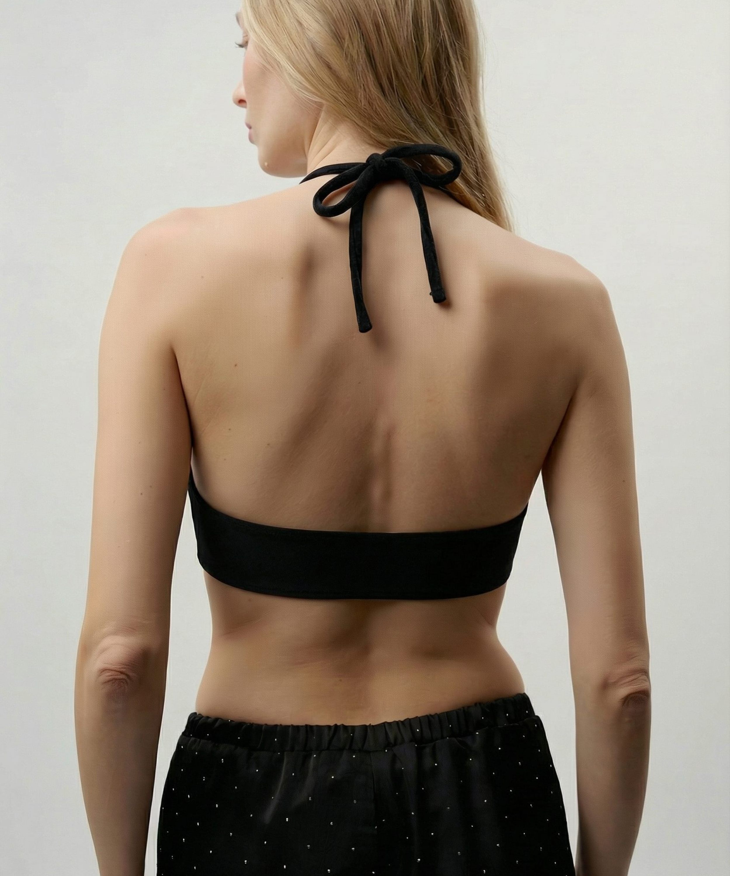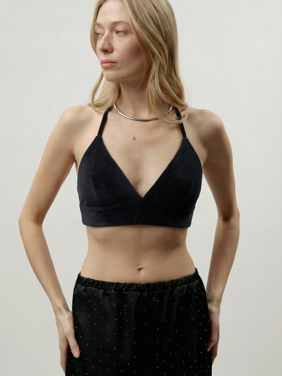 Топ "Флер" из черного, мягкого и приятного к телу велюра. Топ на эластичном широком поясе комфортно прилегает к телу и обеспечивает хорошую посадку. Бретельки подвязные, что дает возможность регулировать высоту лямок и посадку под себя. Топ хорошо держит форму за счет чашек, которые можно убрать при желании. В комплекте к топу в ассортименте представлены брюки со стразами "Флер" SBW2NY84W-47BLK65 и полупрозрачная рубашка "Марина" SBW2NY53W-23BLK101.