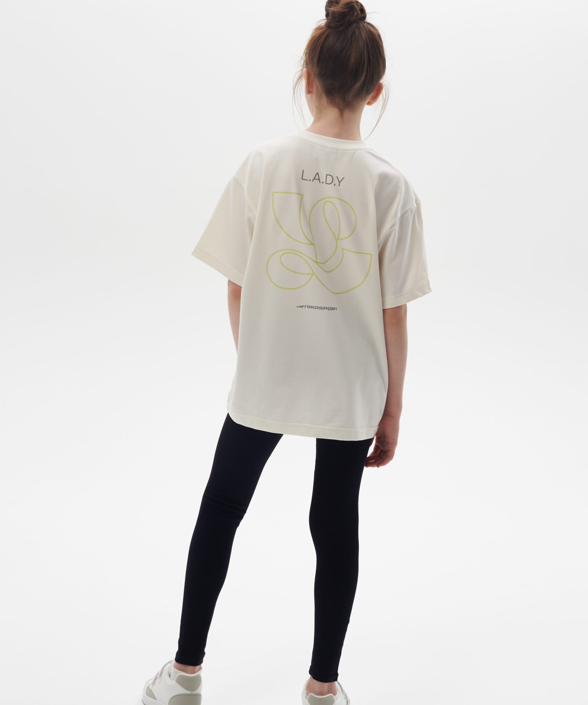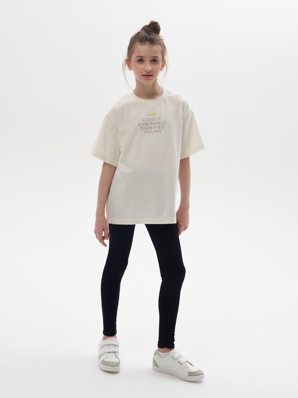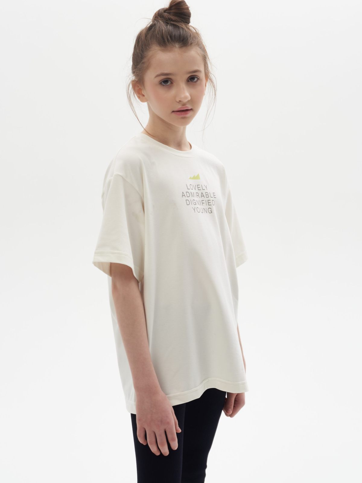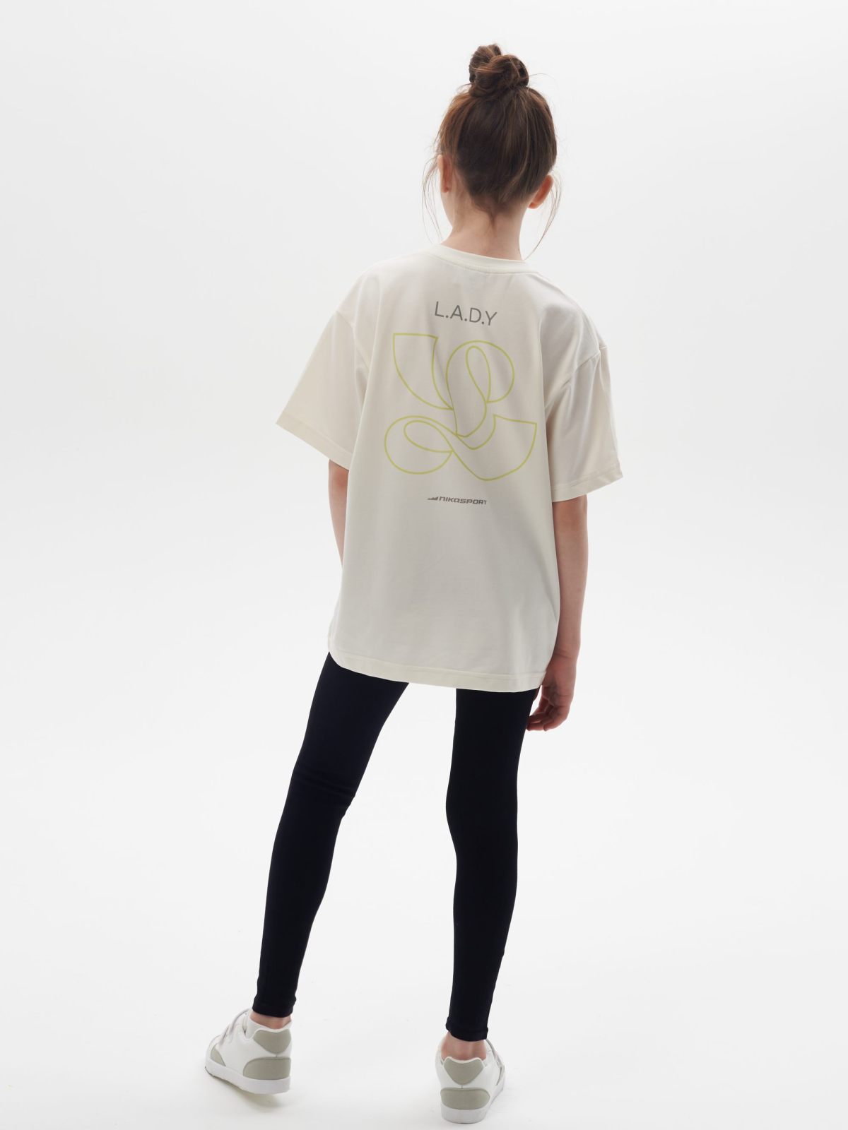 Детская футболка свободного кроя со спущенным плечом из хлопка с бархатистым эффектом. На передней части изделия и на спине расположены принты.