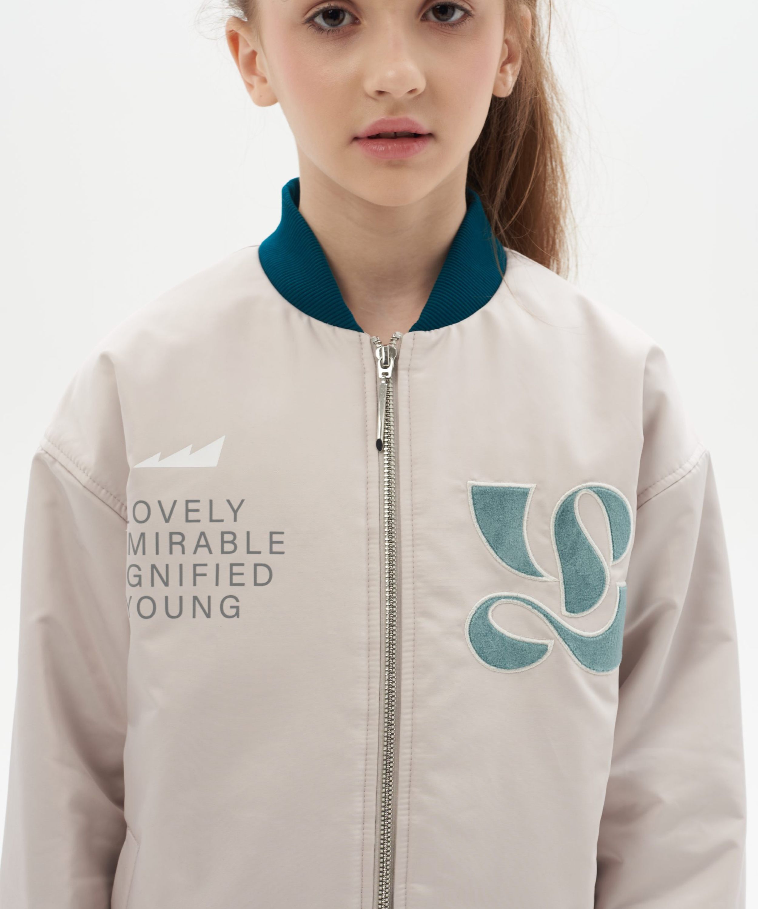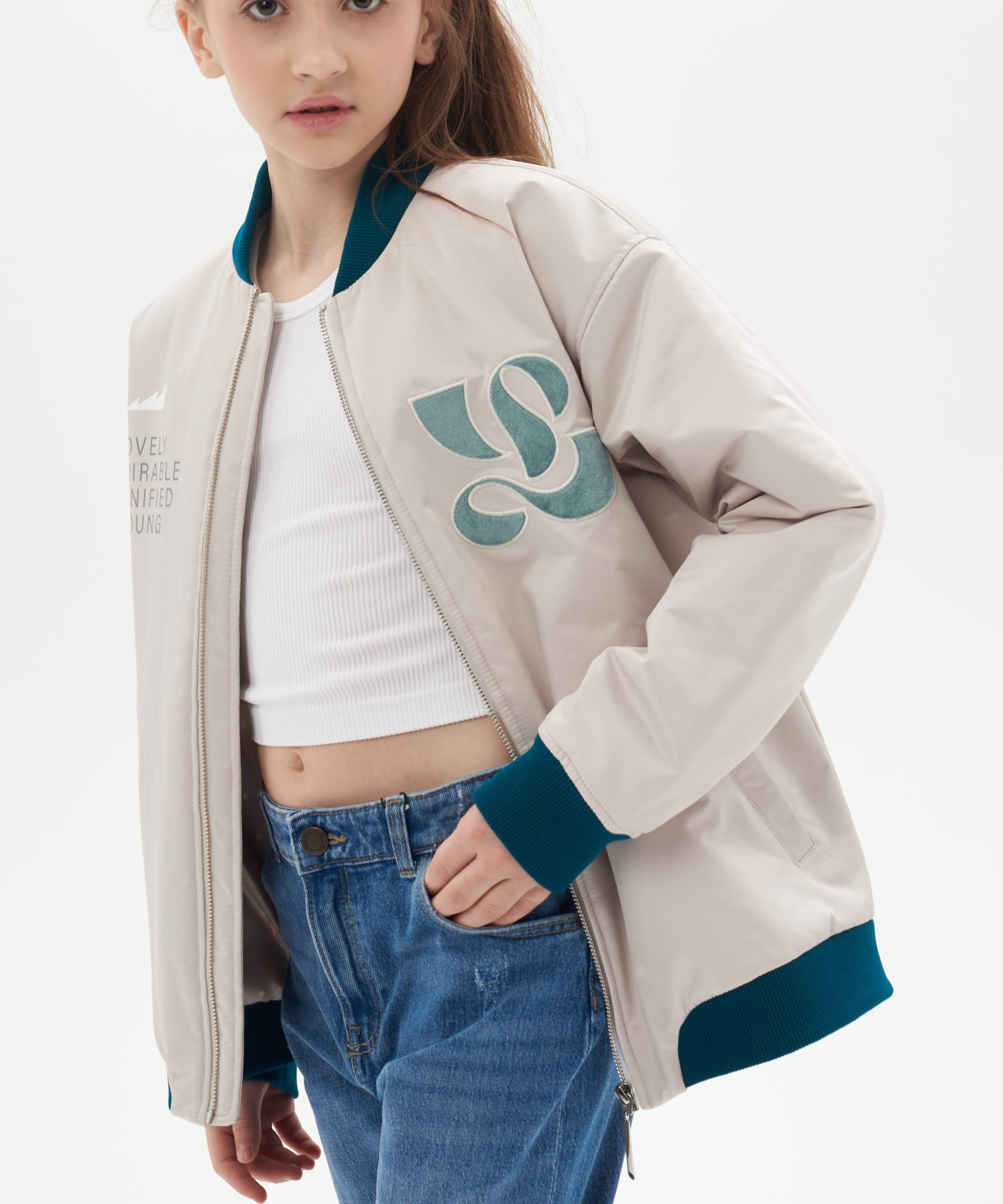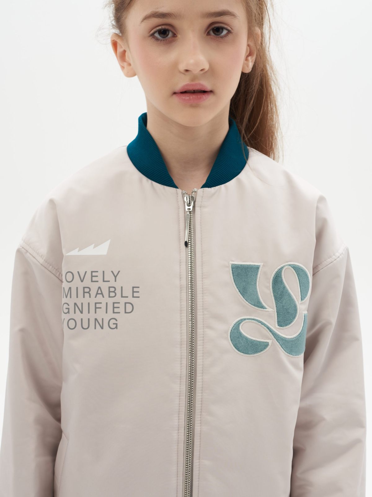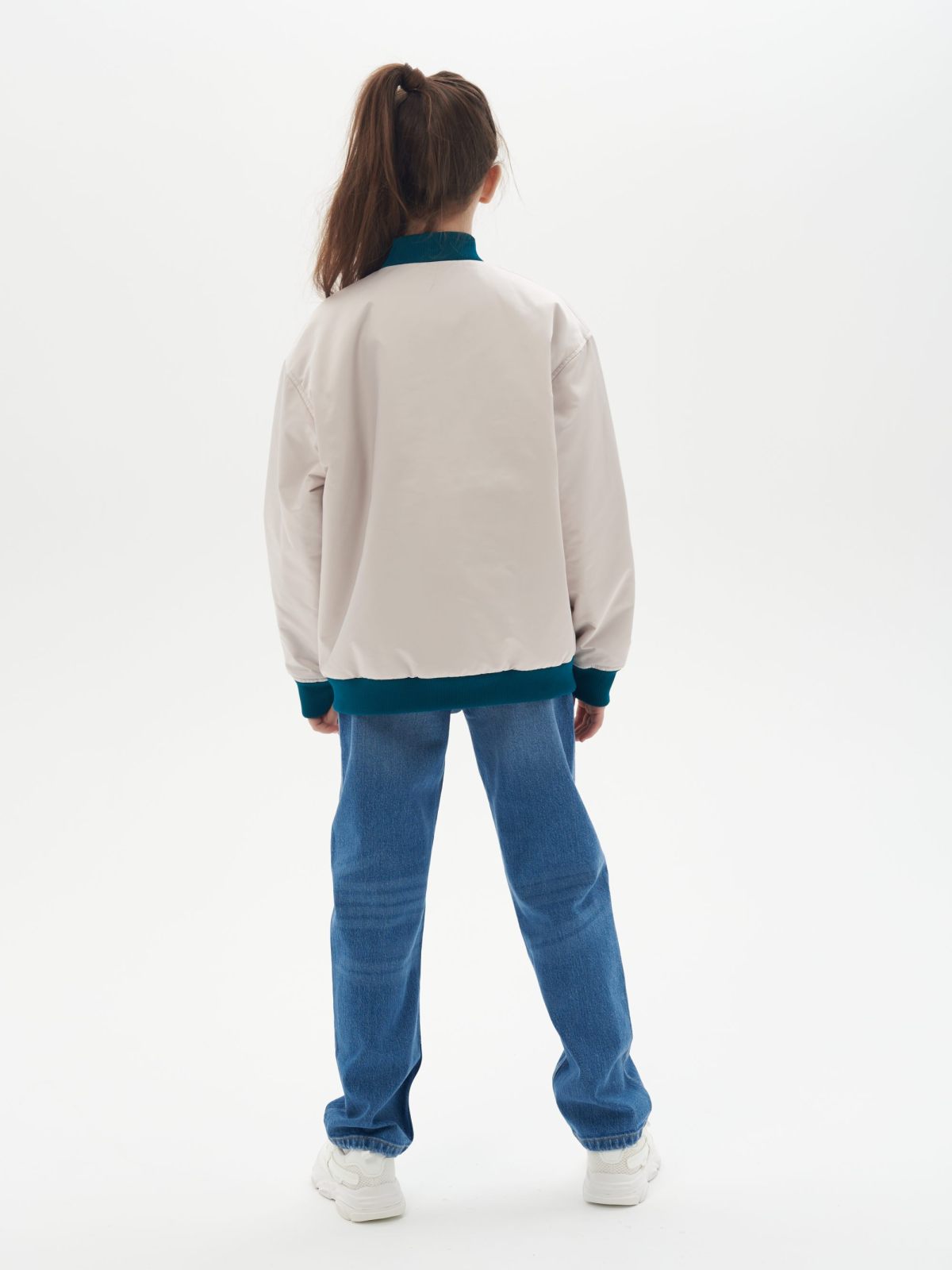 Детский бомбер свободного кроя имеет большую вышивку на передней части изделия с левой стороны и принт с правой, спущенное плечо, центральную застёжку на молнии с внутренней планкой, боковые карманы, контрастные манжеты и воротник. Бомбер отлично сочетается не только с моделями в спортивном стиле, а так же с джинсами и платьями.