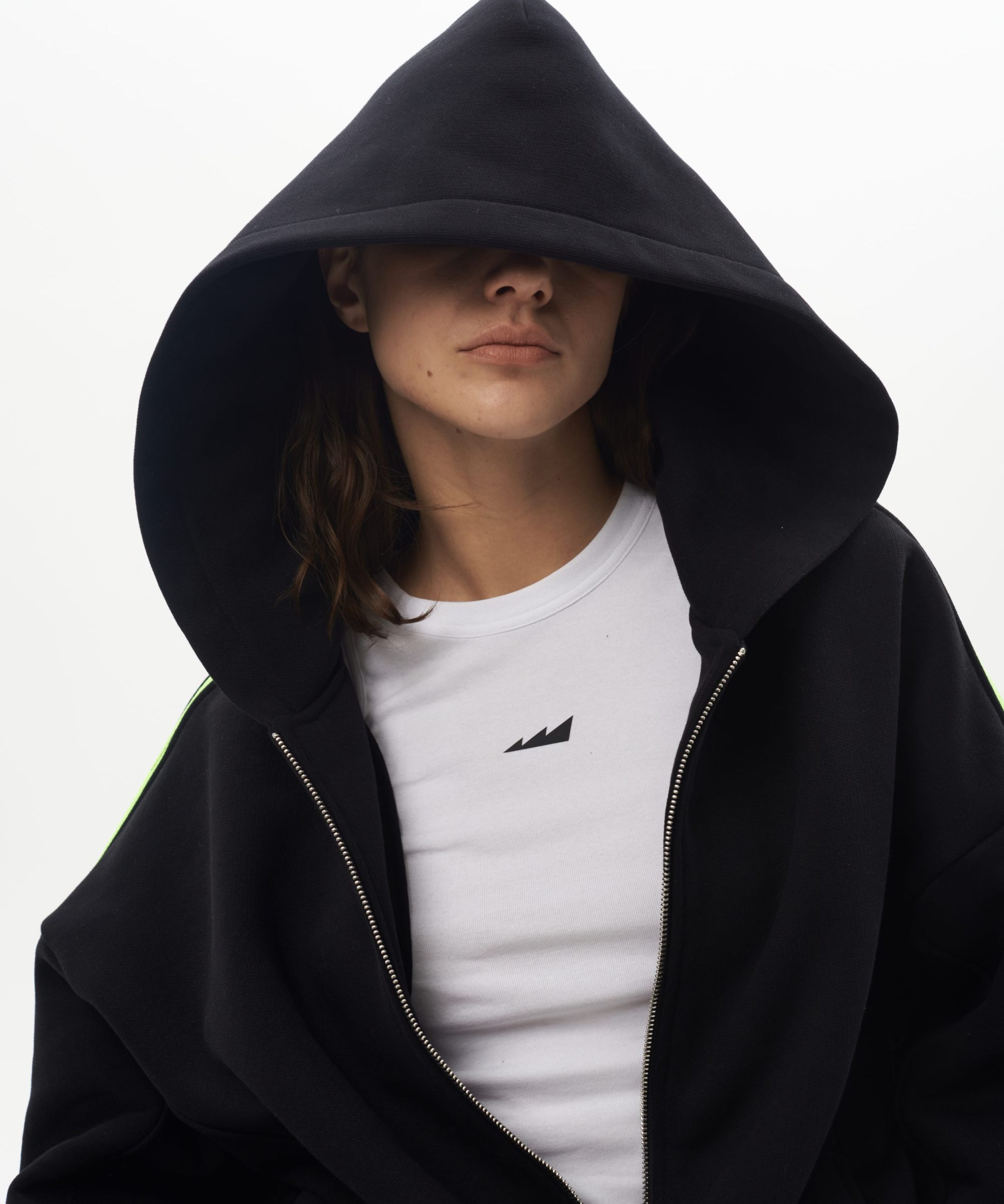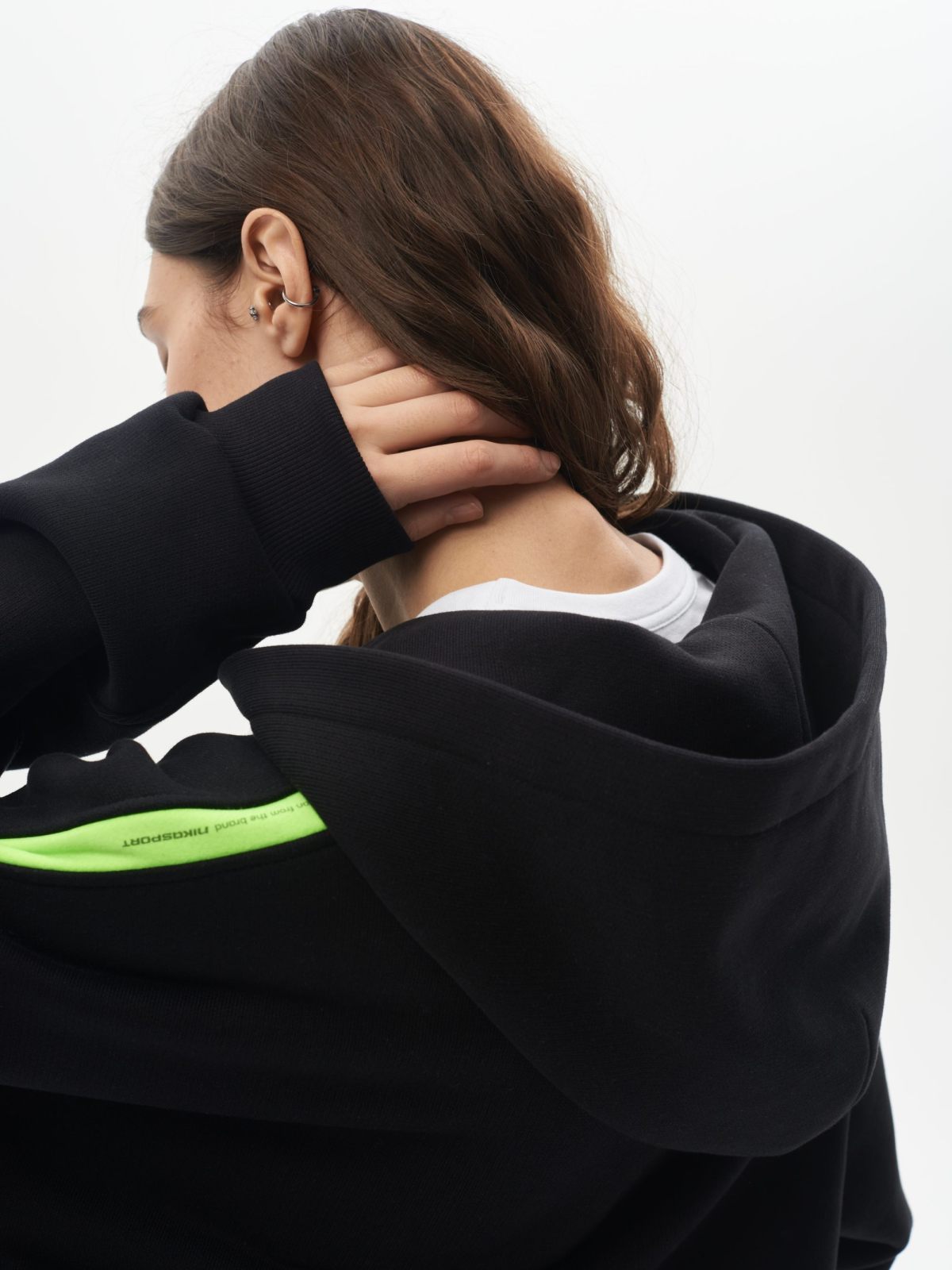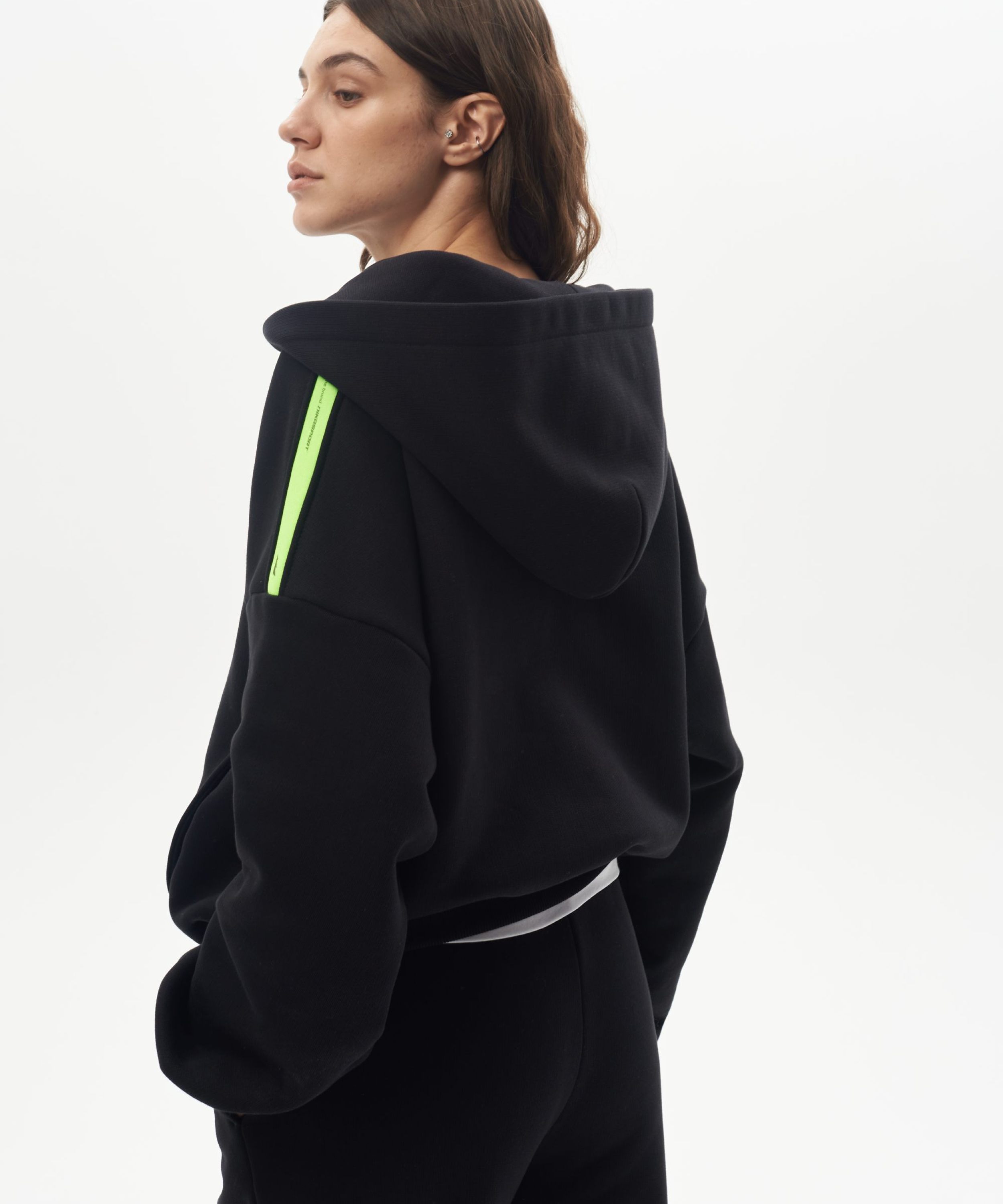 Укороченный oversize худи со спущенным плечом, фигурными боковыми вставками, которые продолжаются по рукаву, боковыми карманами, большим одношовным капюшоном и контрастными вставками на плечах с логотипом коллекции. Ассиметричный низ худи и oversize капюшон позволяют создать стильный современный комфортный образ в спортивном стиле.
