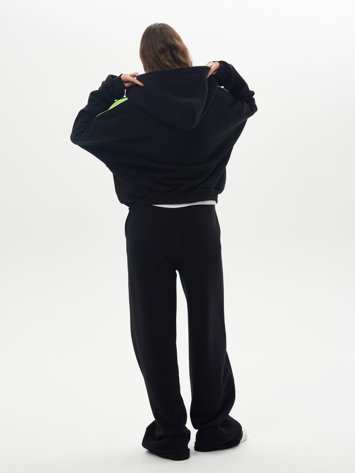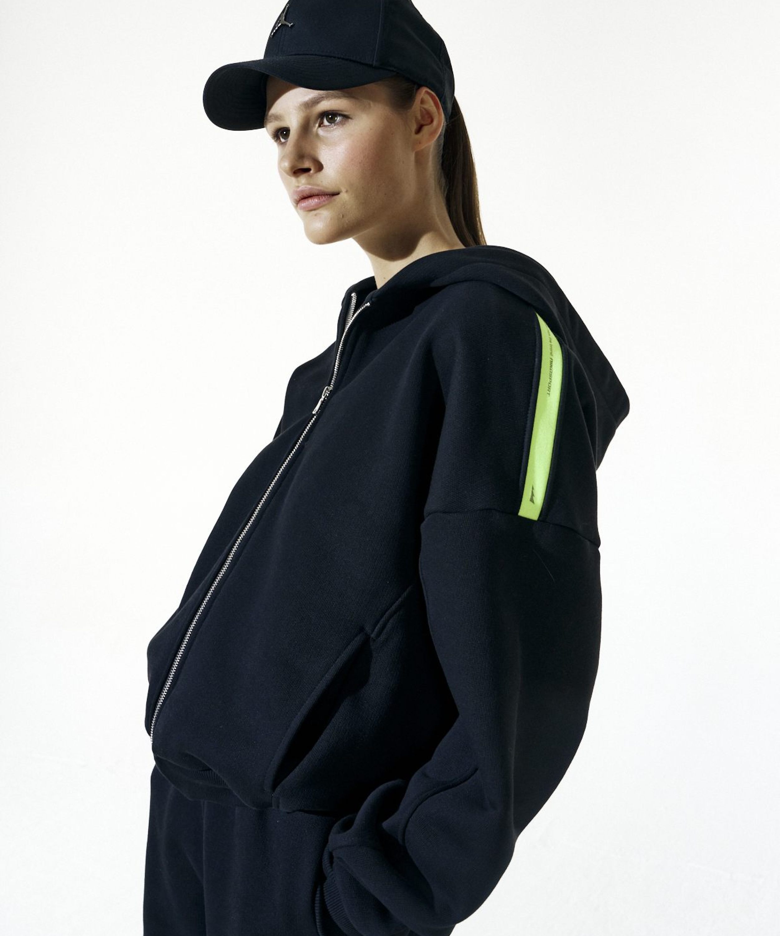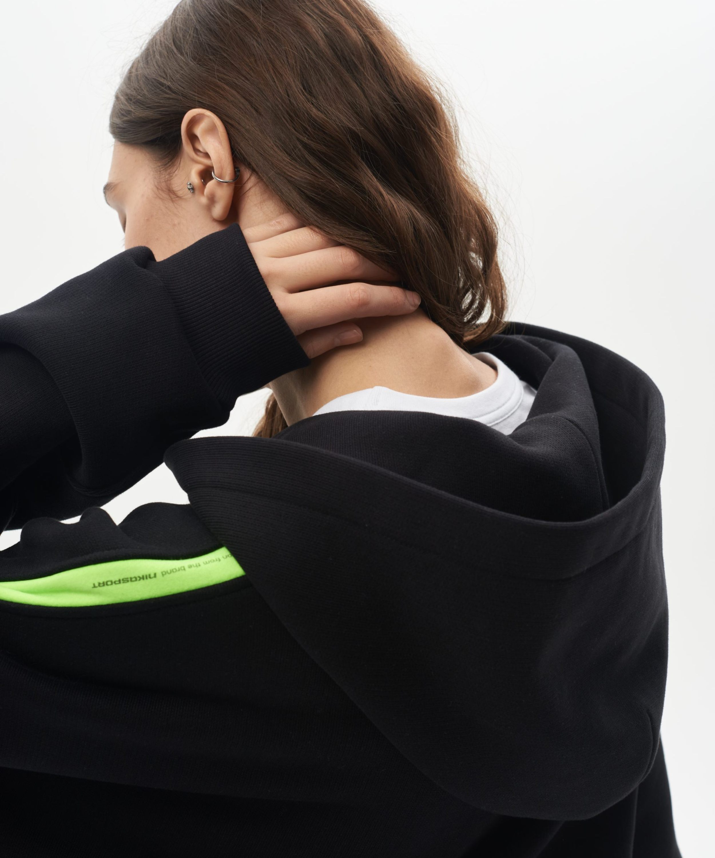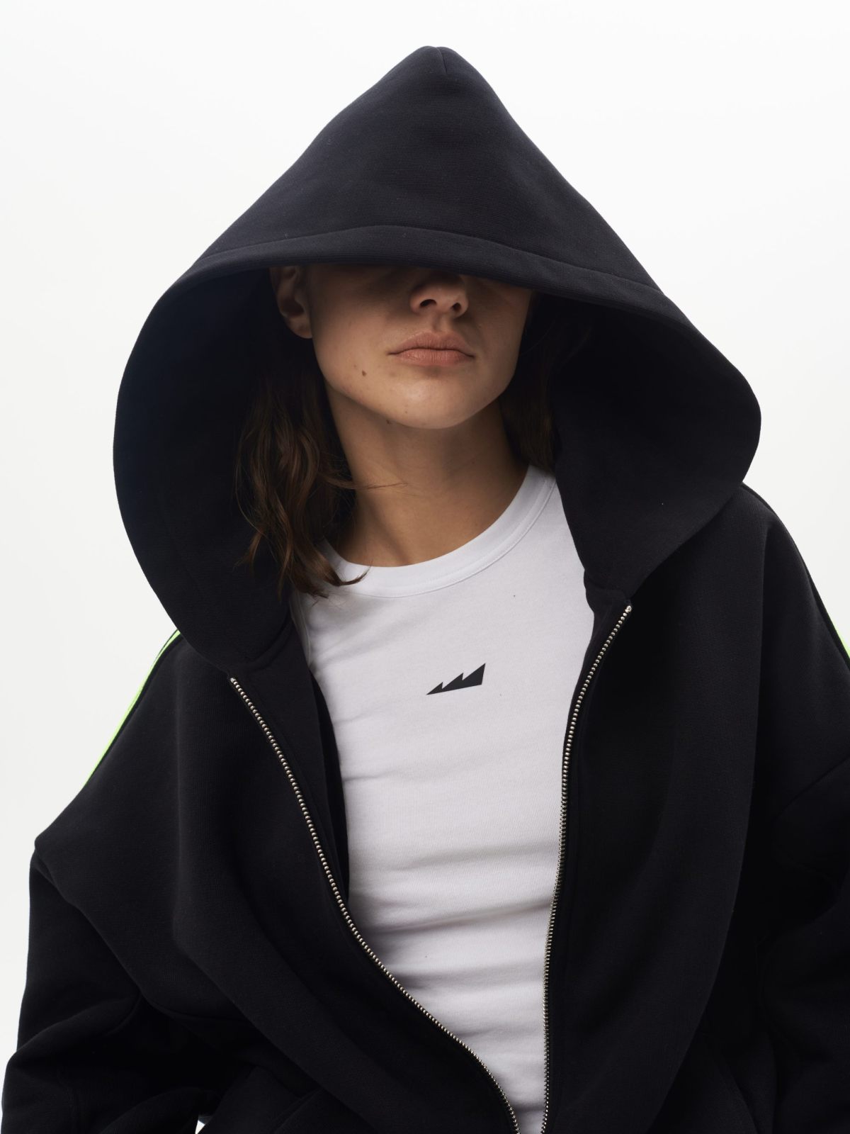 Укороченный oversize худи со спущенным плечом, фигурными боковыми вставками, которые продолжаются по рукаву, боковыми карманами, большим одношовным капюшоном и контрастными вставками на плечах с логотипом коллекции. Ассиметричный низ худи и oversize капюшон позволяют создать стильный современный комфортный образ в спортивном стиле.