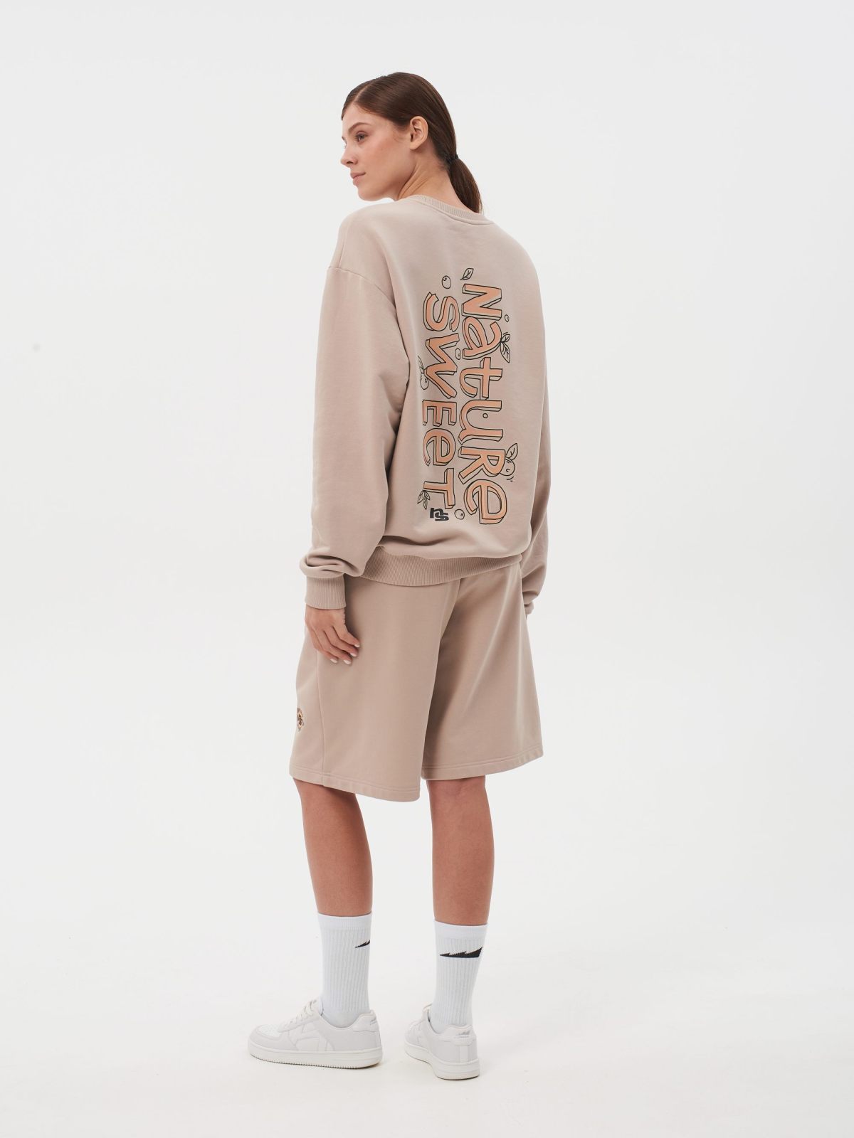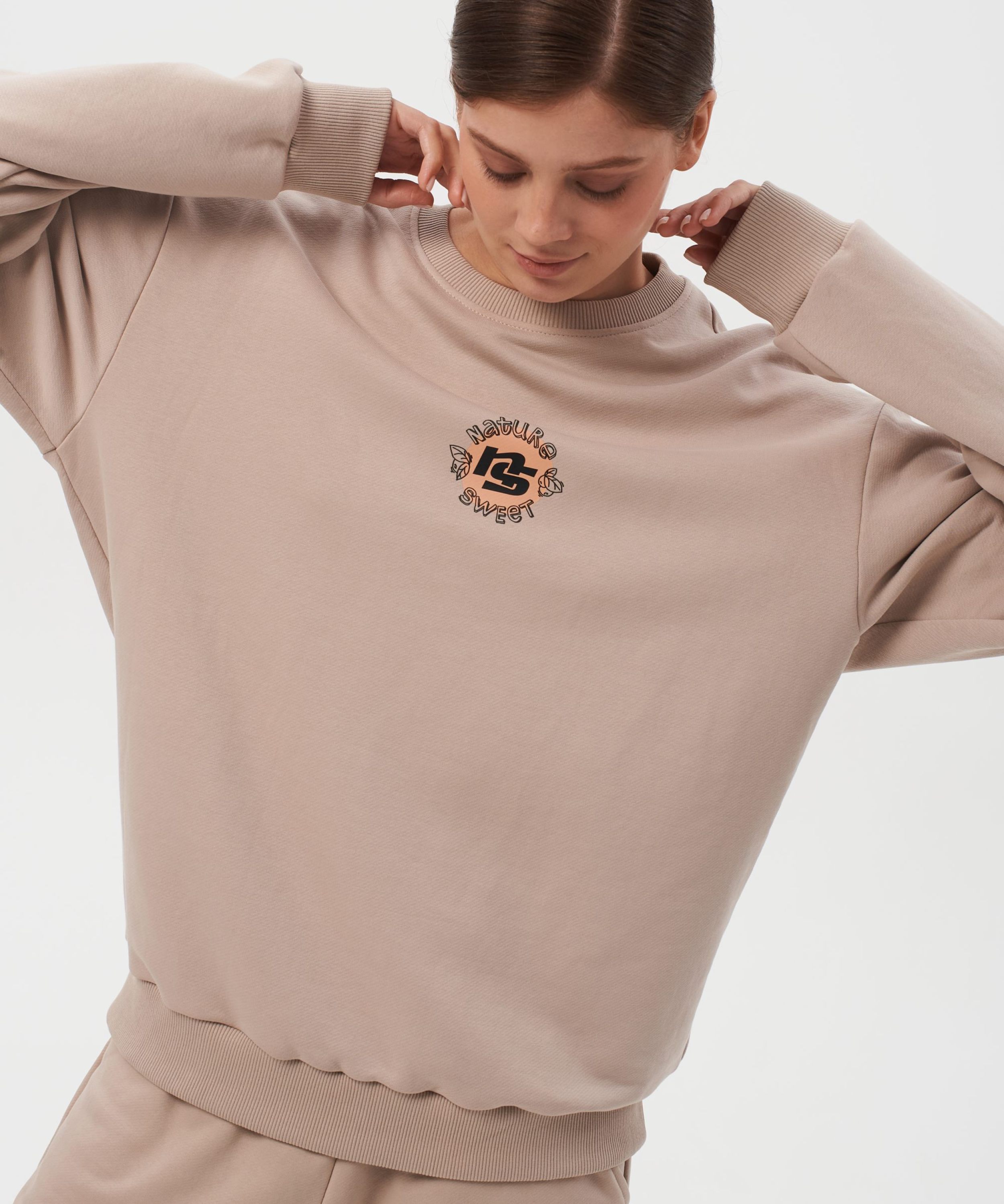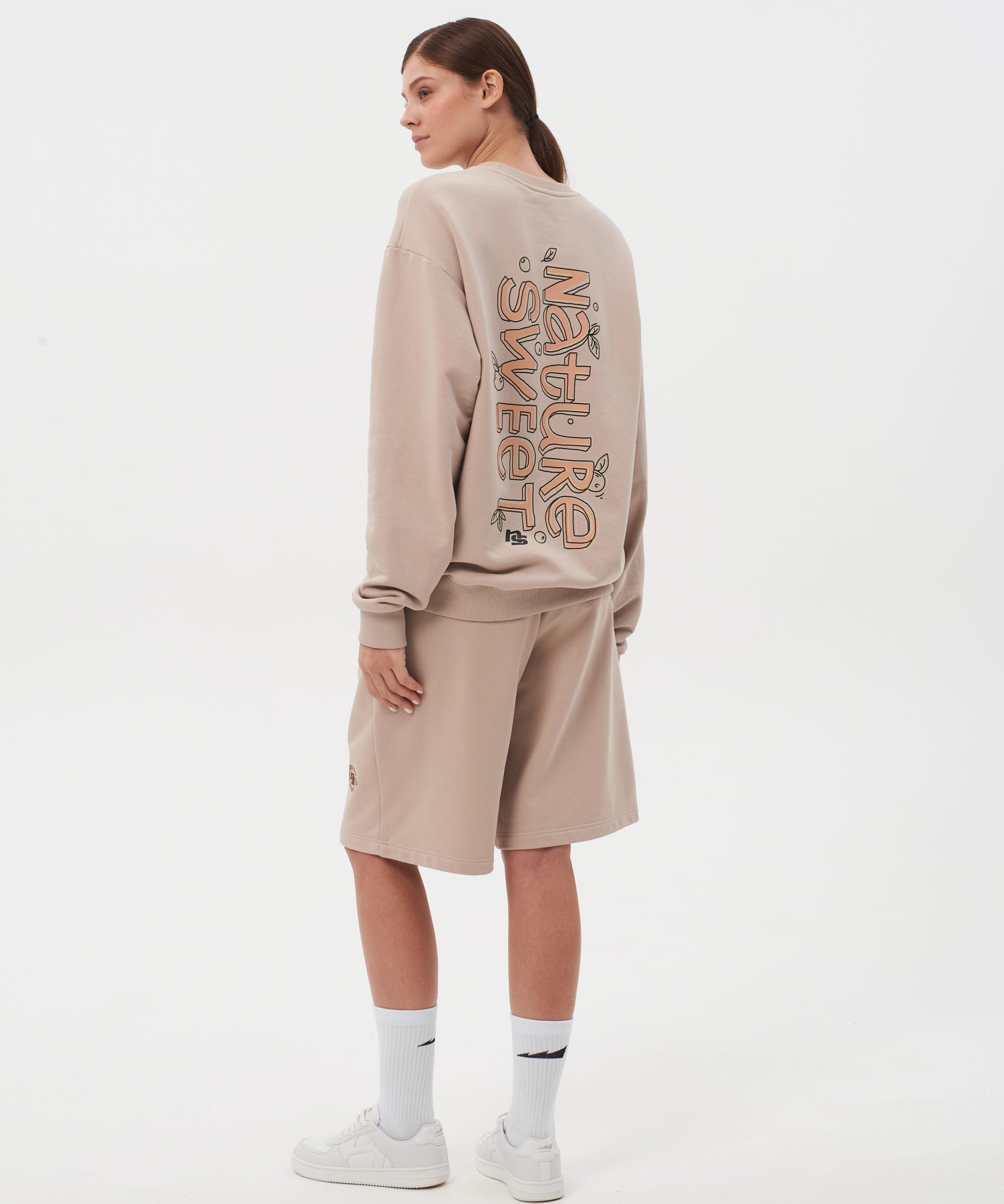 Свитшот женский oversize силуэта. В составе 90% хлопка и 10% полиэстера, что обеспечивает отличную посадку и долговечность изделия. На спине расположен нежный принт коллекции "Sweet Nature" - ты прекрасна такая, какая ты есть! Свитшот представлен в нежных цветах персик и капучино и удачно дополнит как спортивный, так и классический образ.