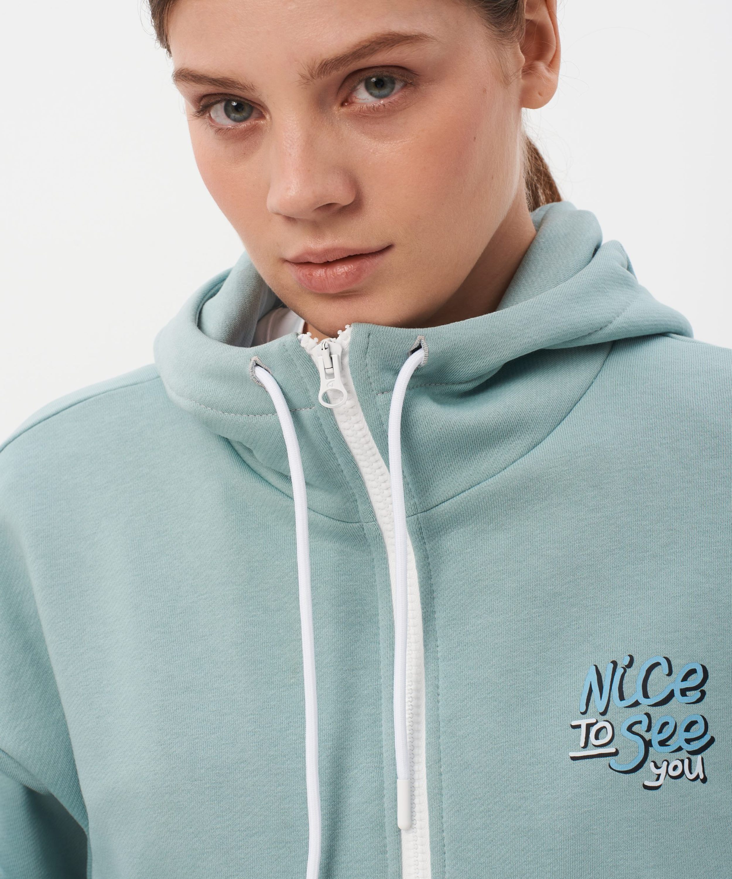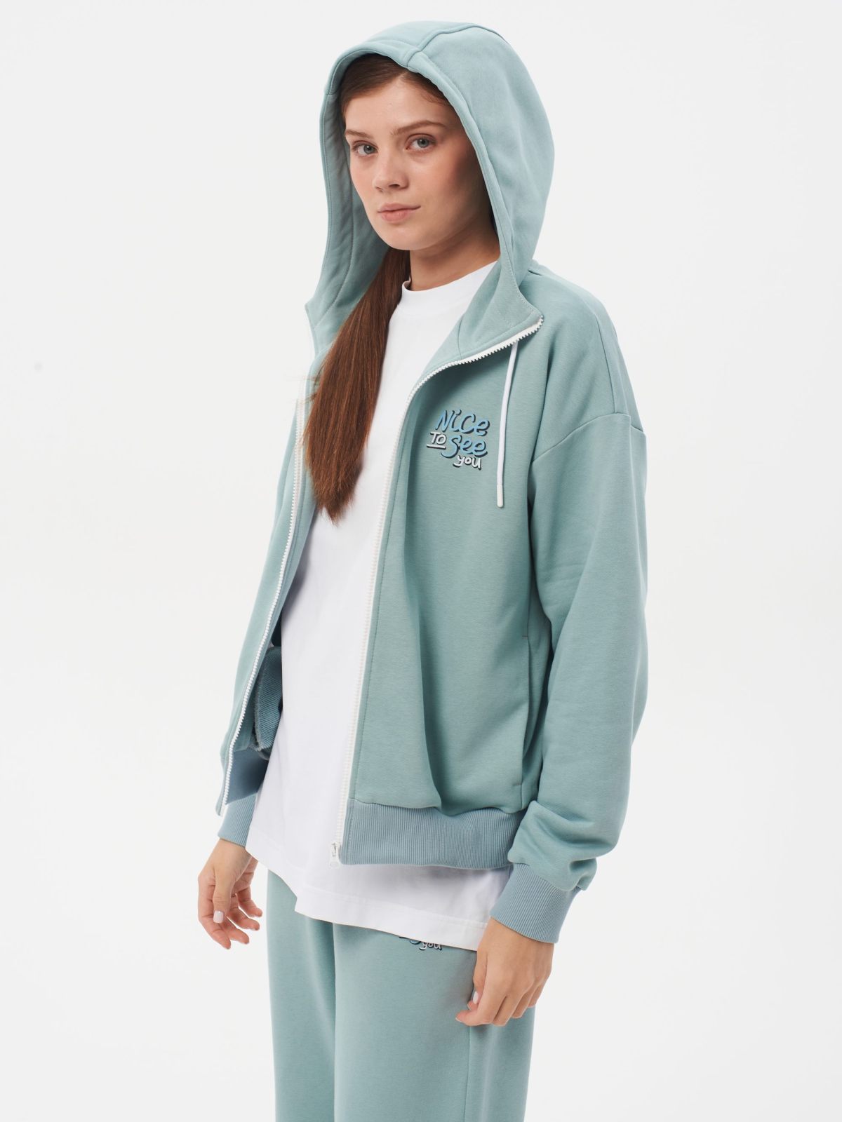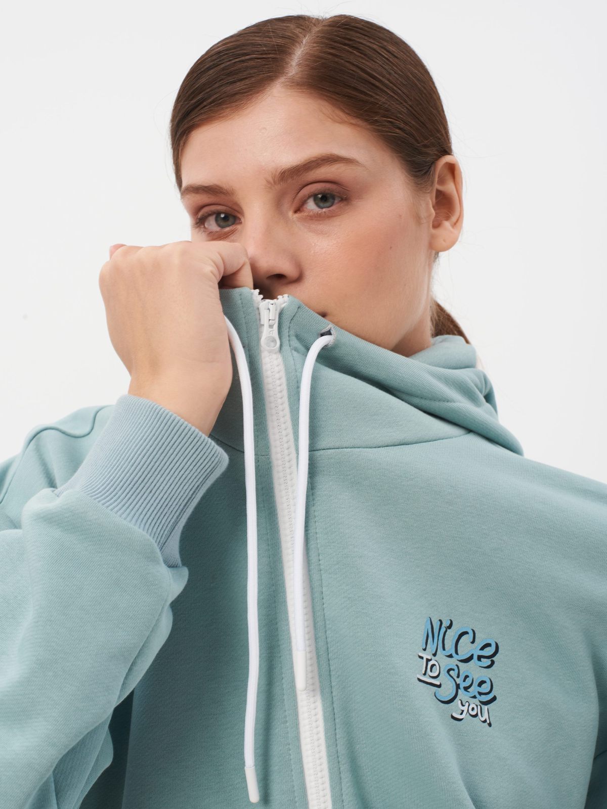 Классическая женская толстовка на молнии. В составе 90% хлопка и 10% полиэстера, что обеспечивает отличную посадку и долговечность изделия. Спущенная линия плеча, свободный крой, высокий воротник на утяжке с капюшоном превращают толстовку в уютный атрибут посведневной одежды. Представлена в сезонных цветах мята и капучино, на груди расположен нежный принт. Модель не сковывает движения и позволяет создавать многослойные образы.