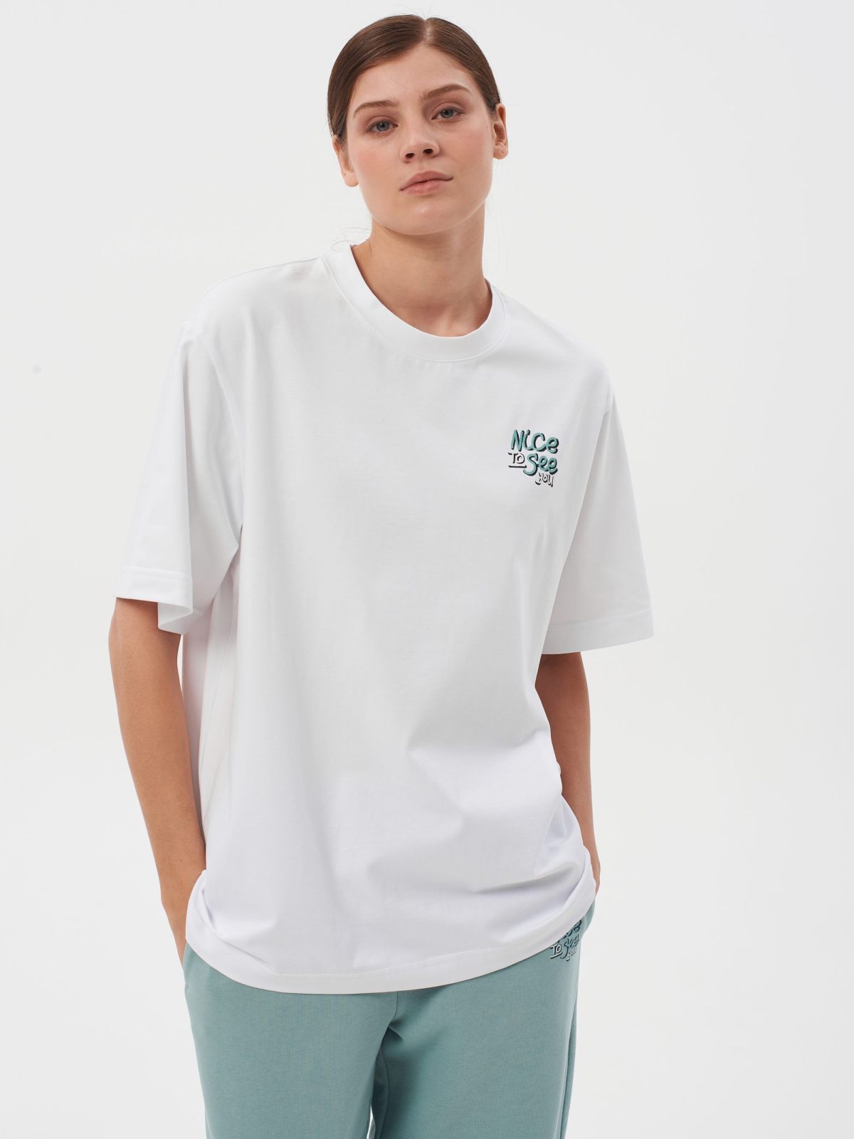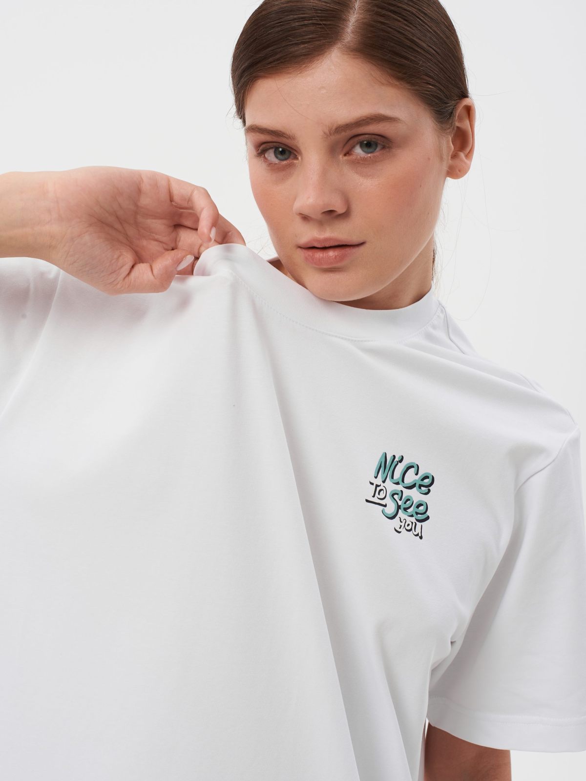 Женская футболка oversize силуэта. В составе 92% хлопка и 8% эластана, что обеспечивает отличную посадку и долговечность изделия. Спущенная линия плеча делает крой футболки более молодежной. На спине расположен большой принт с ключевым слоганом женской коллекции "Sweet Nature" - ты прекрасна такая, какая ты есть! Футболка представлена в классическом белом, а также в нежных летних мятном и персиковом цветах. Прекрасное дополнение как спортивного, так и повседневного образа