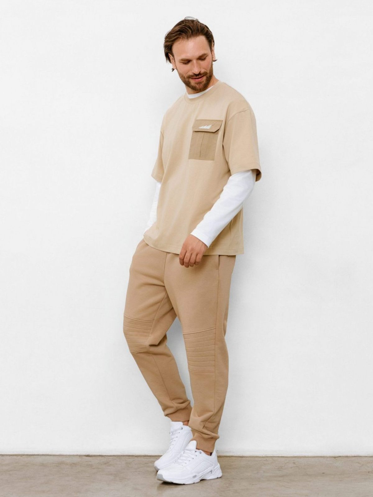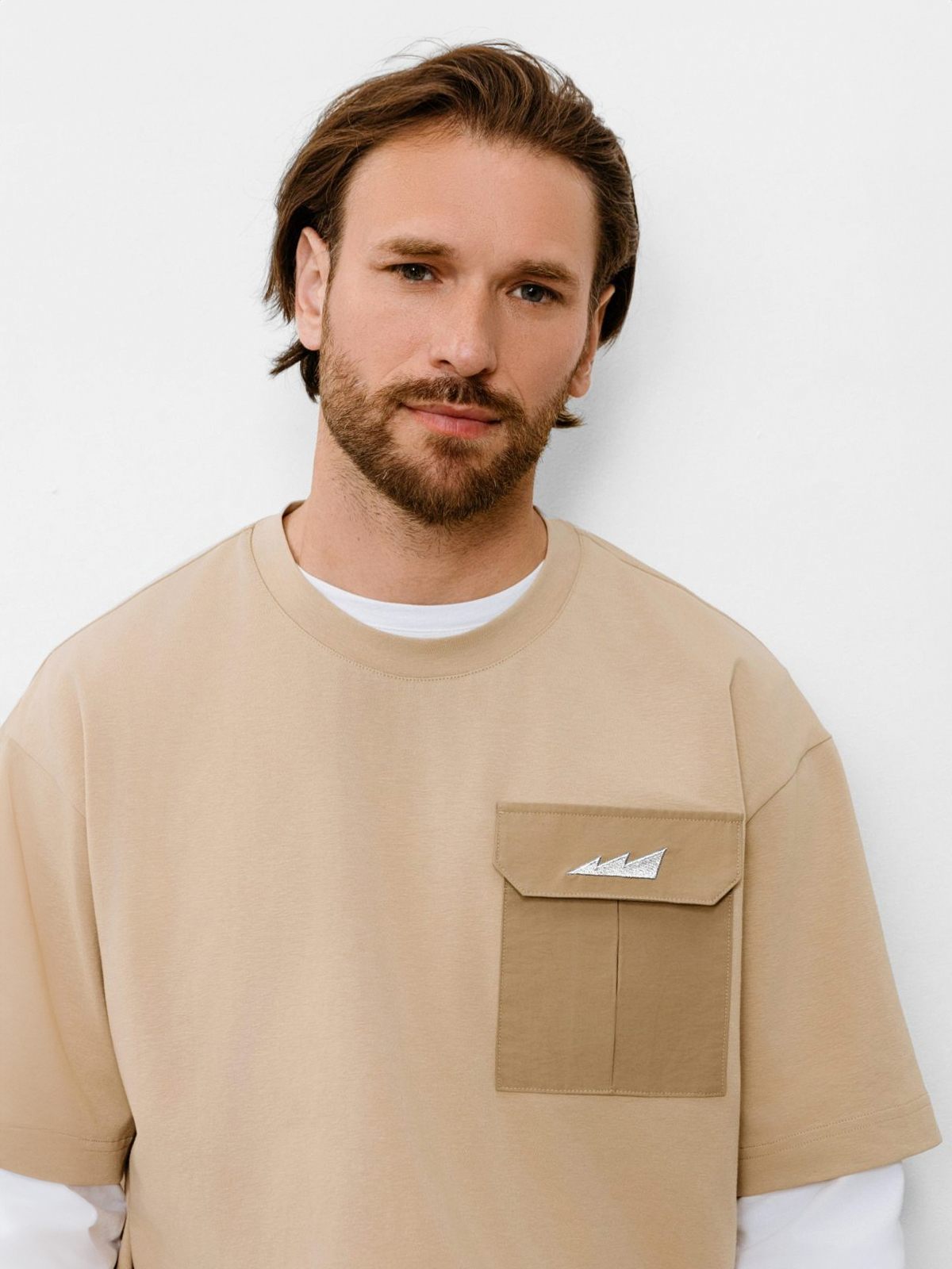 Мужская футболка oversize силуэта. Выполнена из материала, в составе которого 95% хлопка и 5% эластана, за счет чего футболка лучше держит форму. Спущенная линия плеча делает крой футболки более молодежным. Интересный акцент модели - контрастный карман-портфель на груди. Футболка представлена в универсальных бежевых и белом цветах. Создавай спортивный или повседневный образ на каждый день!