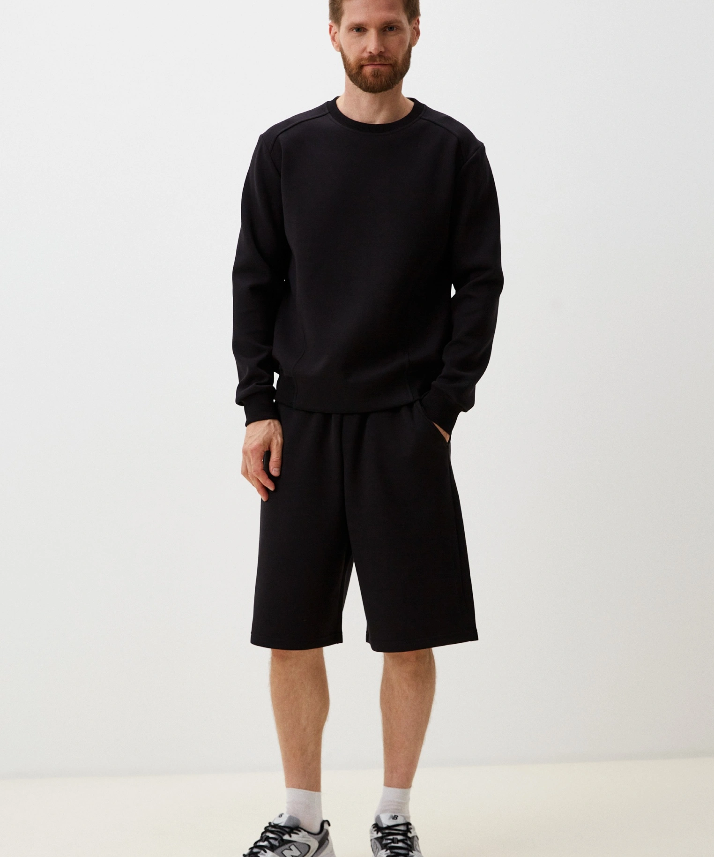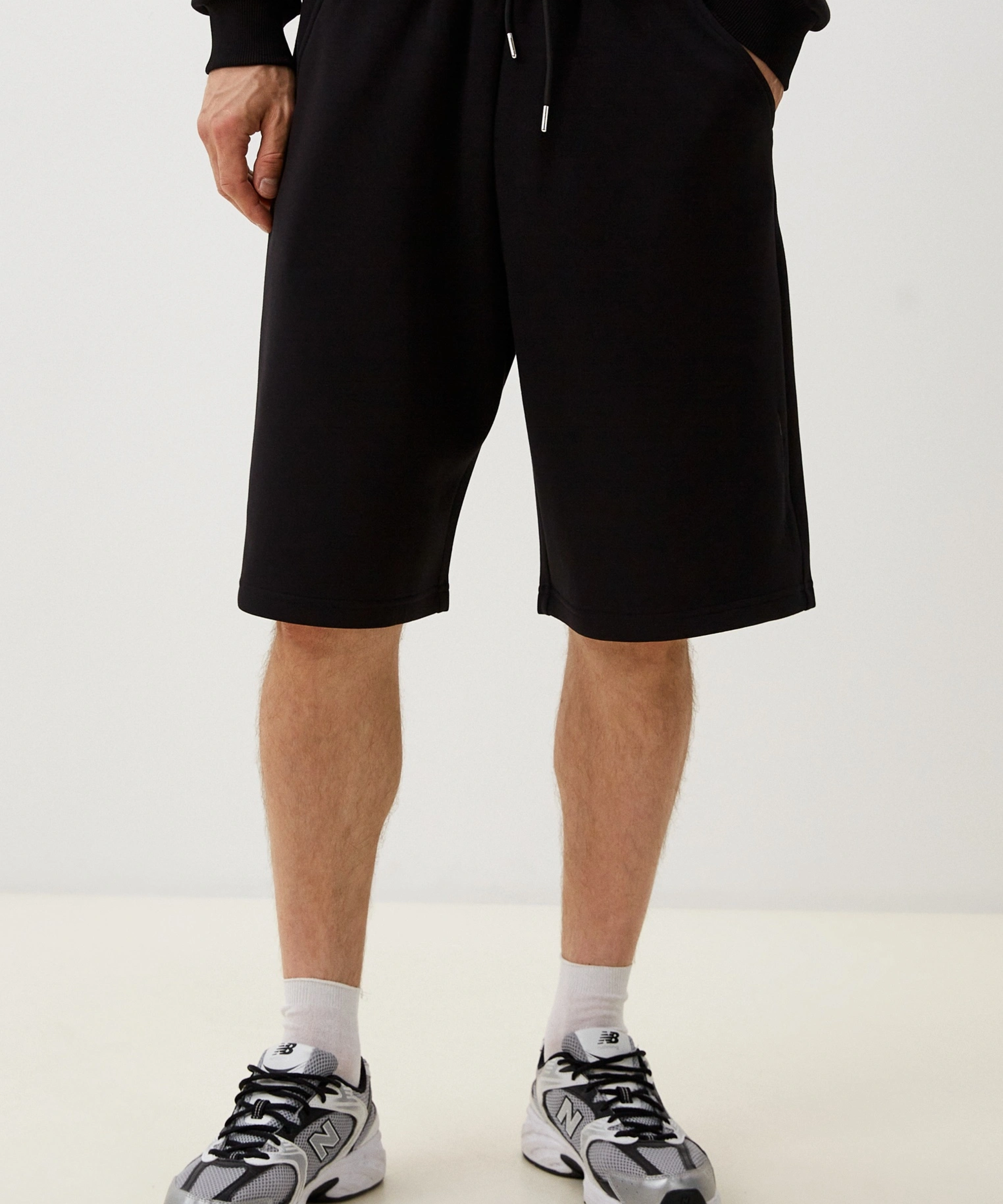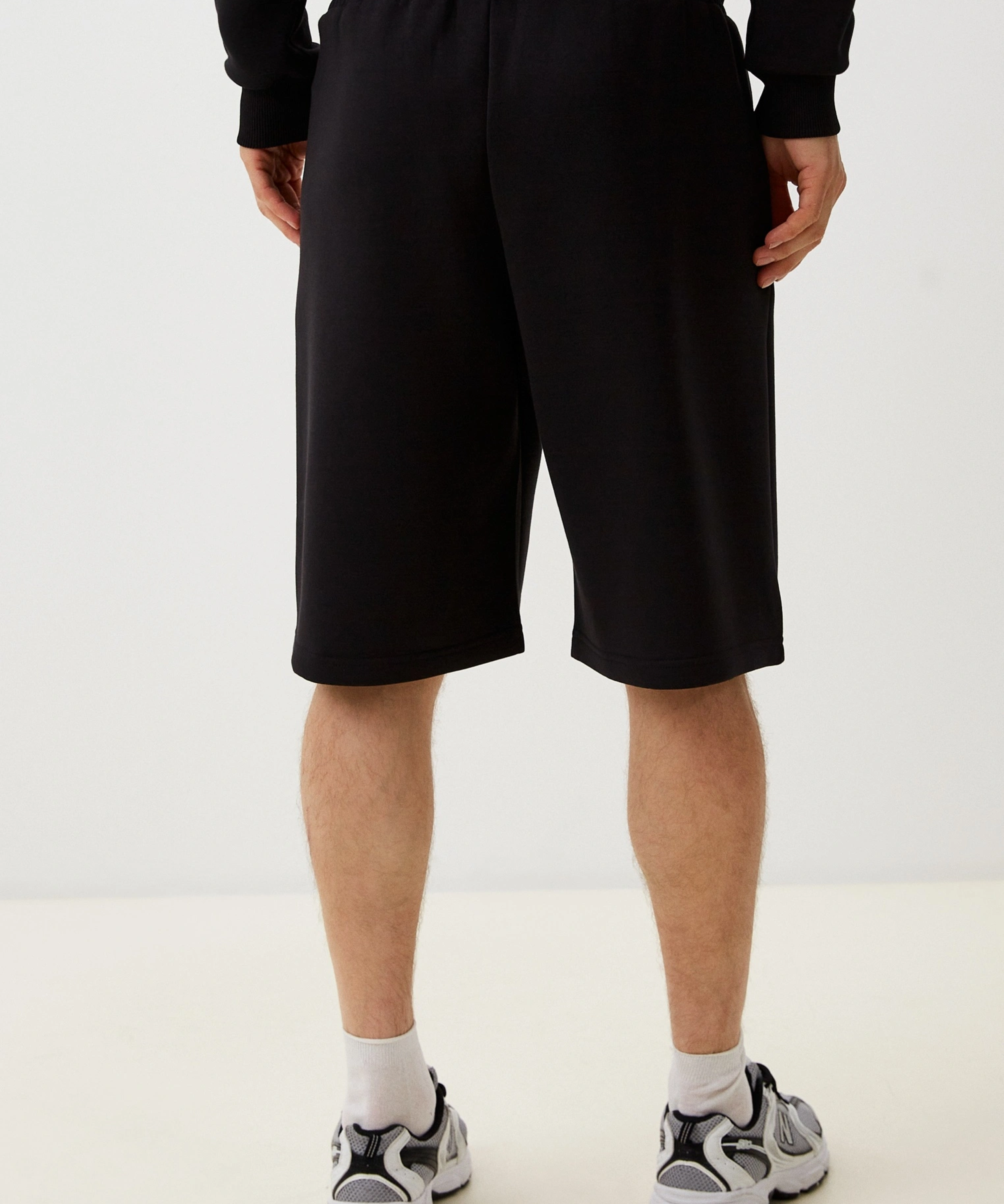 Удлиненные мужские шорты свободного кроя. Выполнены из мягкого материала - скубы, в составе которого 82% хлопка, 12% полиэстера и 6% эластана, что обеспечивает комфорт, отличную посадку и долговечность изделия. Посадка шорт - средняя, регулируемая шнуром в поясе. Шорты представлены в классическом черном цвете. Прекрасно подойдут для повседневных образов в спортивном стиле.