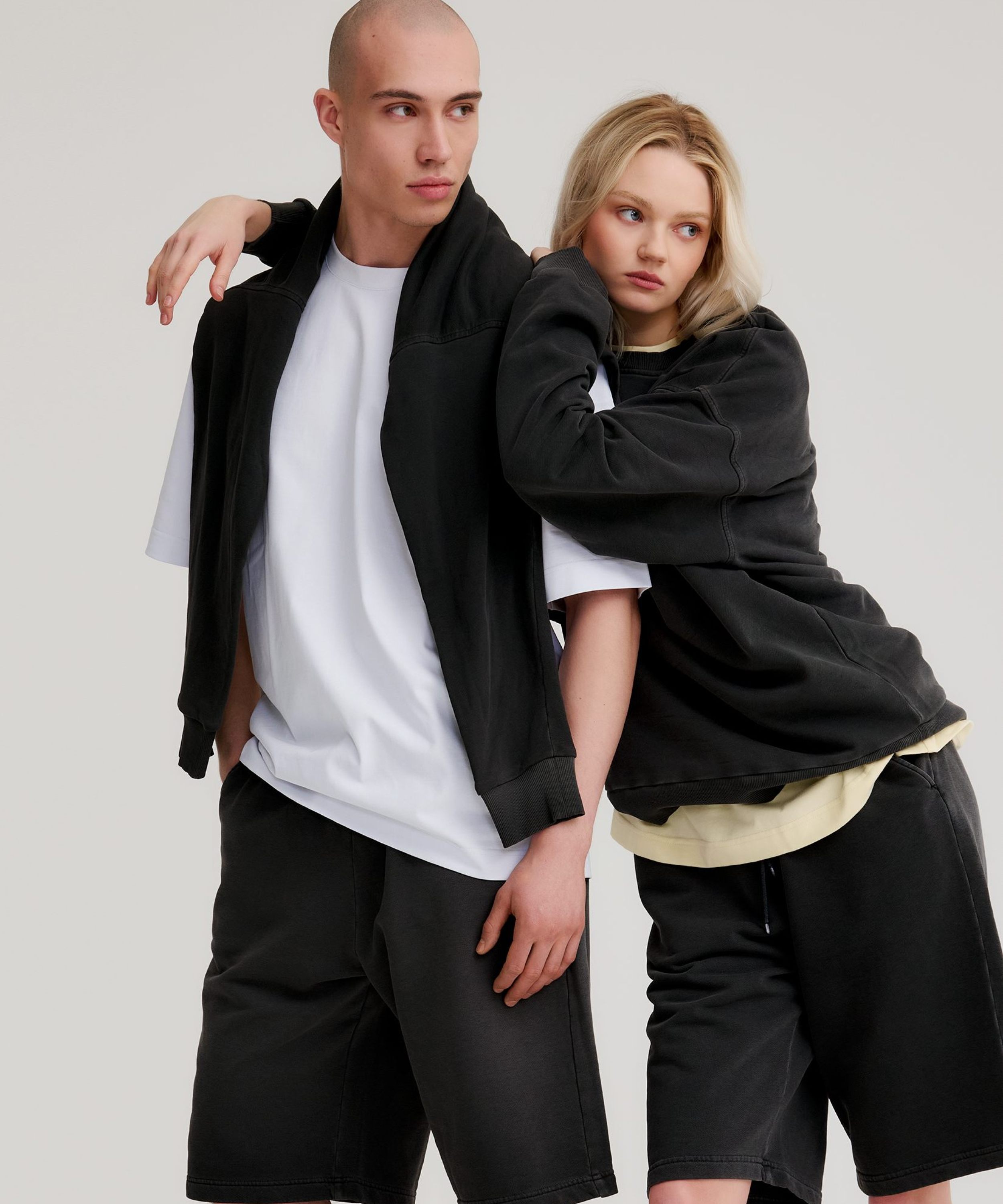 Размер на модели: на ней XS-S, на нем M-L. Параметры моделей: рост 176 см, обхват груди 77 см, талии 60 см, бедер 88 см и рост 185 см
