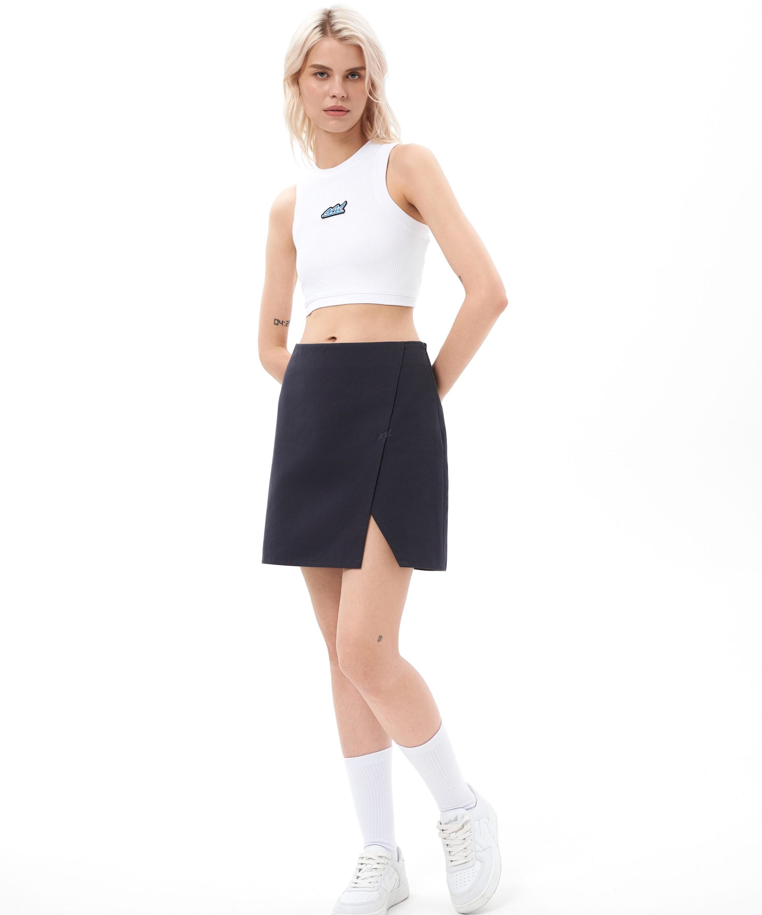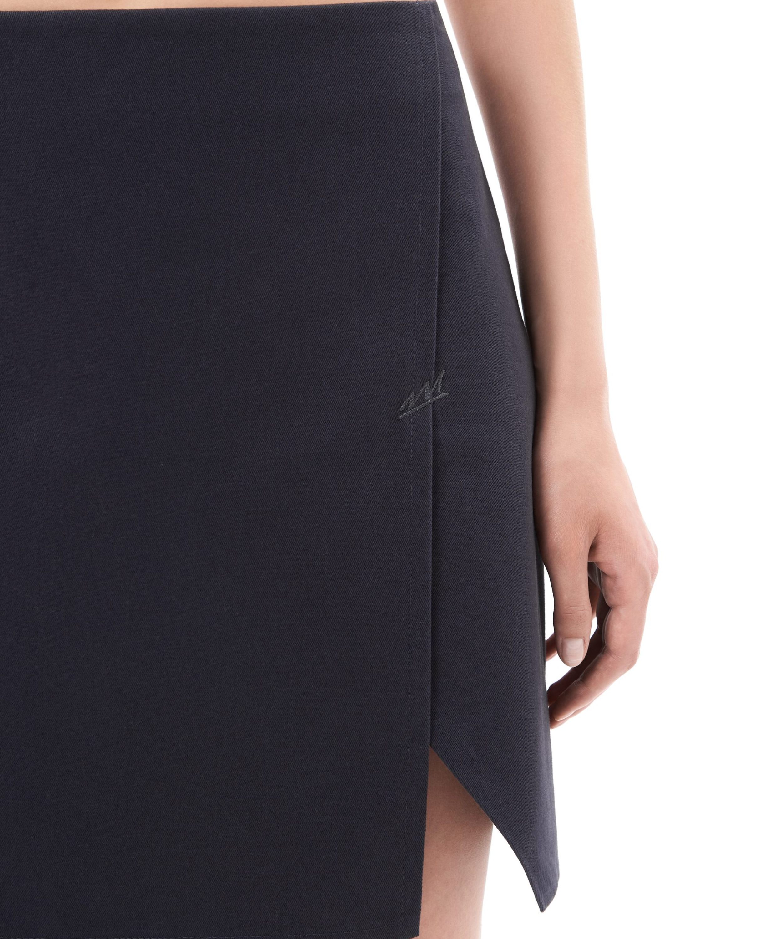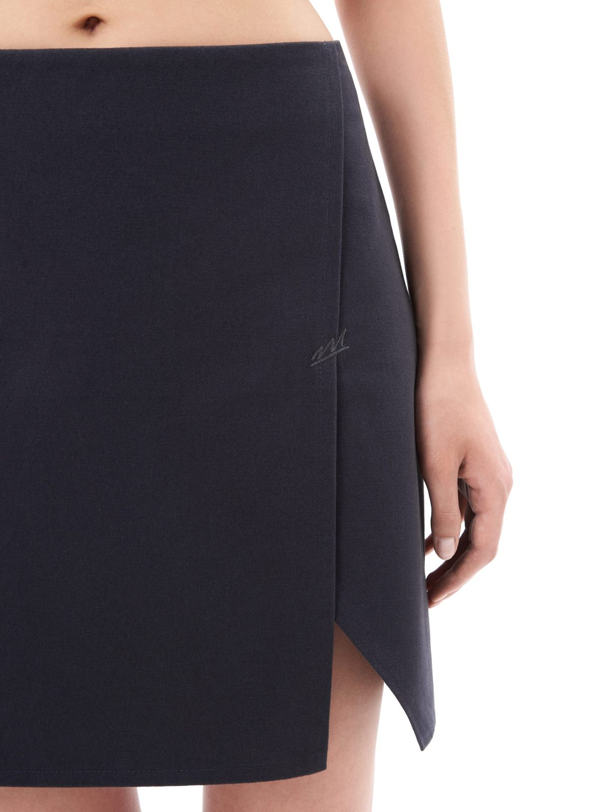Женская короткая юбка "малышка" сделана из 100% плотного хлопка - гипоаллергенного материала, отлично пропускающего воздух. Прямой облегающий крой, необычный косой разрез, прихваченный стильной тональной вышивкой-логотипом, глубокий графитовый цвет - все это поможет вам создать стильный и дерзкий образ.