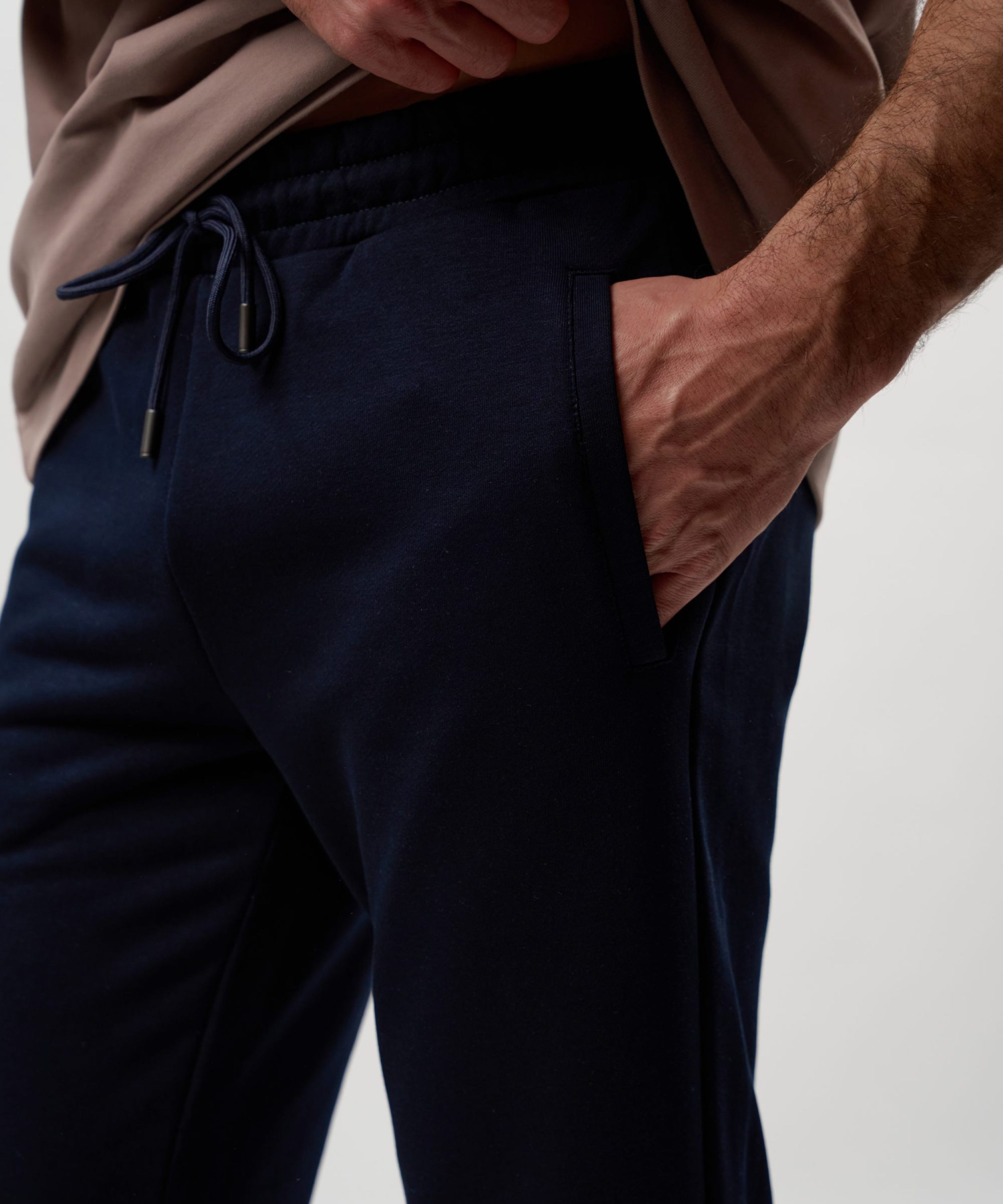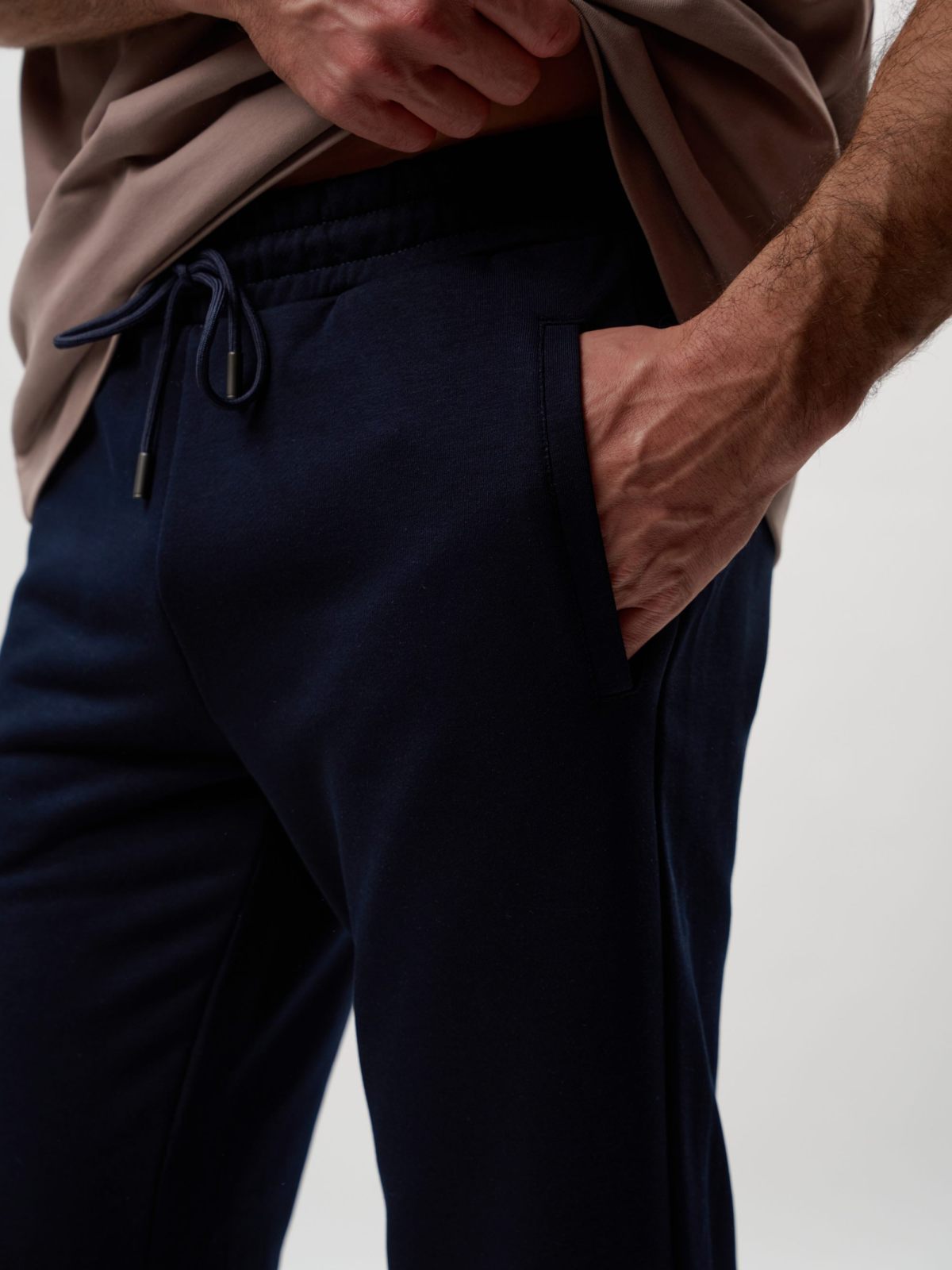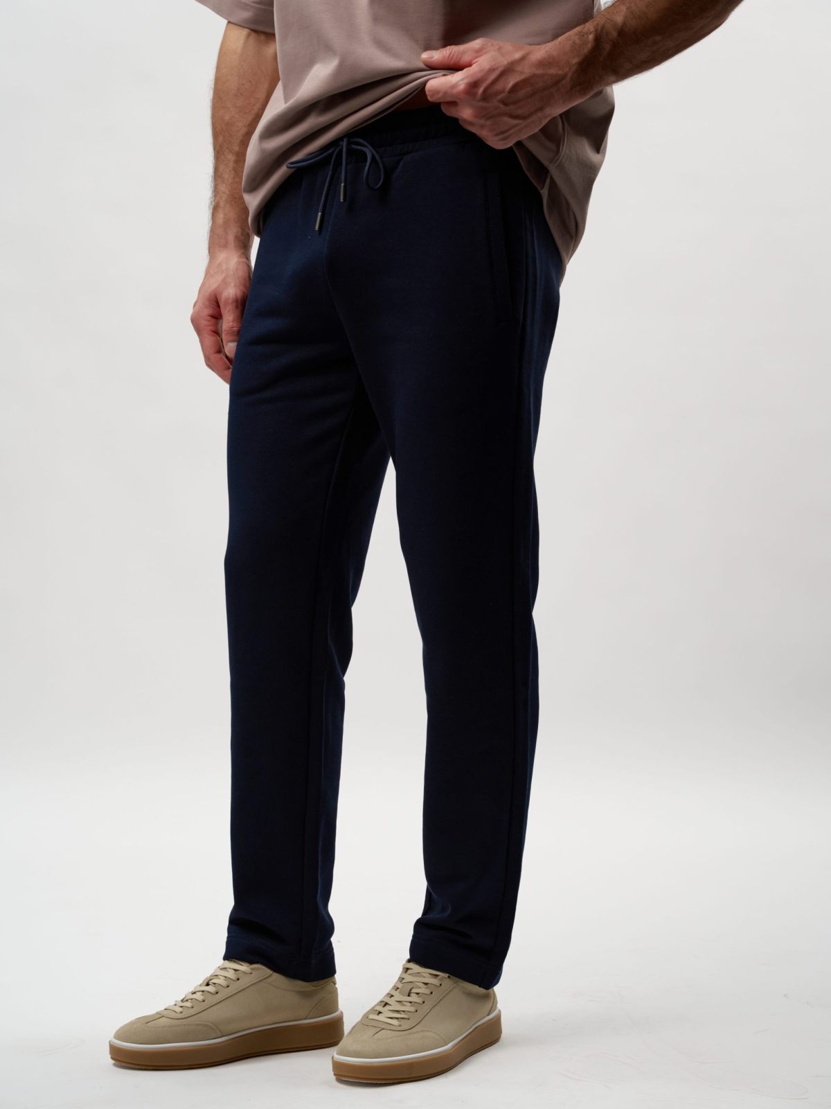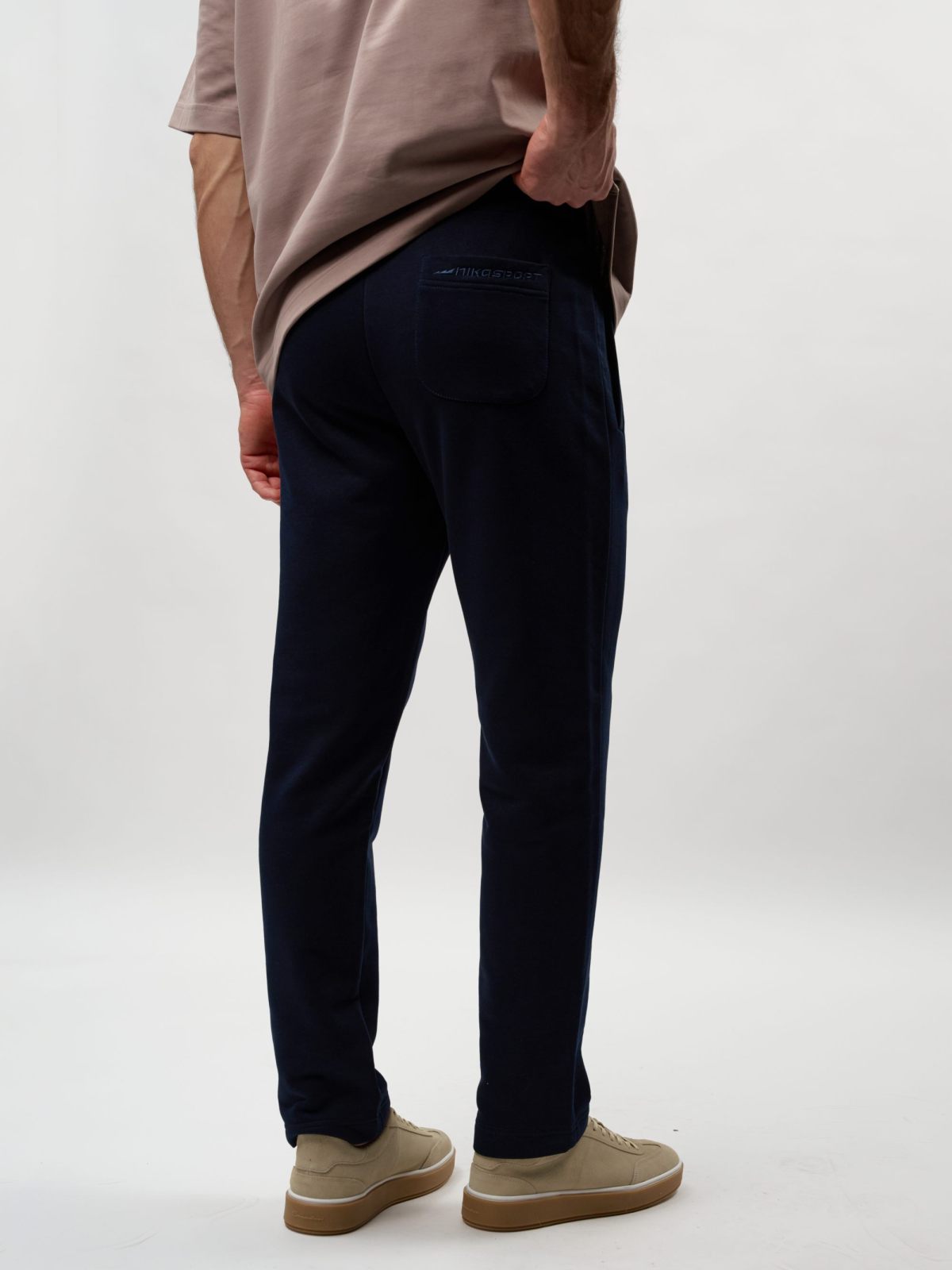 Мужские легкие спортивные брюки прямого кроя. Выполнены из материала, в составе которого 92% хлопка и 8% эластана, что обеспечивает отличную посадку и долговечность изделия. Брюки имеют два боковых кармана для хранения личных вещей, шнурок, обеспечивающий фиксацию на поясе, а также лаконичный принт с логотипом бренда на заднем кармане. Представлены в трех универсальных цветах: темно-синем, темно-сером и сером меланже. Брюки отлично подходят для повседневных образов.