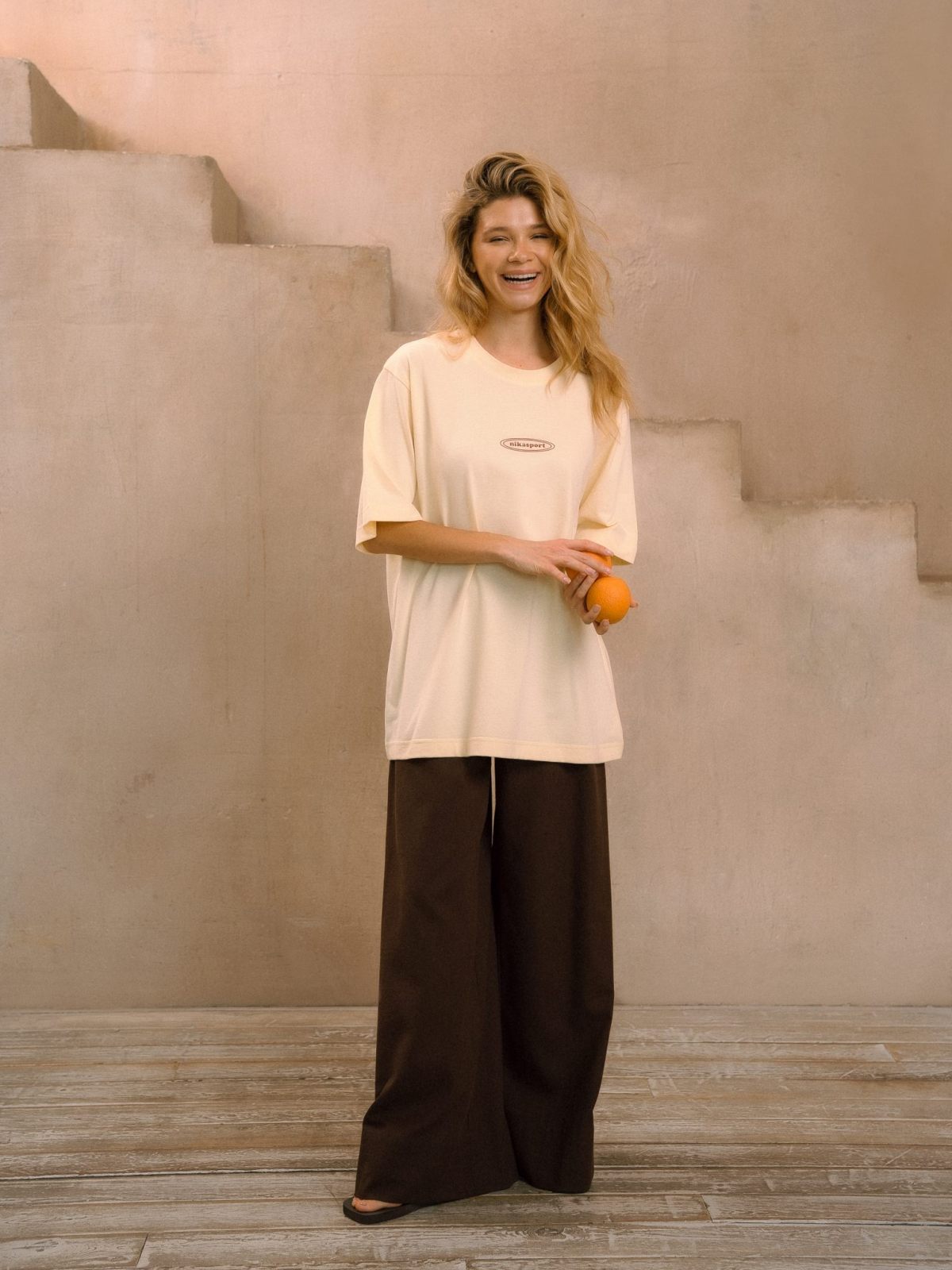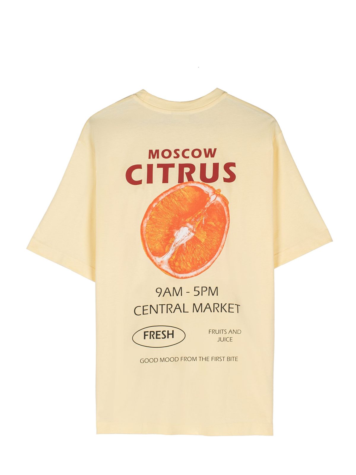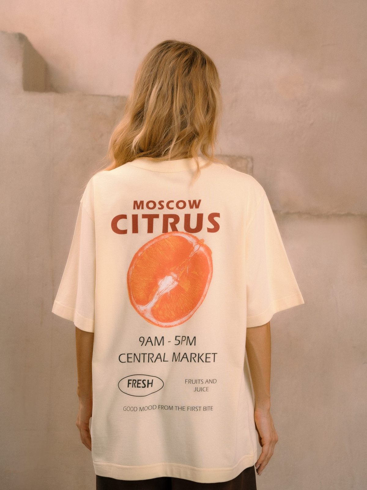 Футболка oversize силуэта из лимитированной коллекции "Фрукты". Выполнена из материала с эффектом peach, в составе которого 92% хлопка и 8% эластана, за счет чего футболка лучше держит форму и очень мягкая на ощупь. Спущенная линия плеча делает крой футболки более молодежным. Представлены в 3 цветах: классический белый, нежный голубой и ваниль, каждая с уникальным дизайнерским тематическим принтом на спине. Созданы для повседневных образов в спортивном стиле и позволяют создавать крутые комплекты с любой вещью в вашем гардеробе.