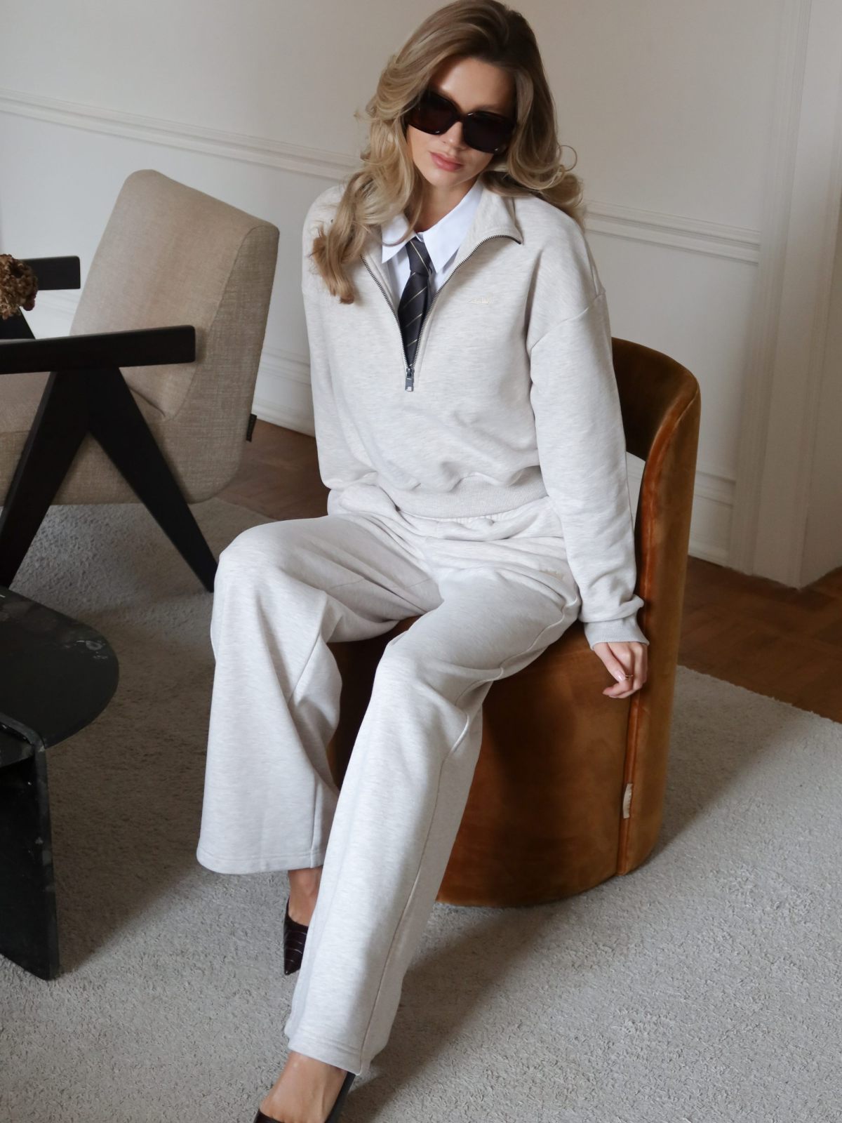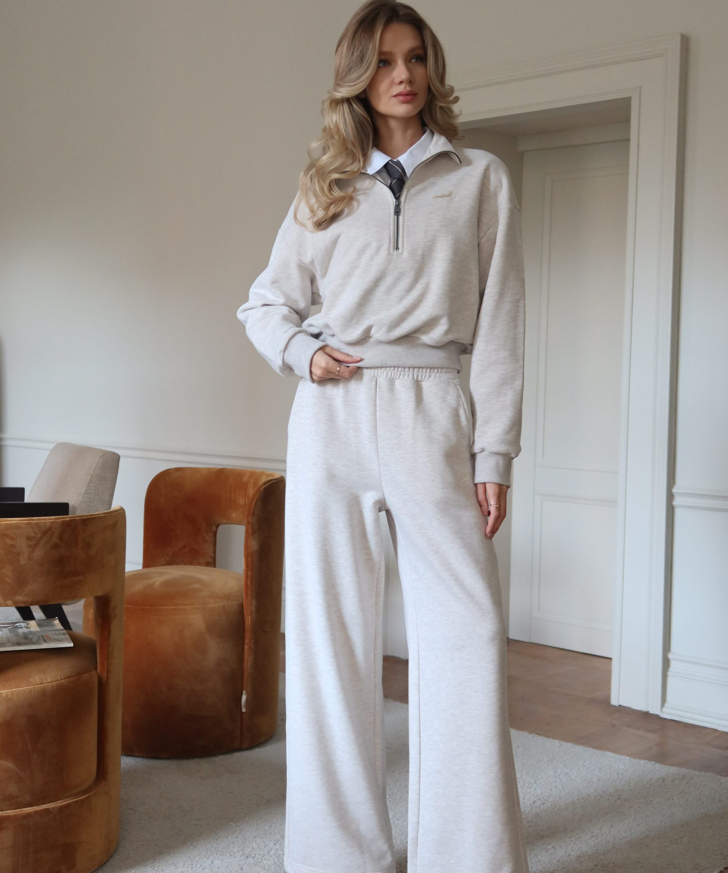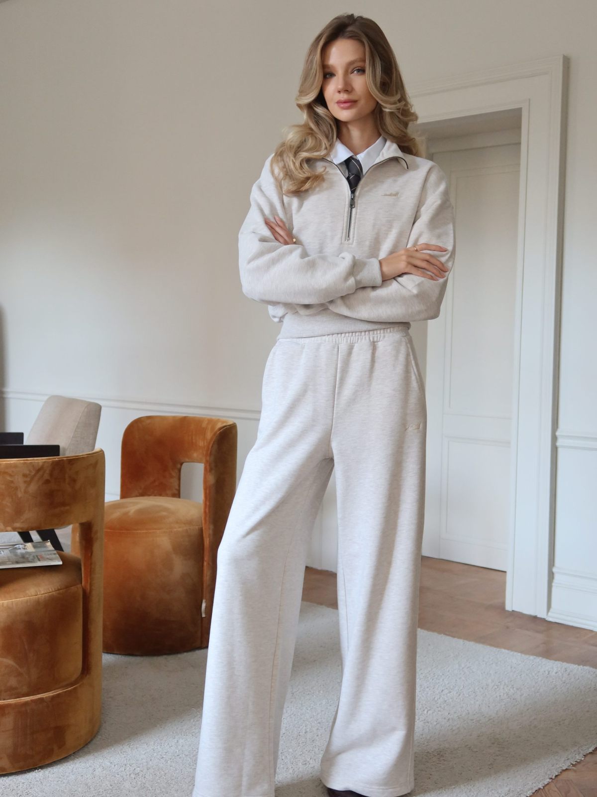 Широкие прямые женские брюки свободного силуэта выполнены из материала с эффектом peach, в состав которого входит 90% хлопка и 10% полиэстера, поэтому данная модель невероятно мягкая и приятная на ощупь. Брюки имеют два боковых кармана для хранения личных вещей, на левой ноге расположена контрастная вышивка с логотипом бренда. Эластичный шнур в поясе помогает регулировать посадку. Классический цвет бежевый меланж отлично подойдет для стильных повседневных образов.